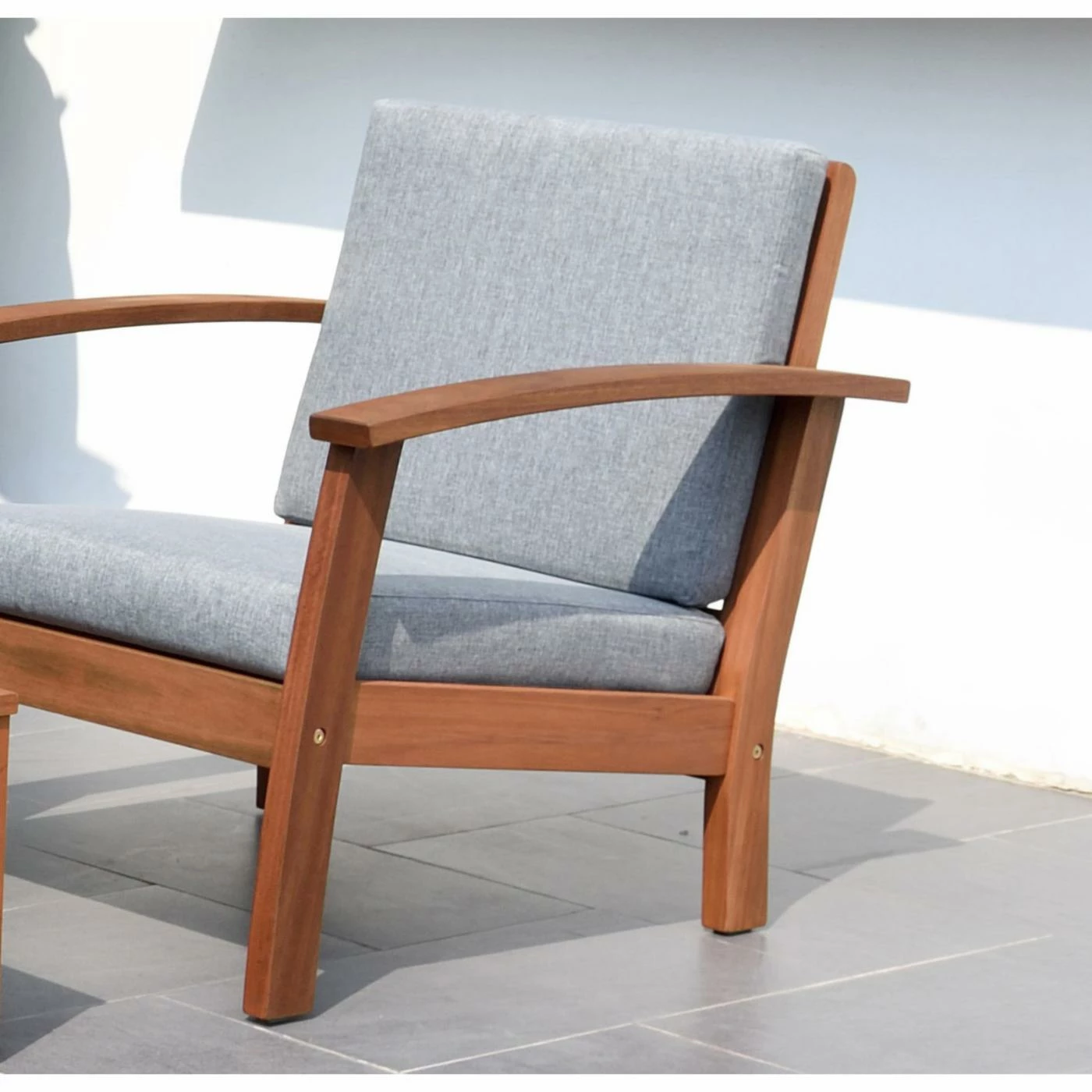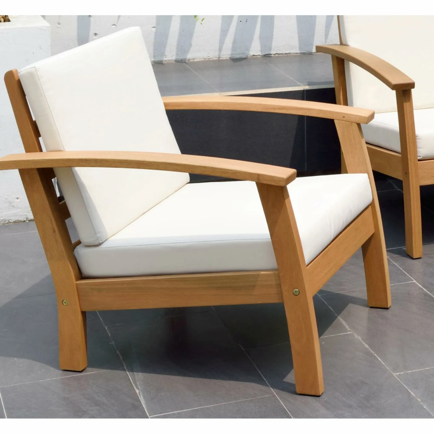 Each piece is constructed of FSC-certified eucalyptus wood in a natural teak finish. Removable seat cushions provide plenty of comfort and support for your and your guests. The seats are upholstered in UV resistant Olefin fabric.