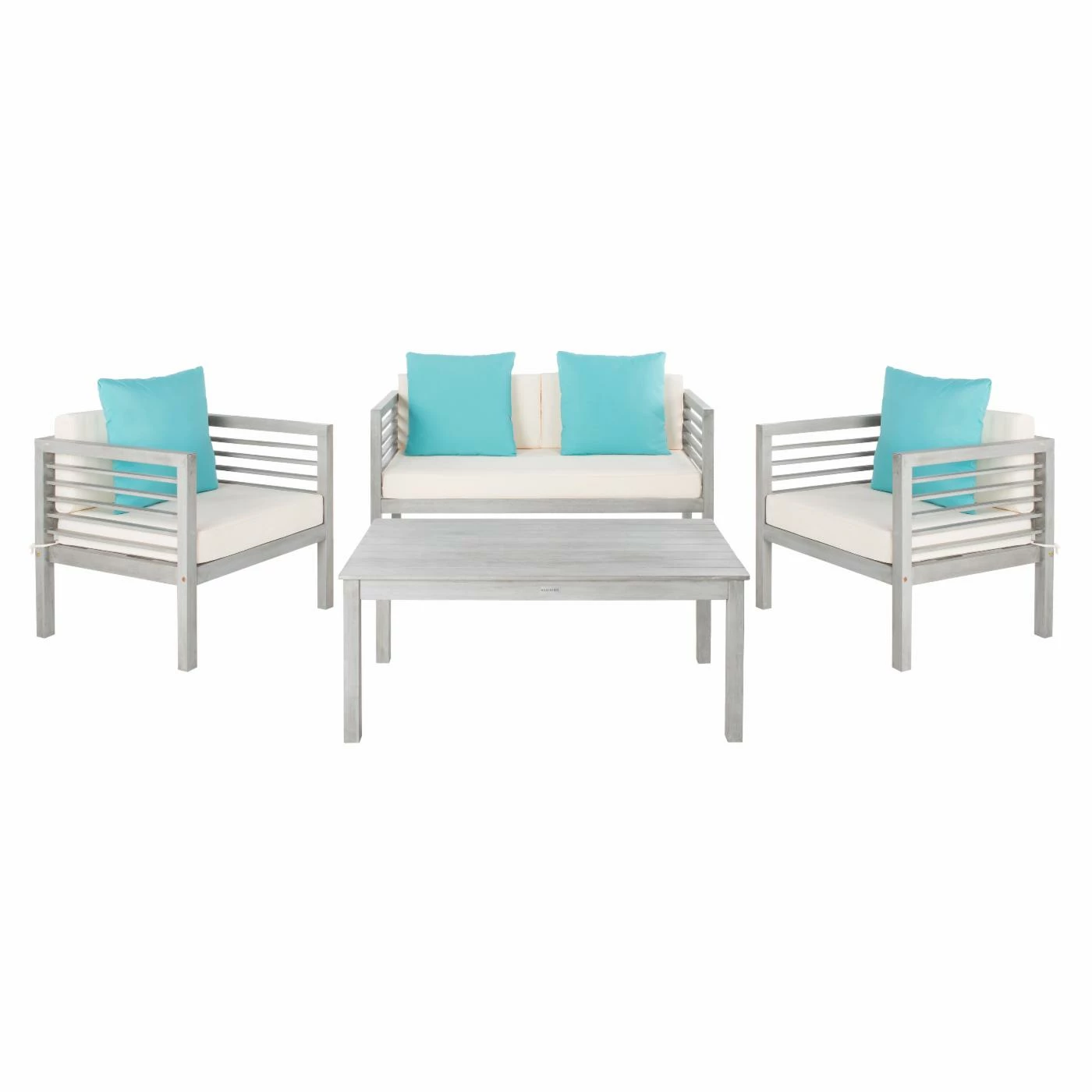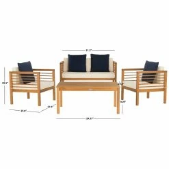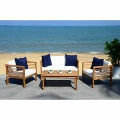 Create a relaxed place for entertaining and enjoying the outside air with the HN Outdoor Eunice Eucalyptus Wood 4-Piece Conversation Set with Accent Pillows. This conversation set is durably constructed with naturally weather-resistant eucalyptus wood in an open slatted design and topped with comfortable cushions and decorative pillows. It includes a bench, two chairs, and a coffee table.