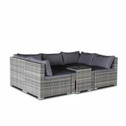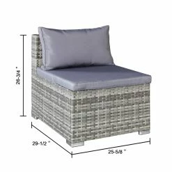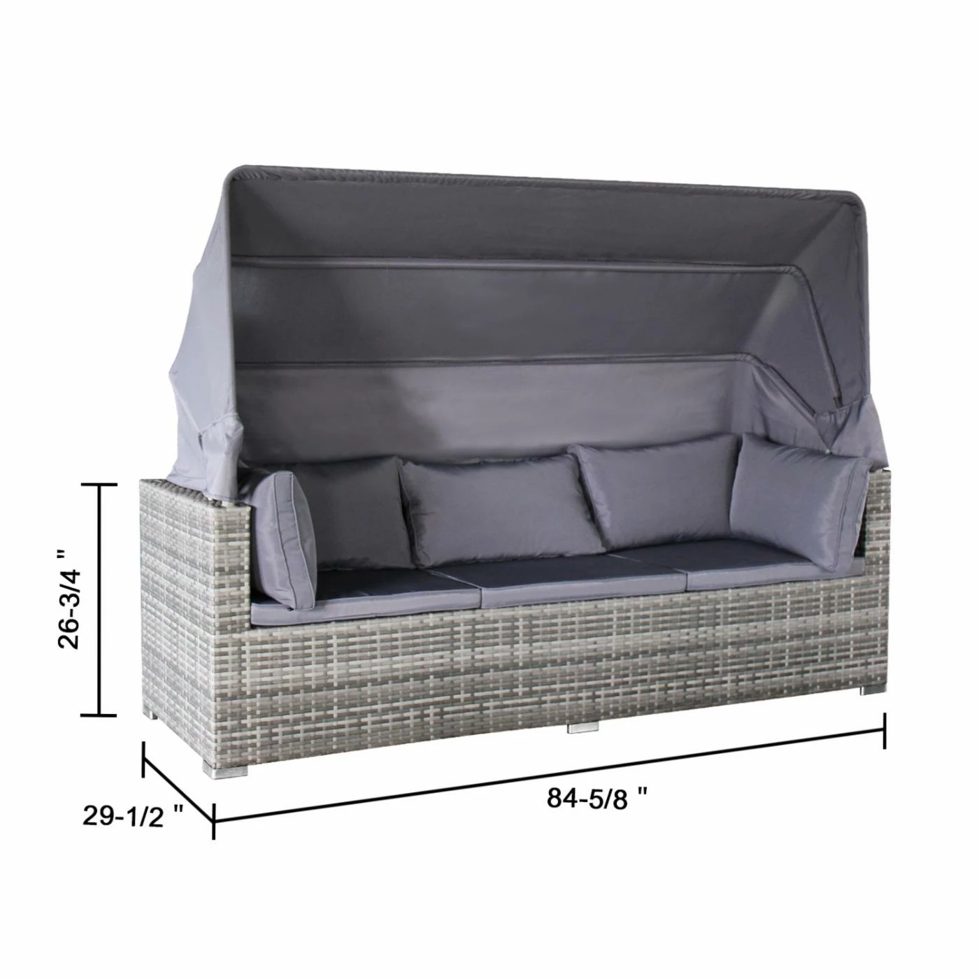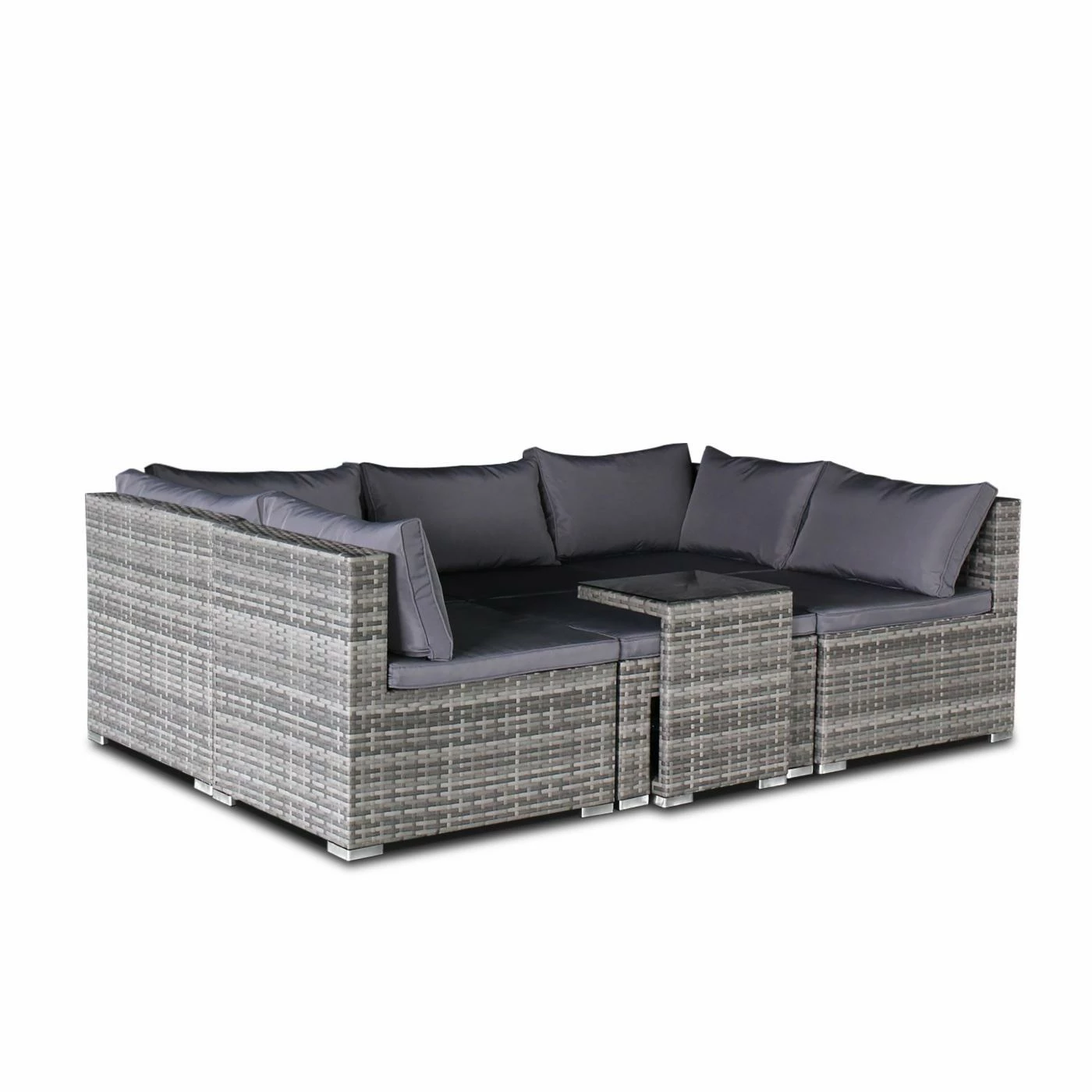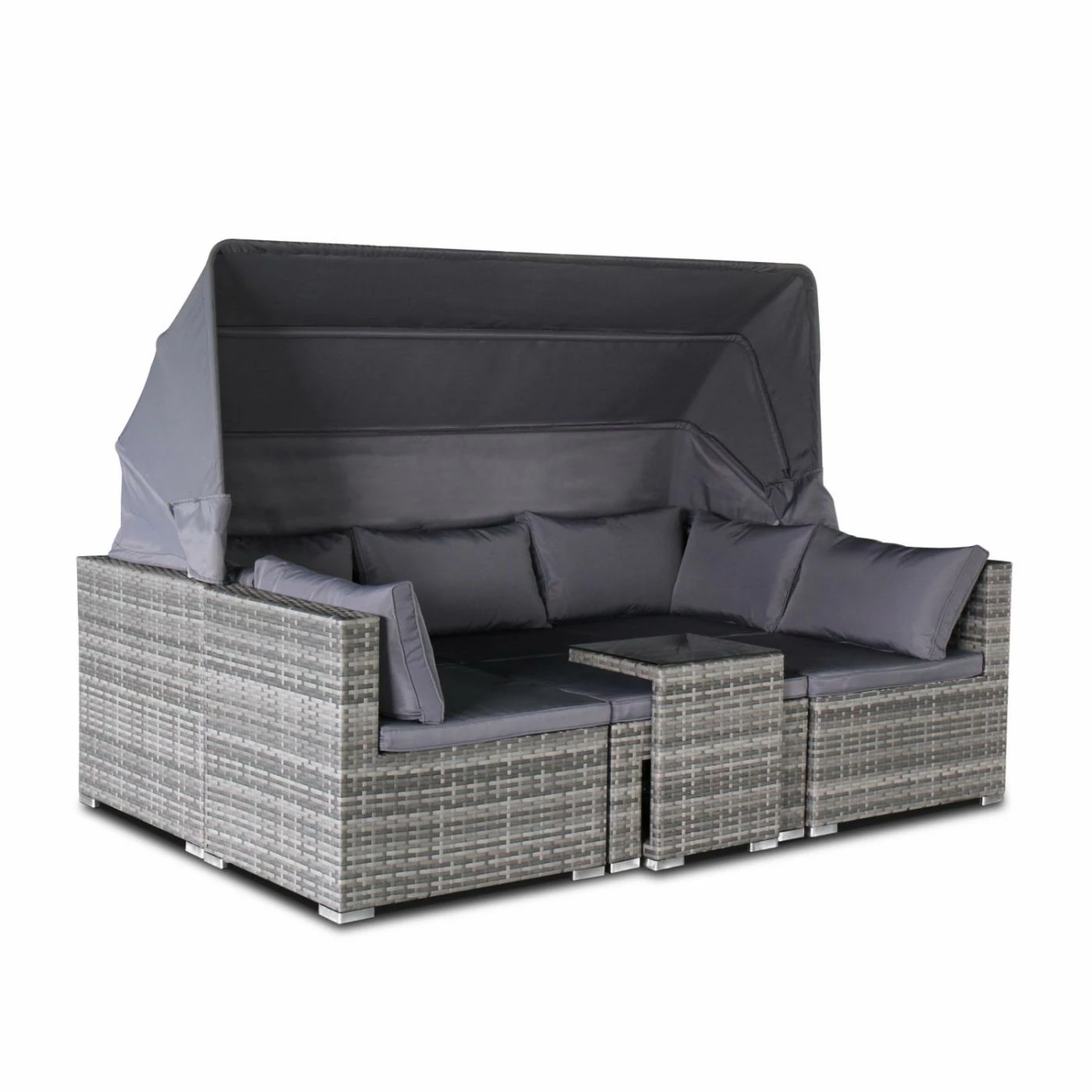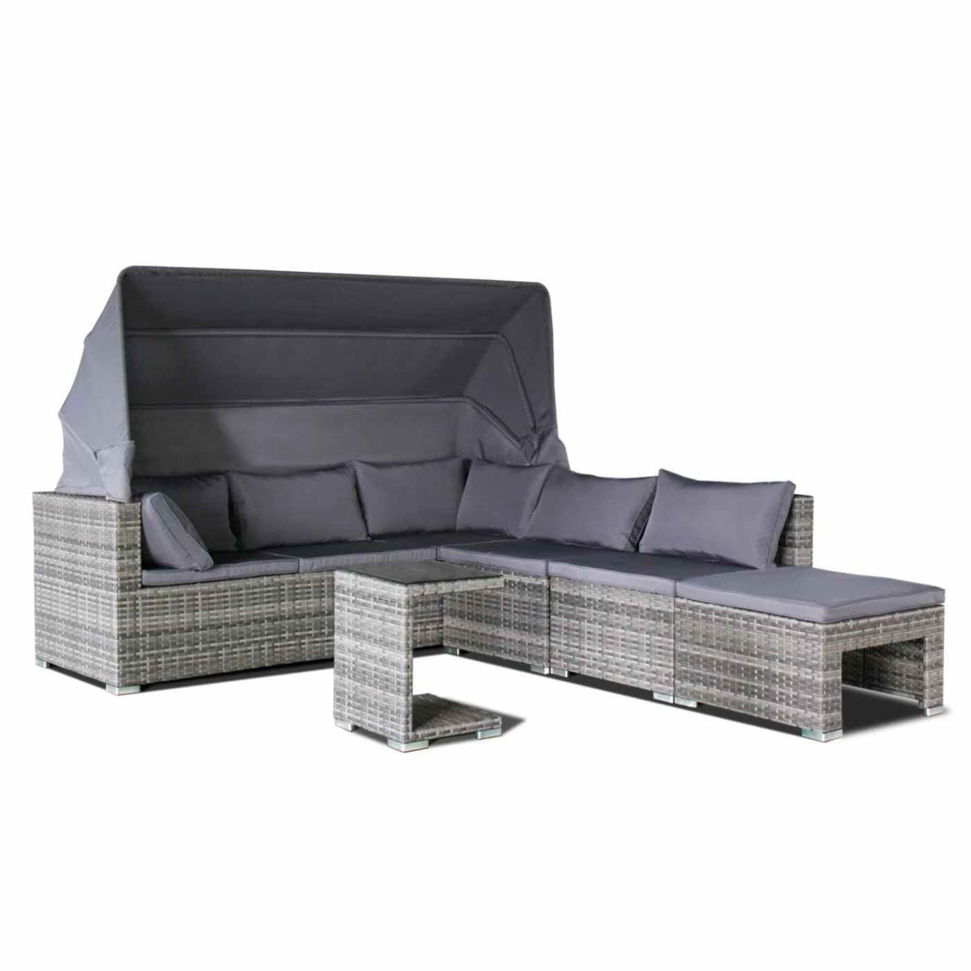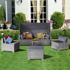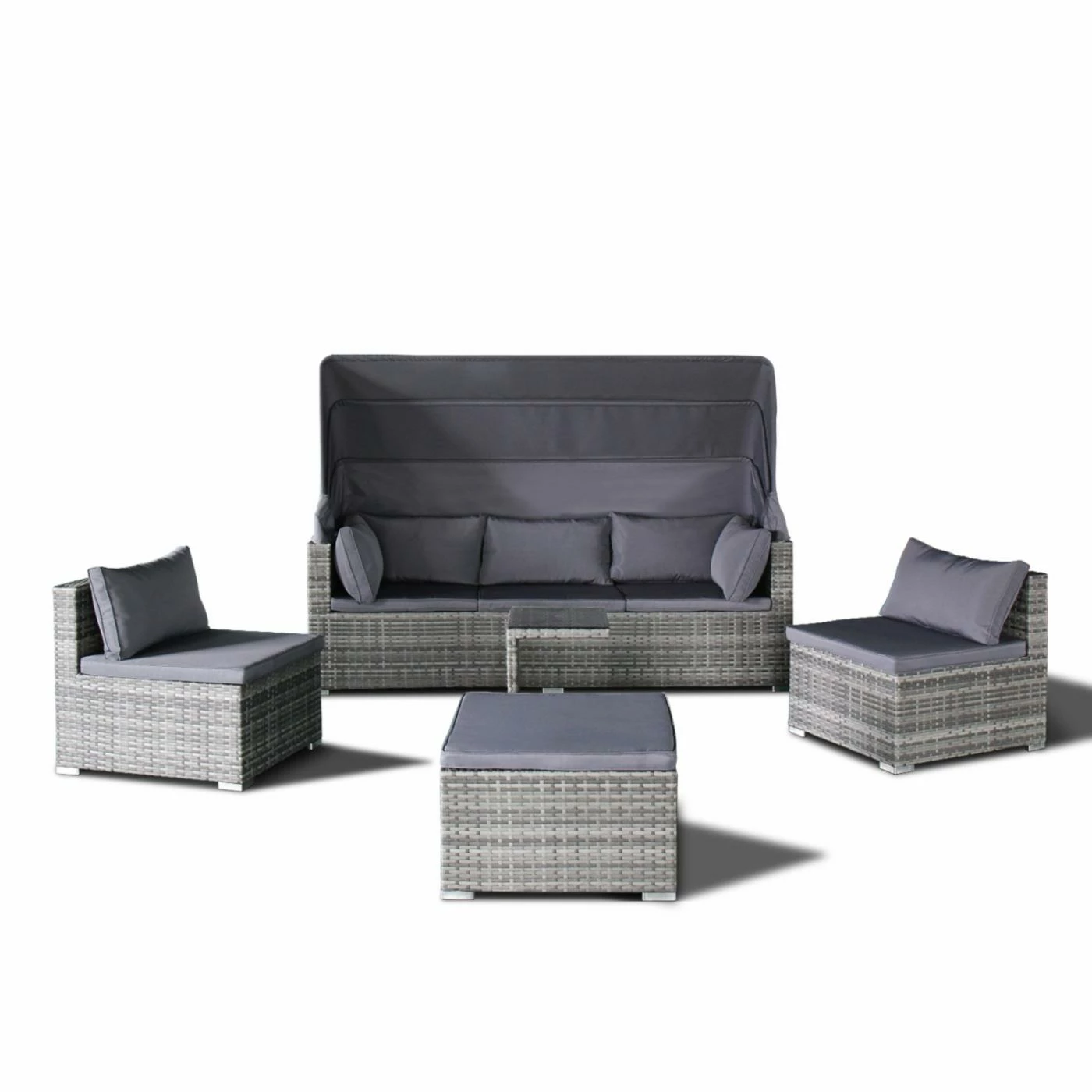 Outfit your outdoor entertaining space with the ultra-comfy and sleek Baner Garden Resin Wicker 5 Piece Pool Patio Garden Conversation Set. This set includes a roomy sofa, two armless chairs, an ottoman, and a modern side table. Plus, you can enjoy even more time in your backyard or patio with the included canopy, which easily attaches to the back of the sofa for cool shade on sunnier days. Smooth, gray cushions and plush back pillows complete this contemporary conversation set. The mildew-resitant fabric and powder-coated frames ensure endless evenings of fun with your friends and family.