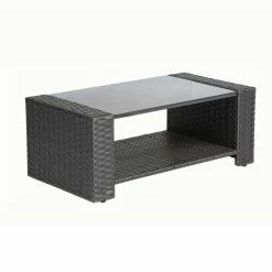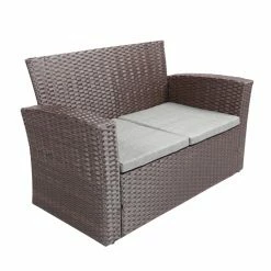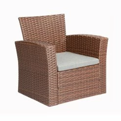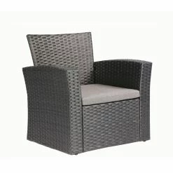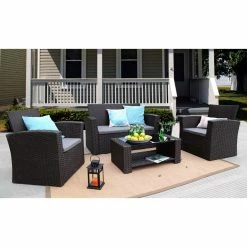 Create a low-maintenance outdoor living space with the Baner Garden Wicker 4 Piece Patio Conversation Set with Shelf Coffee Table. This set includes a loveseat, two chairs, and a coffee table with a glass top. With a powder-coated steel frame and weather-resistant resin wicker, this set is durable enough for most weather conditions. The coffee table features a shelf for additional storage, and the chairs and loveseat feature stylish, supportive armrests. Each seat includes a detachable cushion upholstered in a gray polyester blend. Choose from available wicker finishes to find the set that works best for your deck or patio.