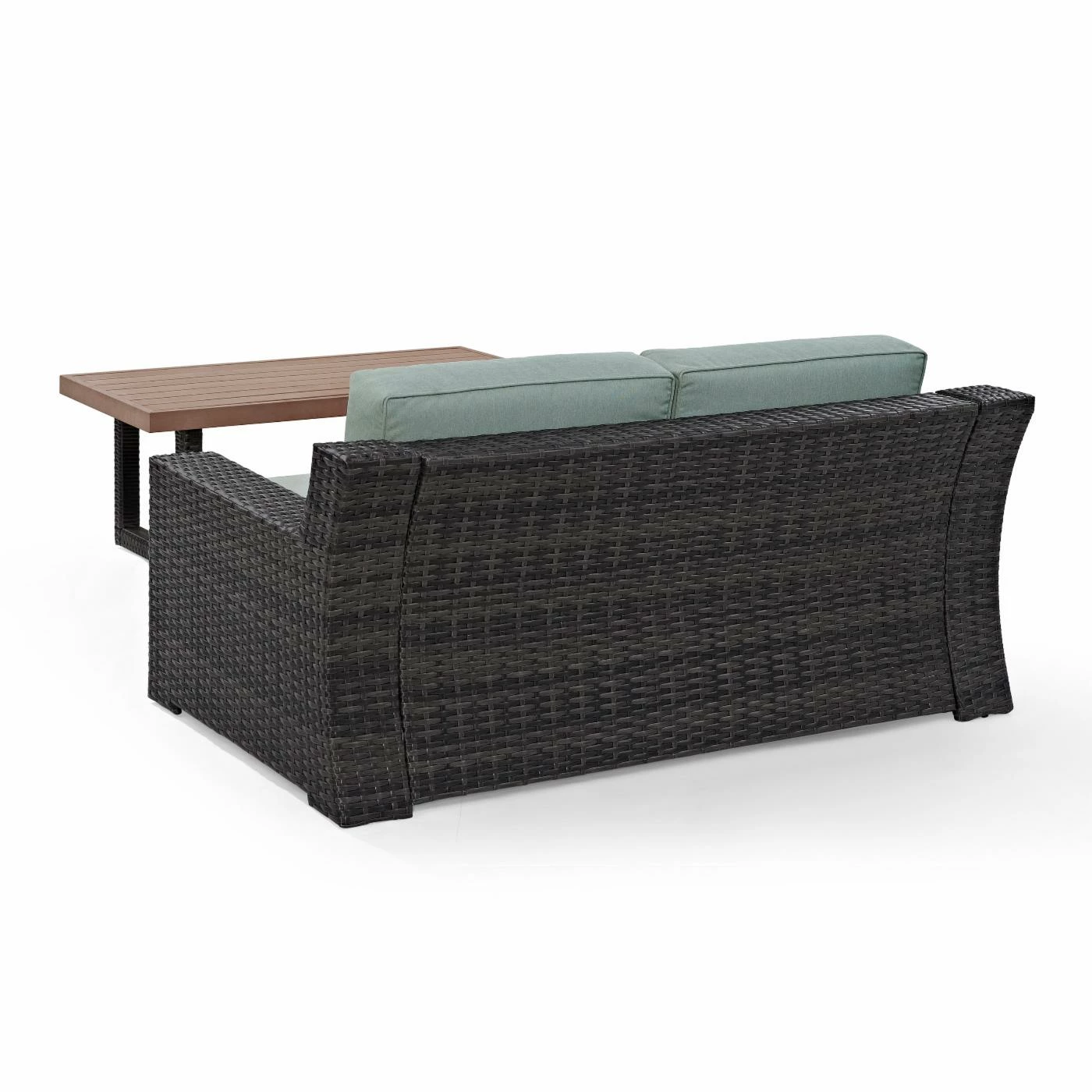The Crosley Furniture Beaufort 2 Piece Patio Wicker Seating Set with Cushions is going to be the foundation of your contemporary outdoor space. The body of each piece starts with a frame of powder-coated steel covered with an exterior of resin wicker. The resin wicker has a mottled, brown tone that give it the look of natural wicker, but this synthetic material is perfectly suited for a life outdoors. This material is resistant to rot and weathering, much like the synthetic lumber that makes up the slat-top of the table. The loveseat features a wide seat that’s appointed with foam-filled cushions covered with all-weather polyester fabric in a blue-green shade known as mist.