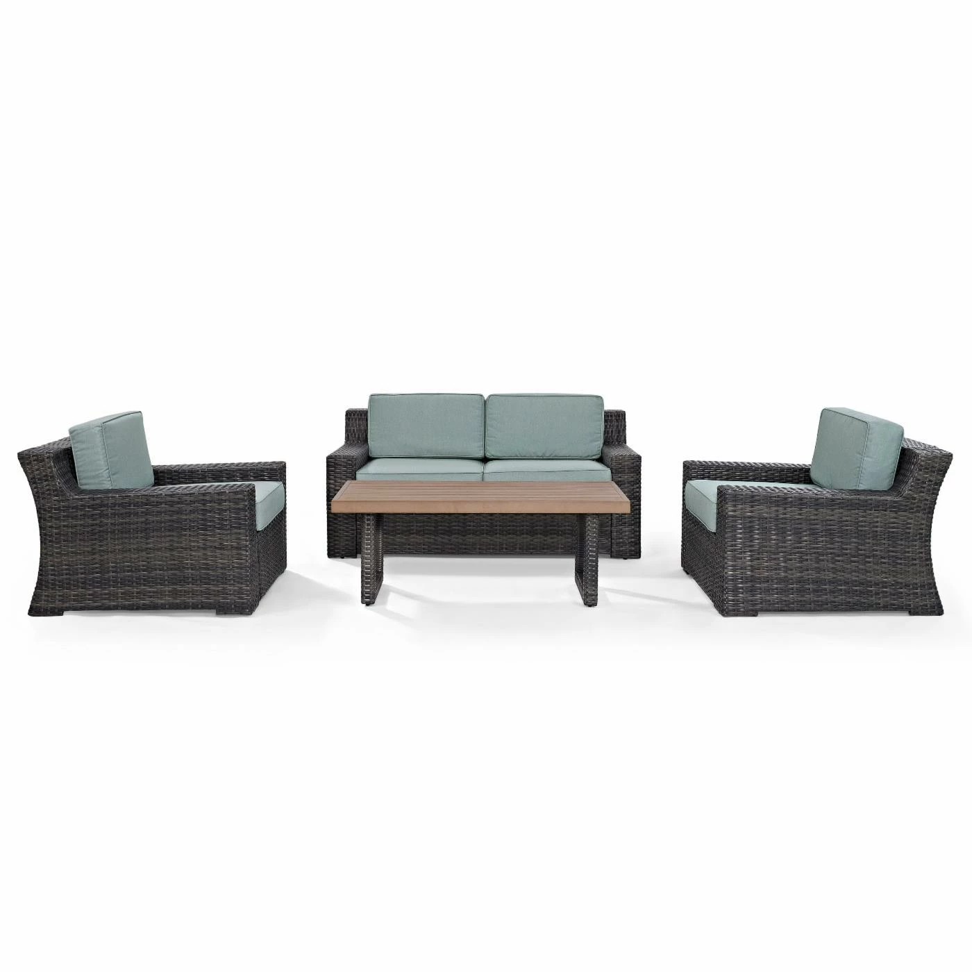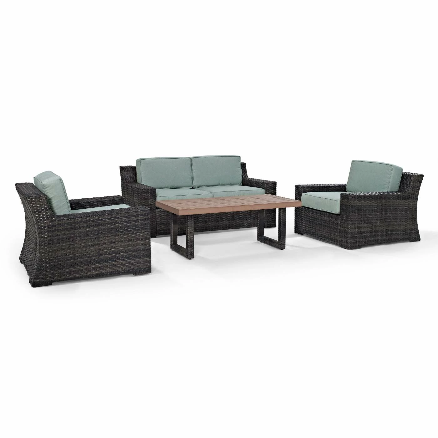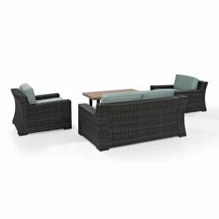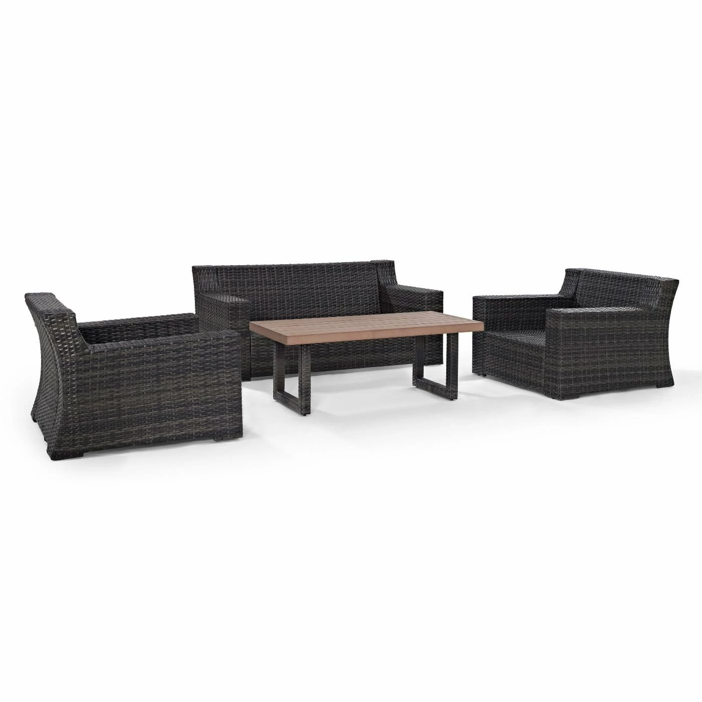 The Crosley Furniture Beaufort 4 Piece Patio Wicker Seating Set with Cushions is going to take your outdoor space from zero to fab with just the click of a mouse. This set includes a pair of club chairs with a matching loveseat and a low coffee table. Each piece in this set starts with a frame of powder-coated steel under an exterior of hand-woven resin wicker. Resin wicker may look and feel like traditional wicker, but it’s got a synthetic composition that makes it naturally resistant to moisture, rotting, and insects. The chairs and loveseats offer wide seating with the modern touch of thick, flat arms and a matching back. Each seat and backrest is padded with thick, foam-filled cushions under a high-quality polyester fabric. The coffee table is topped with synthetic wood over an open, minimalist-inspired frame that shows off the same resin wicker exterior.
