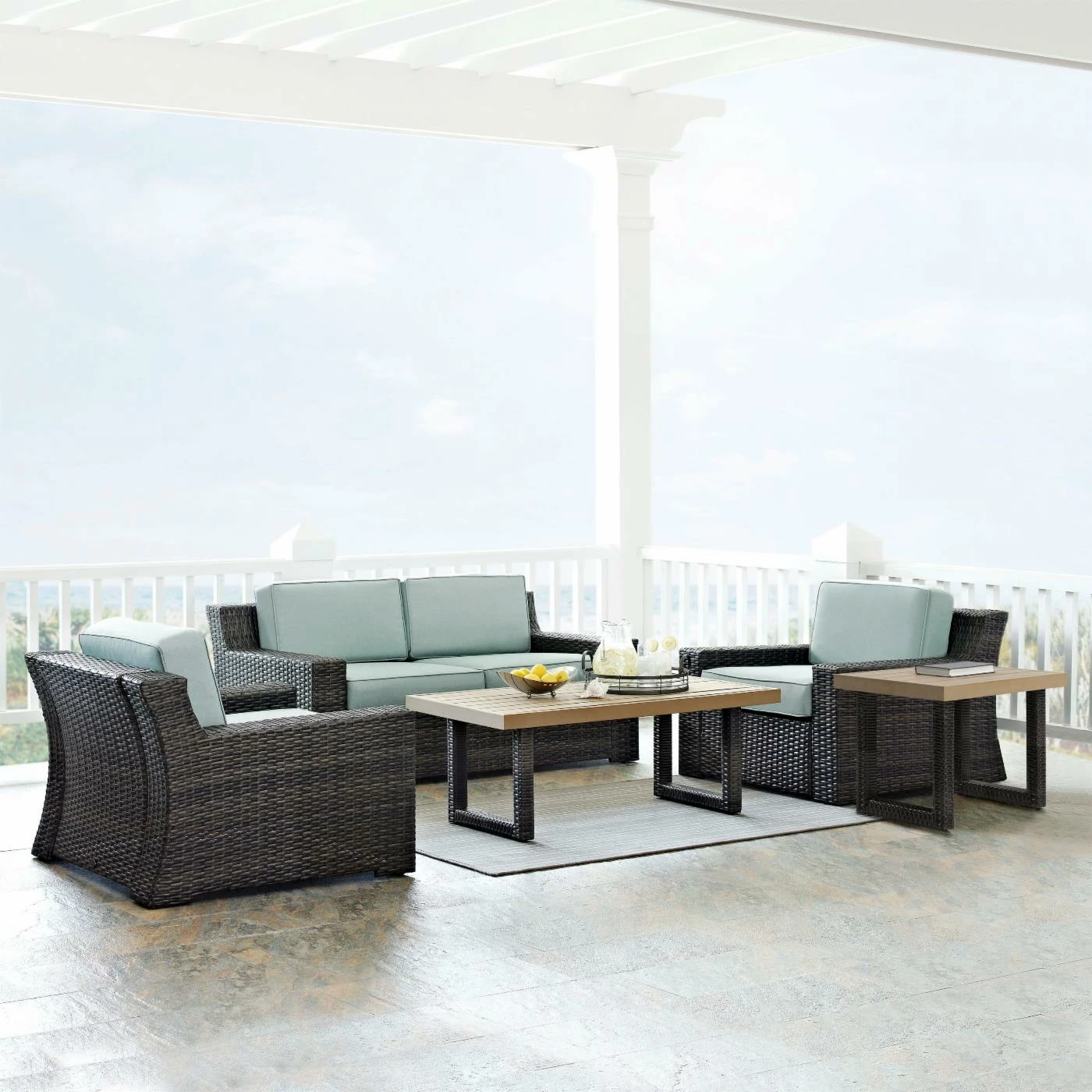 The Crosley Furniture Beaufort 5 Piece Wicker Patio Conversation Set is going to take your patio or poolside from average to indulgent with just the click of a mouse. This set includes a pair of chairs, a loveseat, a coffee table, and a matching side table. The look of this set is defined by the texture of resin wicker and the cool blue-green shades of the all-weather cushions. A frame of powder-coated steel gives each piece it’s distinctive shape, and an exterior of hand-woven resin wicker adds the chic surface. This resin wicker may have a mottled brown tone that makes it look like traditional wicker, but its synthetic composition offers superior resistance to rot, weathering, and cracking. Both chairs are appointed with thick, foam-filled cushions under high-quality polyester fabric. The coffee table and side table are topped with a thick, slat-style surface made from synthetic lumber. The open-frame legs are made from steel with the same resin wicker that gives this set its bold appearance.