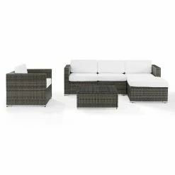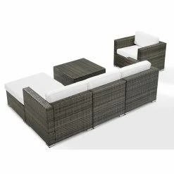 Youβll love entertaining outdoors with the Crosley Sea Island Wicker 6 Piece Sectional Patio Conversation Set. Perfect for lounging with a good book or spending time with friends, this conversation set is able to seat six and features a modular design for multiple configurations. Made to last, the durable aluminum frame is wrapped in weather-resistant wicker with a gray, variegated color weave to complement any decor. Its plush, cream-colored cushions arenβt only comfortable, but add an elegant air youβll love. The coffee table, which completes the set, has a tempered glass top which makes it as practical as it is beautiful.