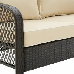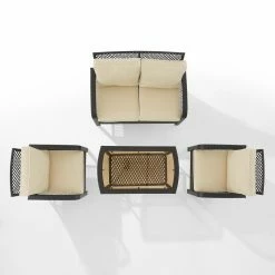 Made of weather-resistant materials, the Crosley Tribeca Wicker 4 Piece Outdoor Conversation Set will hold up to long-lasting use on your patio or poolside. This set includes a loveseat, two chairs, and a coffee table. Each piece has a steel frame that’s covered with woven resin wicker in dark brown. The seats are topped with detachable, water-repellant cushions with removable covers. The coffee table features a tempered glass top and a low, open shelf for display. This four-piece set is tied together with a lattice wicker design and traditional style.