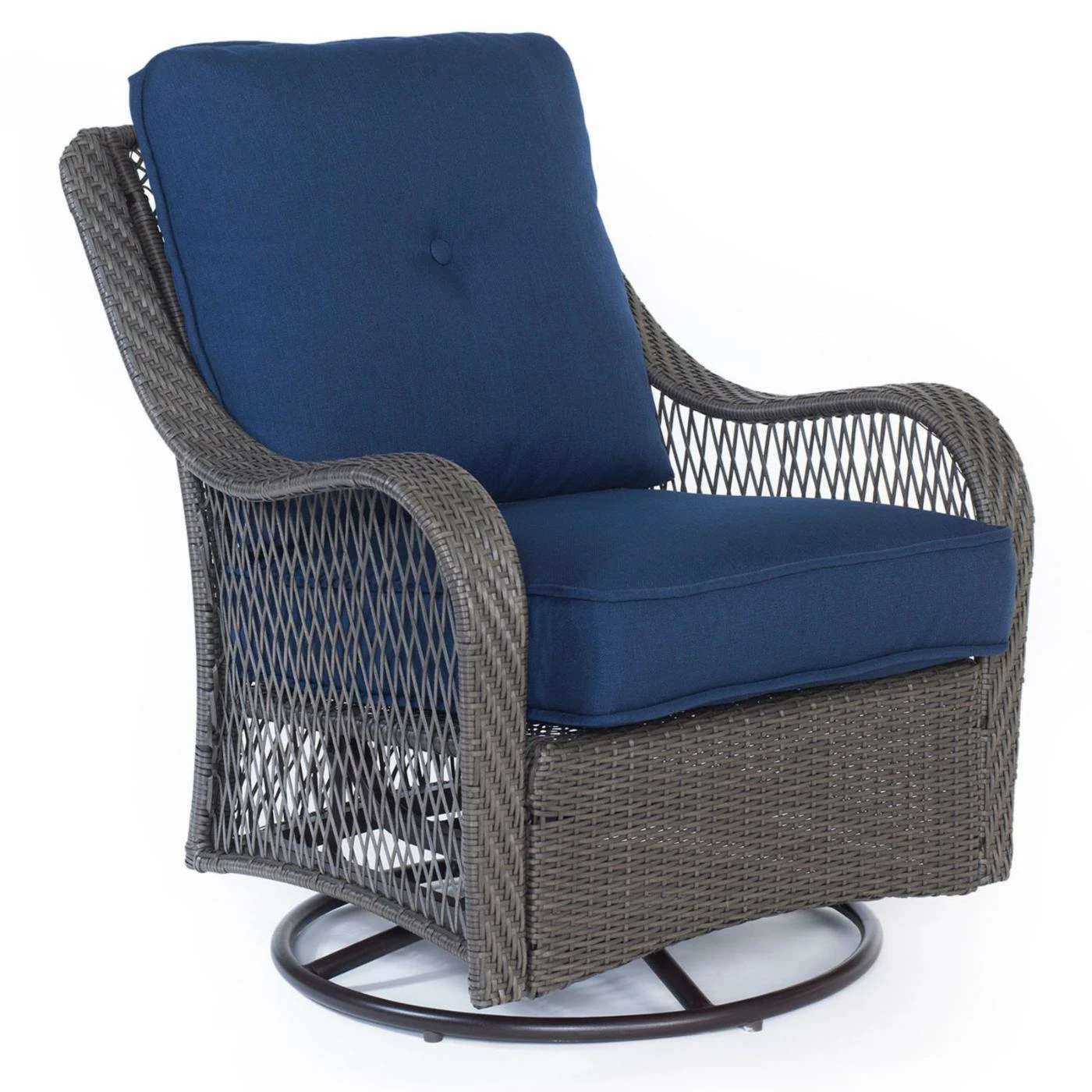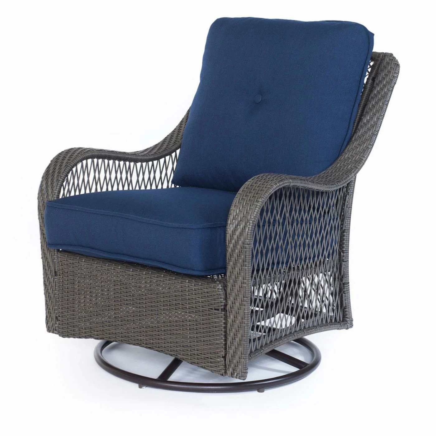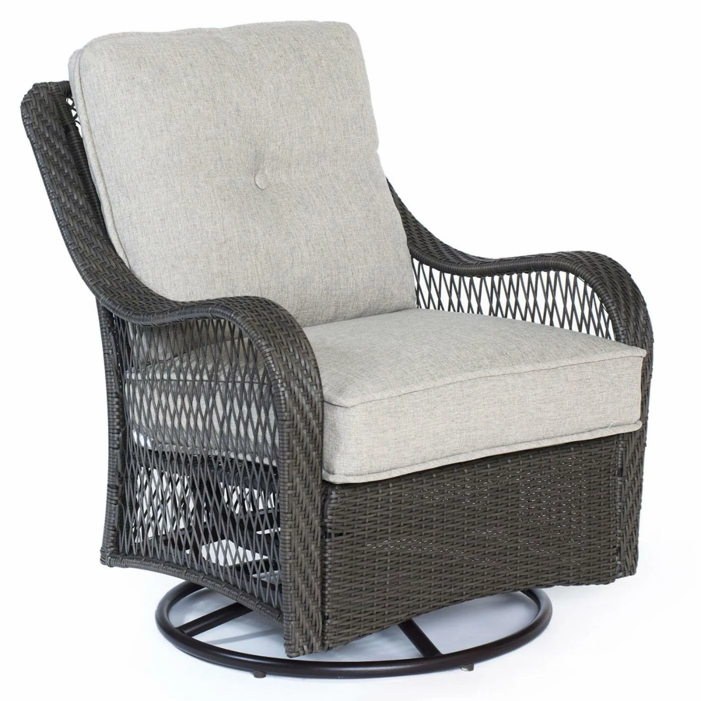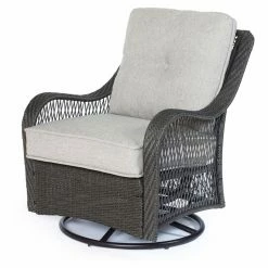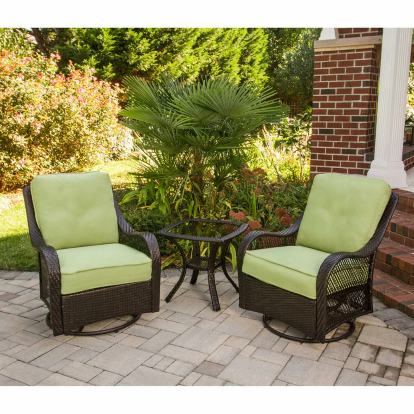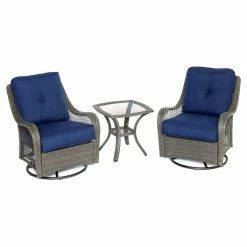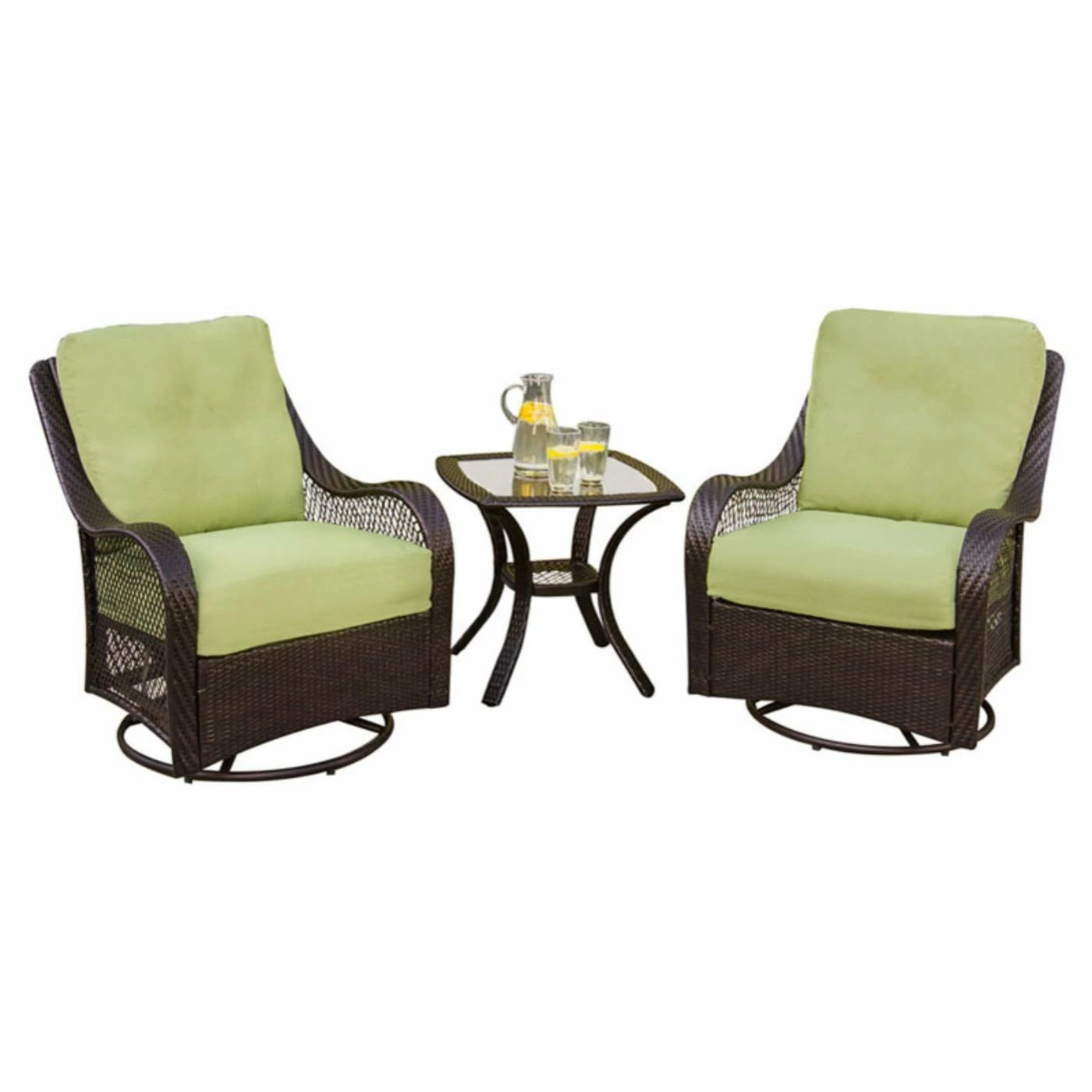 When the weather’s fine, make the most of the opportunity and take your relaxation time outdoors with the Hanover Orleans Wicker Chat Set. Designed with vibrant contemporary styling, this set includes two rocking chairs and a glass-topped end table, all with steel frames and hand-woven synthetic wicker in deep brown for a luxurious, classic look. Within each strand of wicker, intense color pigments and powerful UV protectants dwell, ensuring a long life of fade-resistant beauty. Nasty weather, rusting, and rot are non-issues thanks to the high-tech, weather-resistant finish applied to the wicker. Handsome, ample cushions in olivine are cloaked with a high-quality, 100% polyester fabric that’s designed, woven, and treated to meet exacting standards for durability, UV-resistance, and drying speed. Polyurethane foam within the cushions is supportive for the body and keeps its shape over time. All in all, this set spells many hours of rejuvenating rocking for you and your dearest. Minor assembly is required.