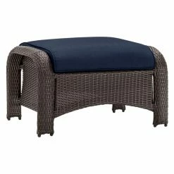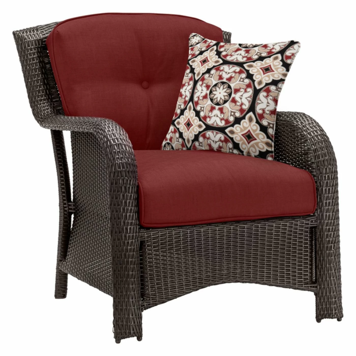 Outfit your patio with the welcoming comfort of the Hanover Strathmere Wicker 6 Piece Patio Conversation Set. This set includes a sofa, two armchairs, two ottomans, and a coffee table. Four patterned accent pillows are also included. The sofa can comfortably sit three people, and you can use the ottomans for extra seating or for side tables. The coffee table has a tempered glass top and a bottom shelf for extra storage. Each piece has durable wicker on a sturdy steel frame and is designed to withstand outdoor weather conditions. The cushions come in your choice of available colors and wrapped in a premium olefin fabric that is quick to dry and resistant to stains, water, and UV damage.