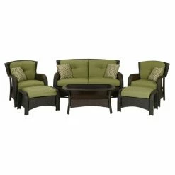 Welcome family and friends to enjoy your outdoor space with the Hanover Strathmere Wicker Patio Set. This handsome set turns wasted space into hangout central. Chocolate brown weather-resistant synthetic wicker enhances the atmosphere, while inviting outdoor-grade cushions in cilantro green fabric draw guests to settle in and visit a while. With a loveseat, two lounge chairs, two ottomans, and a coffee table, you’ll have all the ingredients for many relaxing afternoons in the sun. All-weather, textured resin has been carefully hand-woven onto the steel frames with powder coat finish to resist rust and corrosion. A smart storage shelf hides below the smoky tempered-glass top of the coffee table. Quick-drying cushions offer big-league durability and colorfastness, despite intense UV and the worst winter storms. Get into the resort mentality in your own backyard with this undeniably sophisticated set. Minor assembly required.