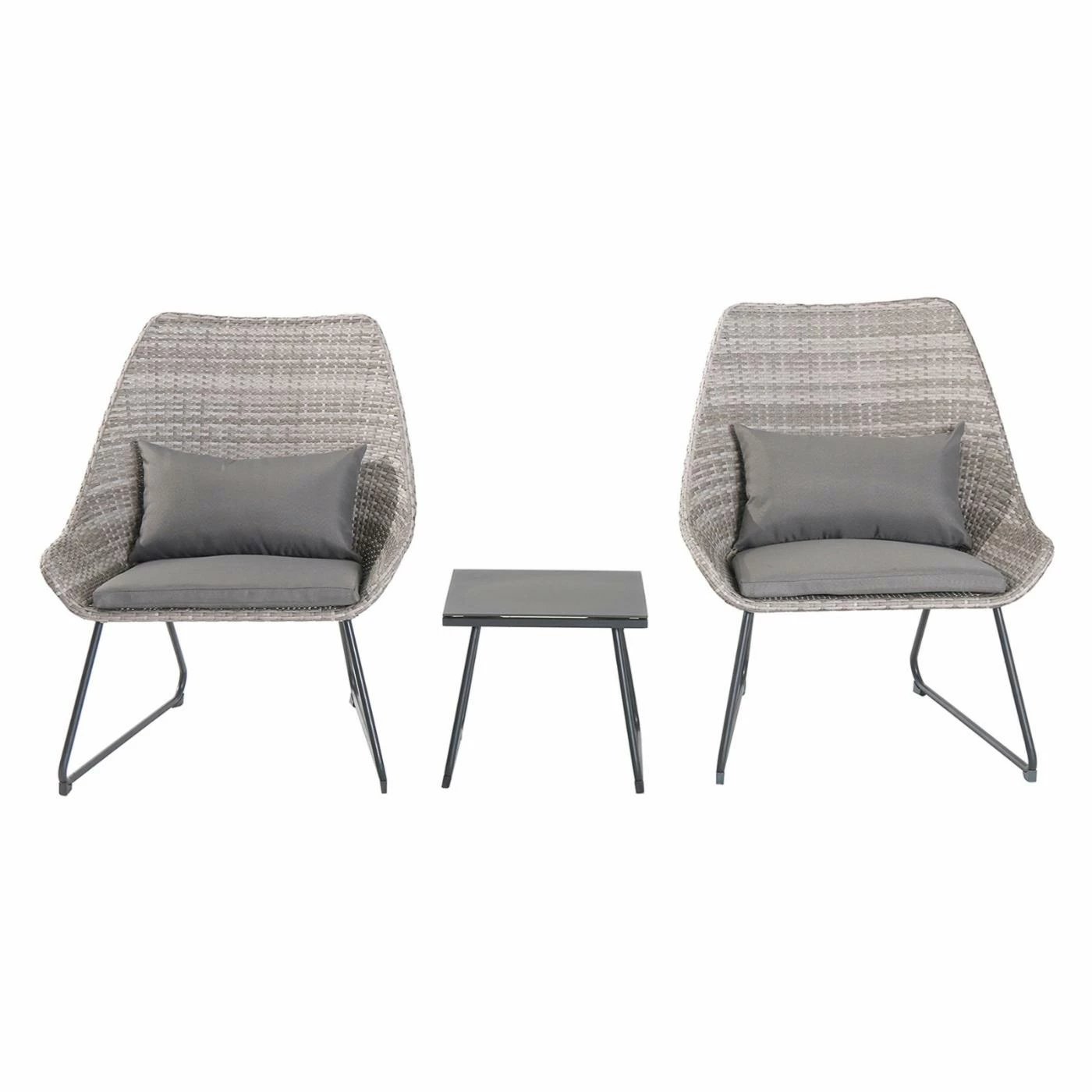 The Hanover Wicker 3 Piece Outdoor Chat Set offers a chic, modern design that’s not afraid of a life outdoors. This set includes a pair of scoop chairs with a matching side table. Each piece starts with a frame of powder-coated steel that gives it a smooth, grey color that also helps to protect from rust and corrosion. The chairs have a deep, contemporary design that employs a woven resin wicker to create a comfy, supportive seat. The resin wicker has a two-tone, grey finish that gives it a natural look. Even though resin wicker may look and feel like traditional wicker, it’s actually a synthetic product that’s resistant to rot, cracking, and fading. Each chair is appointed with a seat and back cushion that adds a touch of comfort and style to each chair. This simple set is suitable for any space, and if you were to add a few brightly colored contrast cushions, you’d have an eye-catching set that’s finished with your personal style.