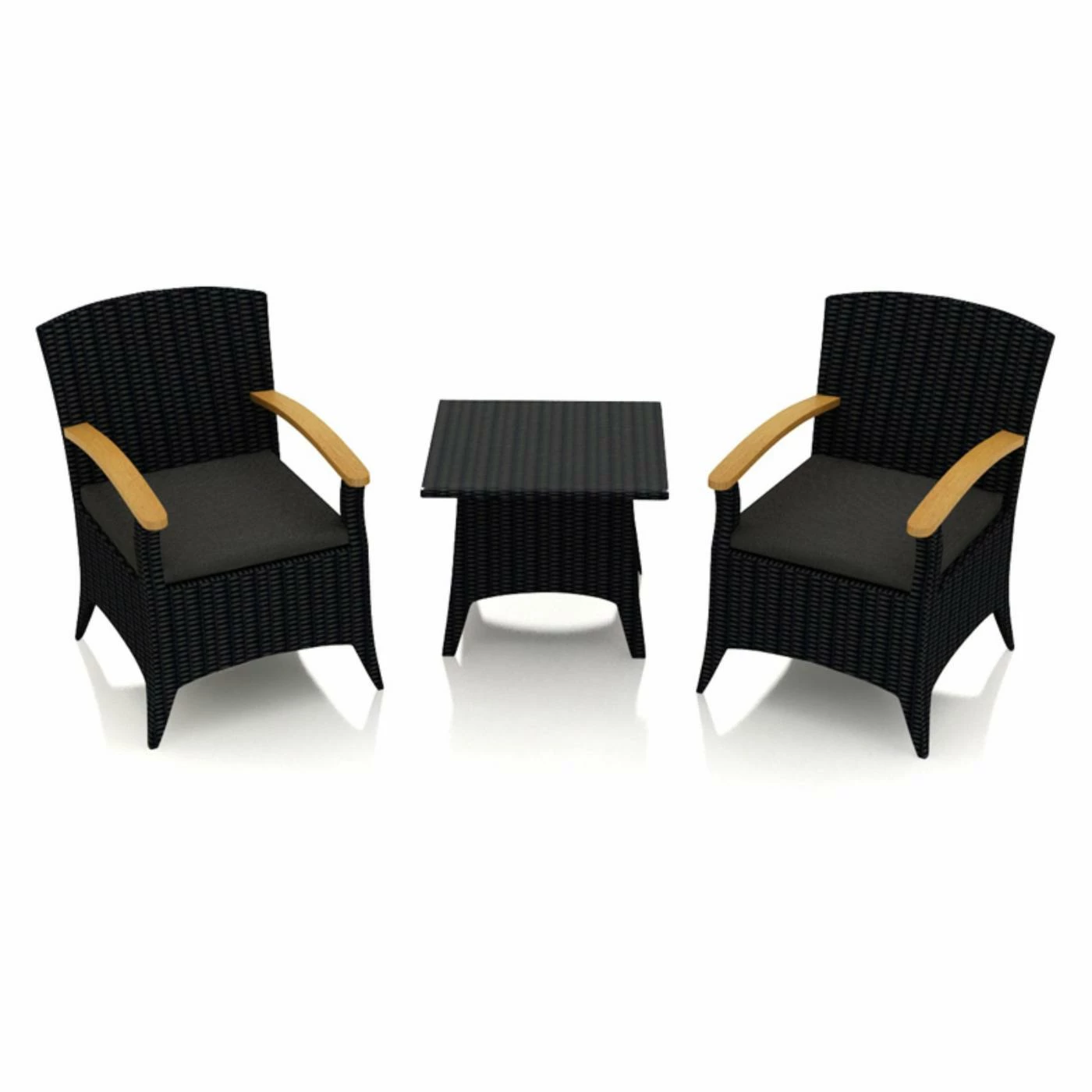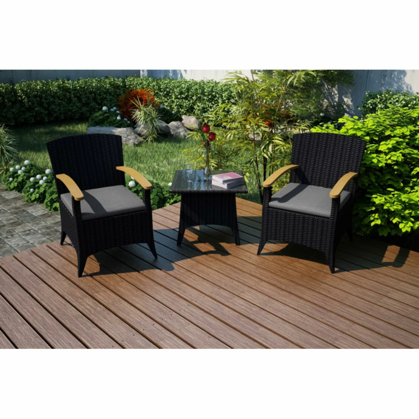 Get cozy with the Harmonia Living Arbor Wicker 3 Piece Patio Conversation Set. Woven polyethylene wicker in rich coffee bean is UV resistant to prevent fading and peeling. The plush cushions are covered chic charcoal fabric, and the end table comes with a tempered glass top.