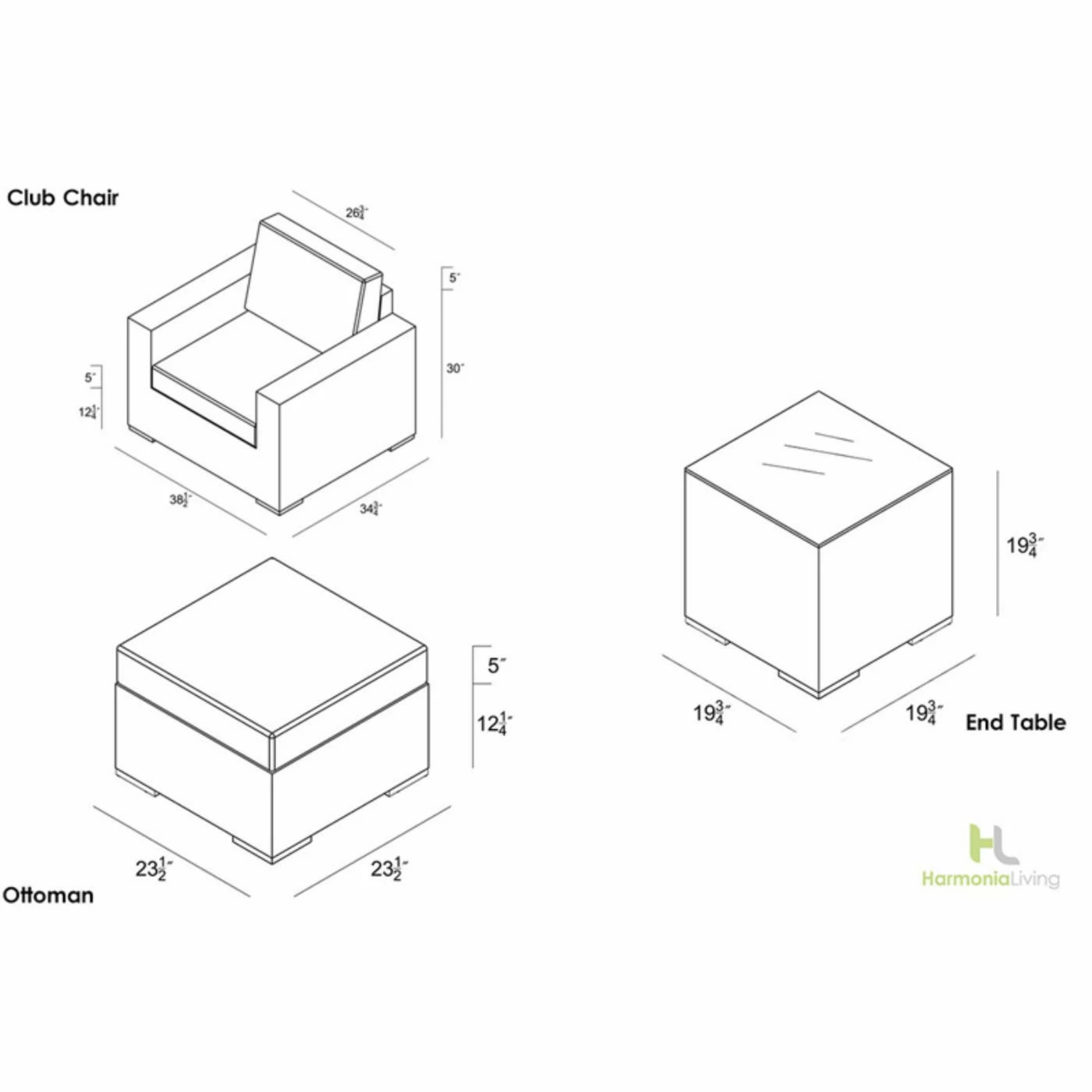 - Club chair: 28.5W x 34.75D x 30H in.