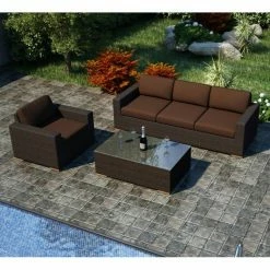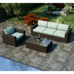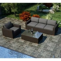 We don’t want to suggest that you should invite your therapist over for a session on the Harmonia Living Arden 3 Piece Sofa Set, but if feeling relaxed and comfortable is a key part of Jungian Talk Therapy, then we know that’s just one more event you could host on this stylish set. This set includes a club chair, sofa, and matching coffee table. Each piece shows off the texture and chestnut color of woven resin wicker while the rust-proof aluminum frames give the pieces that angular, modern shape. Made from high-density polyethylene (HDPE), resin wicker has the look and feel of authentic wicker, but unlike traditional wicker, it’s highly resistant to moisture, weathering, and fading. The chair and sofa both offer thick seat and back cushions that are covered in your choice of fade-resistant Sunbrella fabrics. These durable textiles are used for all of the zip-off, tie-back cushion covers and are very easy to clean. Each cushion is filled with quick-drying polyurethane foam that’s wrapped in Dacron to prevent mildewing. The matching coffee table gives you an echo of that modern shape while adding a single sheet of shatter-resistant glass to give you a low-maintenance, functional tabletop. Take a few minutes to check out the other pieces we have to offer in the Harmonia Living Arden collection.
