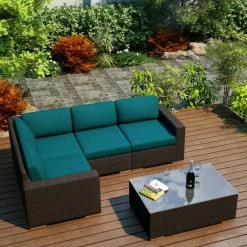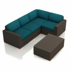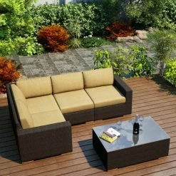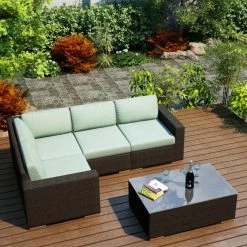 Blow the dust off that stack of summer reading, because when you get the Harmonia Living Arden 5 Piece Sectional Set, we think you’ll figure out a way to have the time to finish them all. This complete set includes a four-piece sectional with matching, glass-topped coffee table. The frame of each piece is made from rust-proof aluminum that’s wrapped with an exterior of woven resin wicker that highlights the minimal, modern form. Made from high-density polyethylene (HDPE), resin wicker has the look and feel of authentic wicker, but unlike traditional wicker, it’s highly resistant to moisture, weathering, and fading. Five-inch-thick cushions on the seat and back are filled with hefty slabs of polyurethane foam that’s protected from mildew and moisture by a Dacron wrapping, and all this is inside a zip-off cover of fade-resistant Sunbrella fabrics. These innovative, outdoor fabrics are offered in a range of colors, so take the time to find the one that works best in your outdoor space. Take a few minutes to check out the other pieces that we have to offer in the Harmonia Living Arden collection.