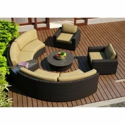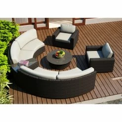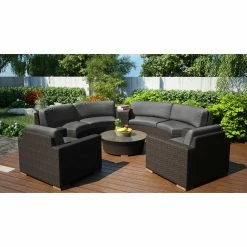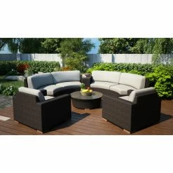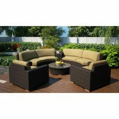 The Harmonia Living Arden 6 Piece Curved Sectional Patio Conversation Set makes it easy to create a circular seating area on your porch or patio. Each piece is built outdoor-tough, with high-density polyethylene wicker woven over fully welded thick-gauge aluminum frames, complete with protective powder coat. The wicker is infused with UV inhibitors to keep the weathered chestnut finish vibrant and crack-free season after season. And you’ll love the cushions, which feature quick-dry polyurethane wrapped in Dacron to wick moisture away and help prevent mildew. The cushion covers remove for easy care, and they’re crafted of water- and stain-resistant Sunbrella fabric in a choice of available color. Triple-reinforced seats provide added support, and glass tops grace the wedge end table and round coffee table. All items have teak wood feet.