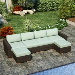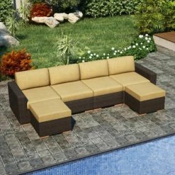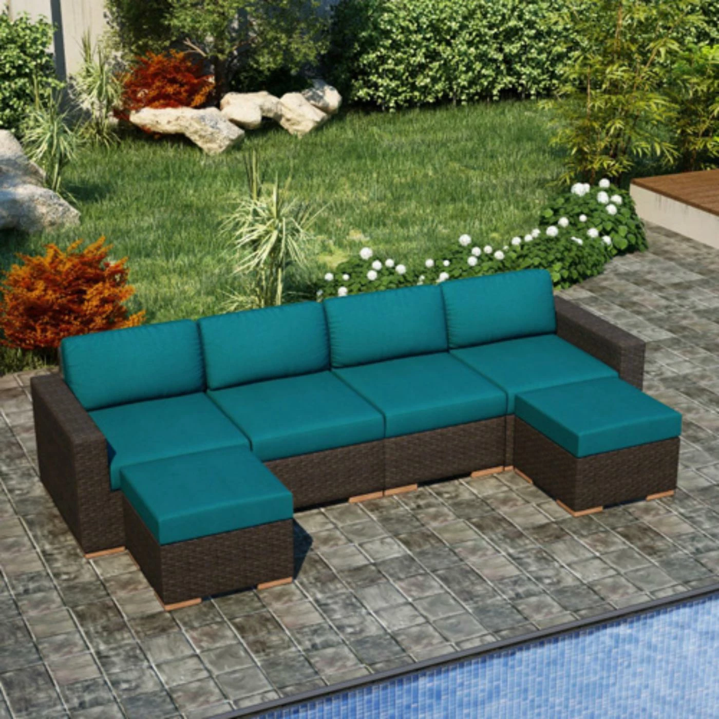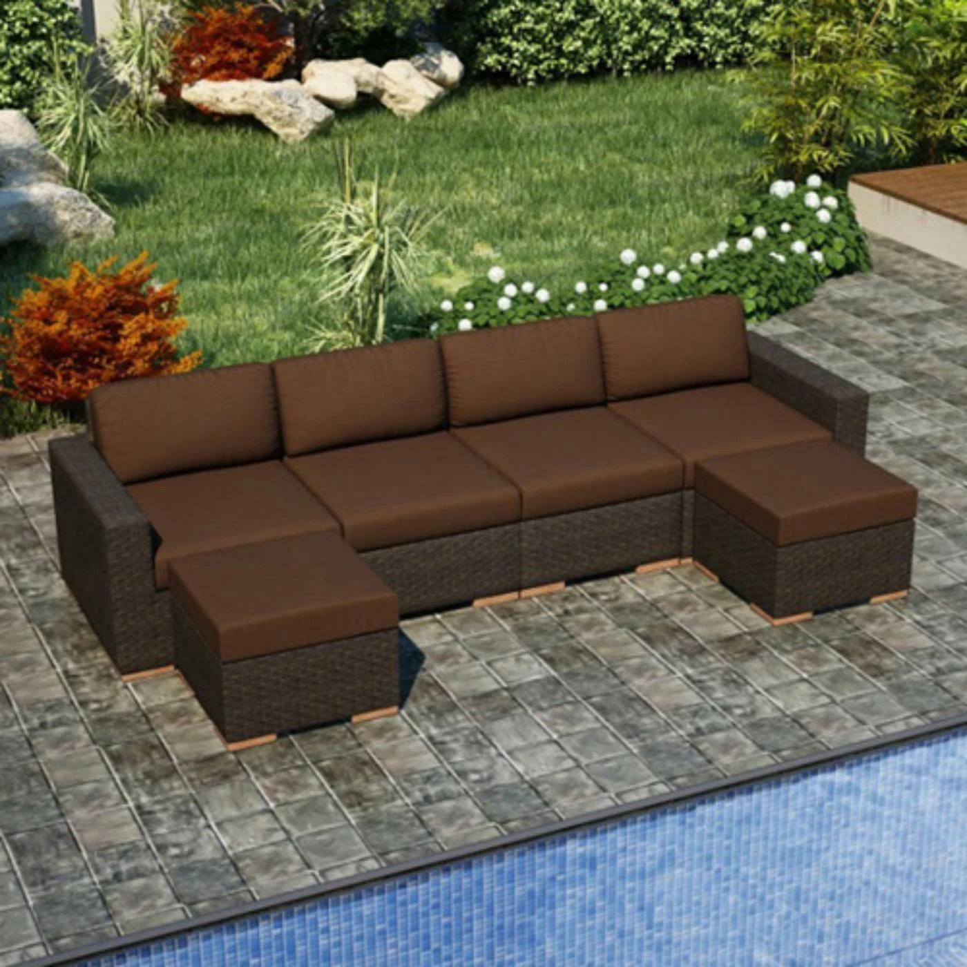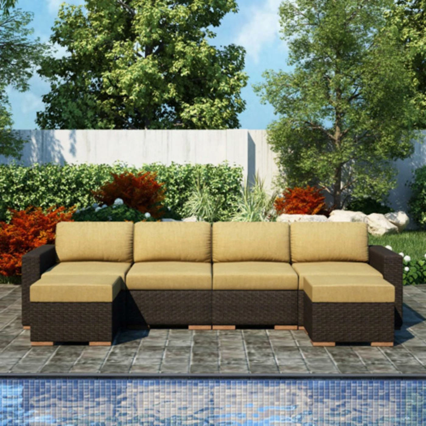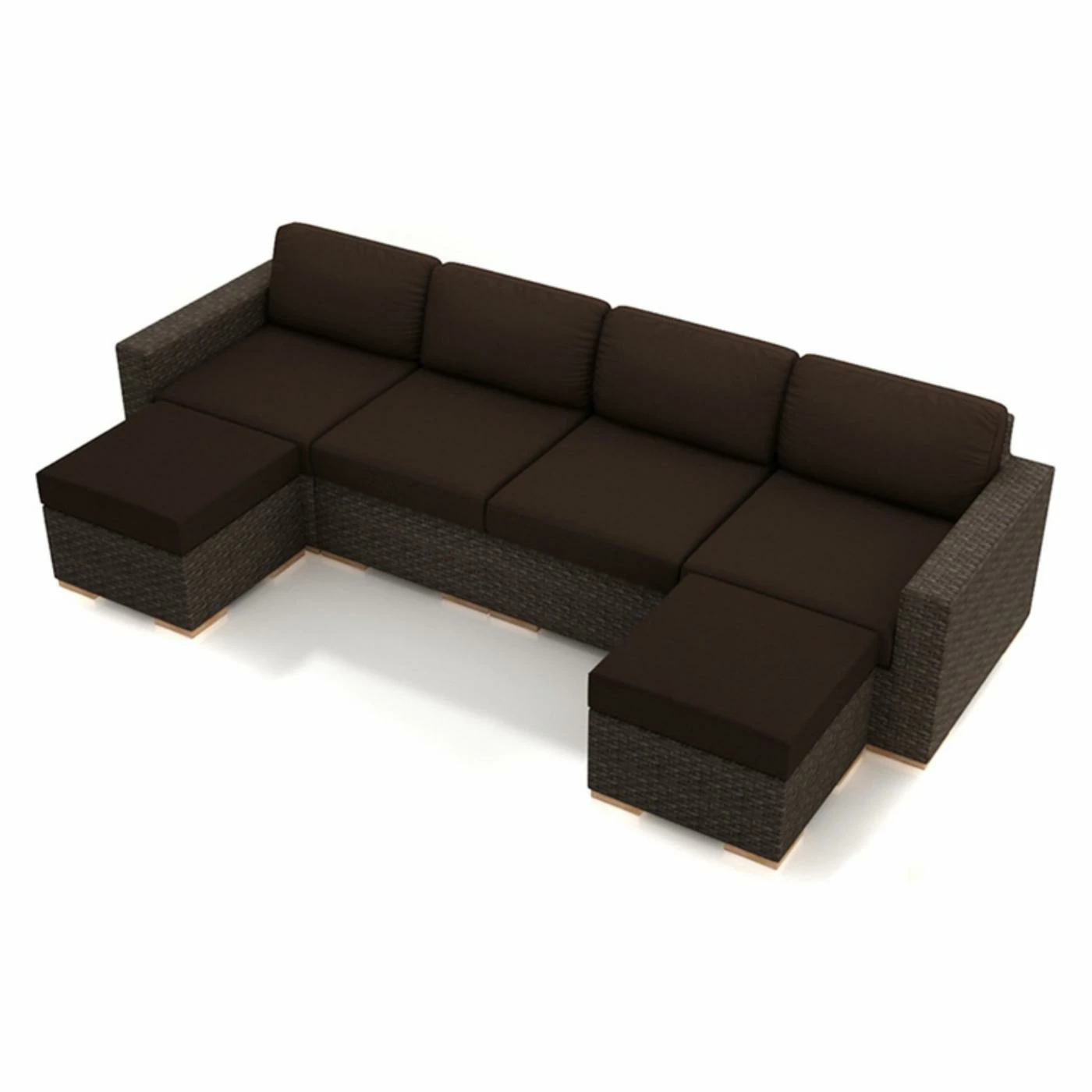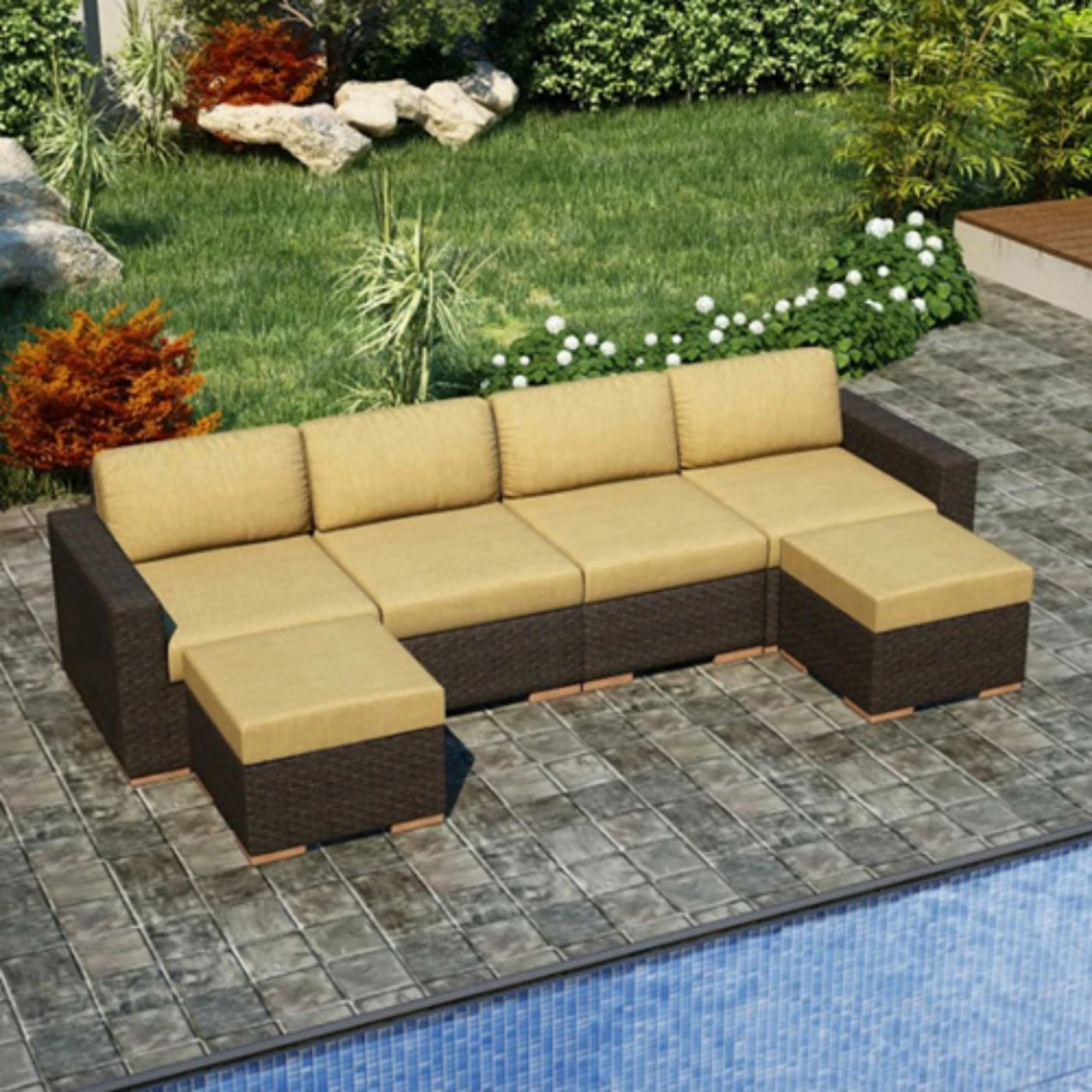 The Harmonia Living Arden 6 Piece Sectional Set so deftly combines modern style with rugged, all-weather construction that we’re hoping Harmonia become the first producer of shag carpeting to replace our lawns. It may take a bit, but while you’re waiting for that development, pull up a seat and enjoy a bit of sun on this posh, extra-wide outdoor set. A four-piece sectional with a pair of matching ottomans give you the room you need on your patio or poolside. Each piece in this set starts with a modern, minimalist frame of heavy-gauge, powder-coated aluminum. Aluminum naturally resists rust and corrosion, and when you combine it with an exterior of woven resin wicker, you get a lightweight, durable piece for all seasons. Five-inch-thick cushions of Dacron-wrapped polyurethane foam resist moisture and mildewing while the zip-off Sunbrella fabric cover adds a vibrant touch. A full range of Sunbrella fabric options are available, so take the time to choose the one that looks best in your outdoor space. Take a few minutes to check out the other pieces that we have to offer in the Harmonia Living Arden collection.