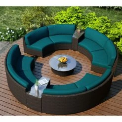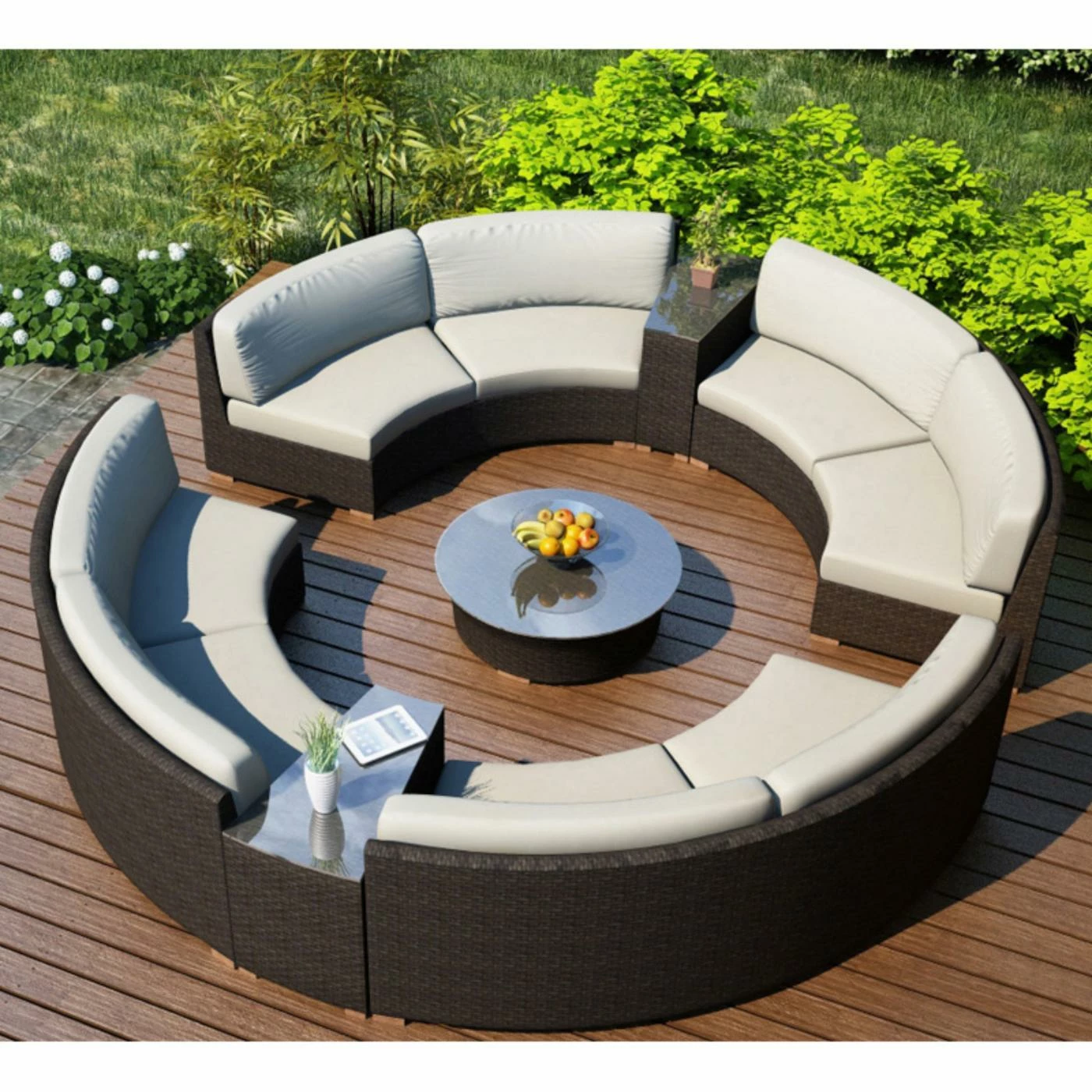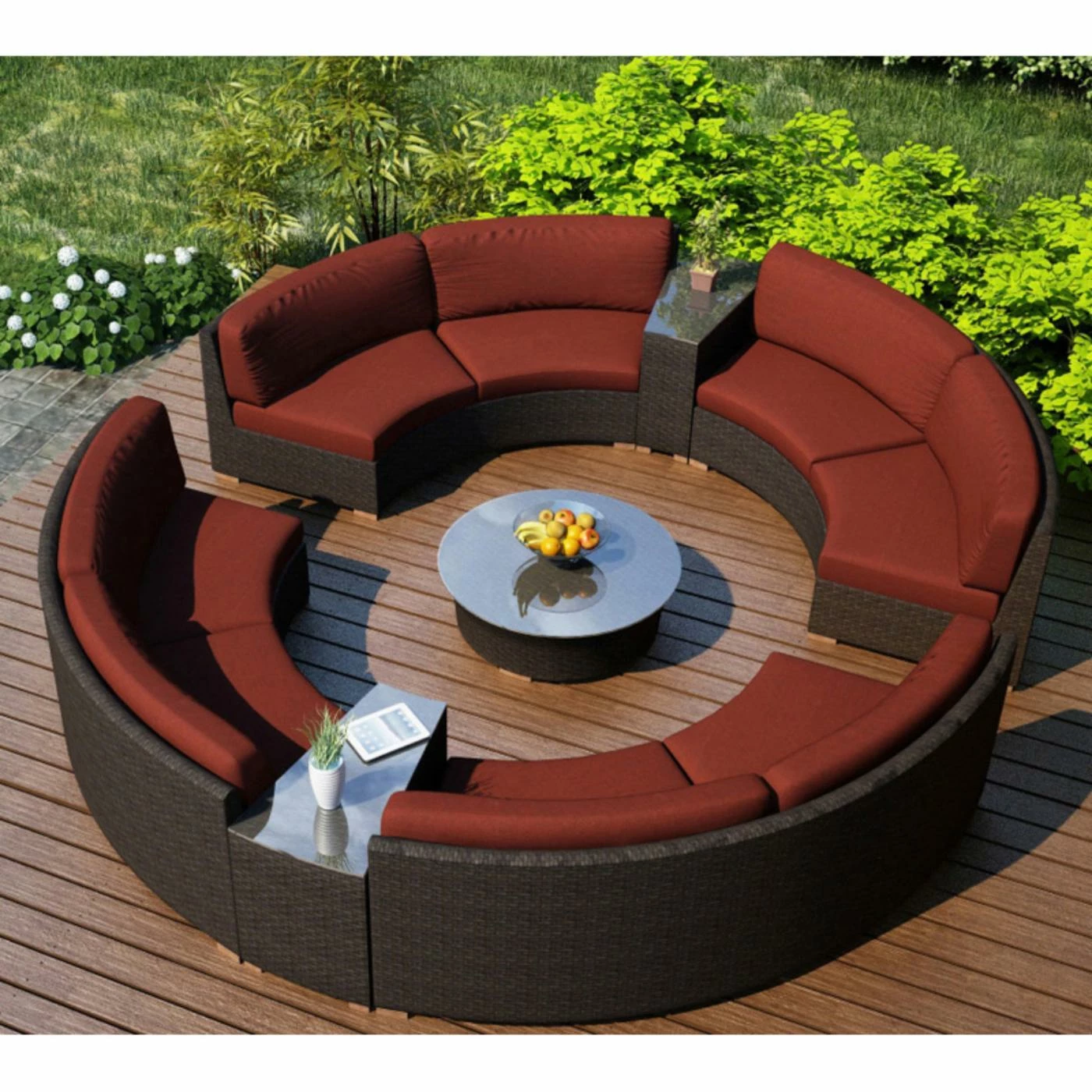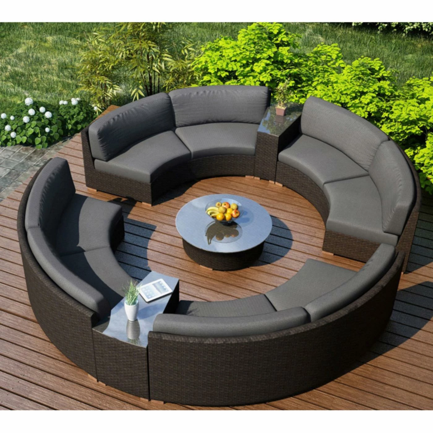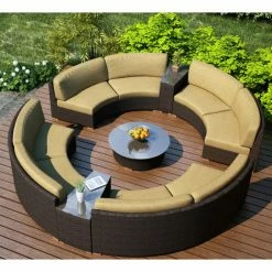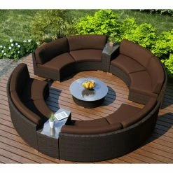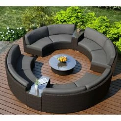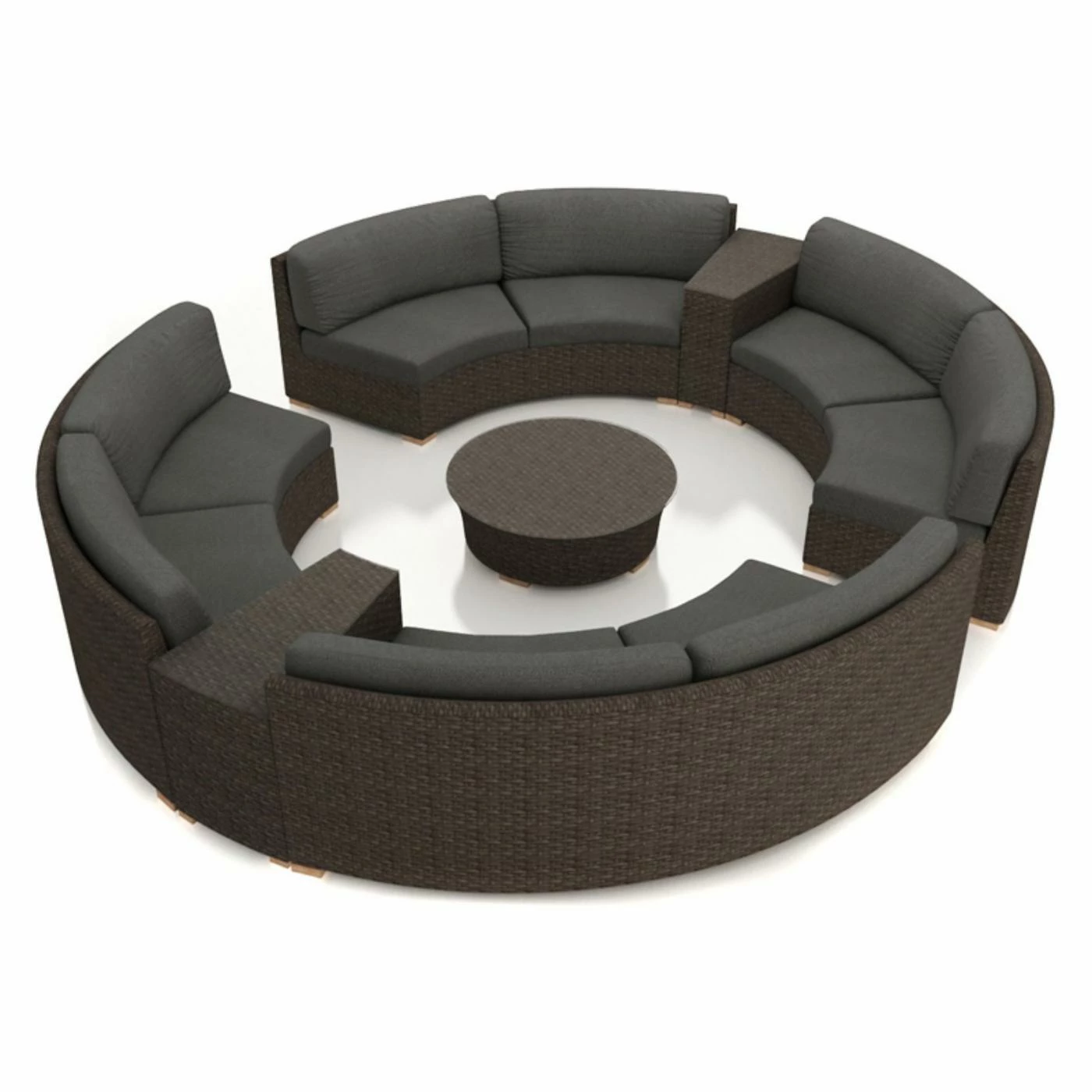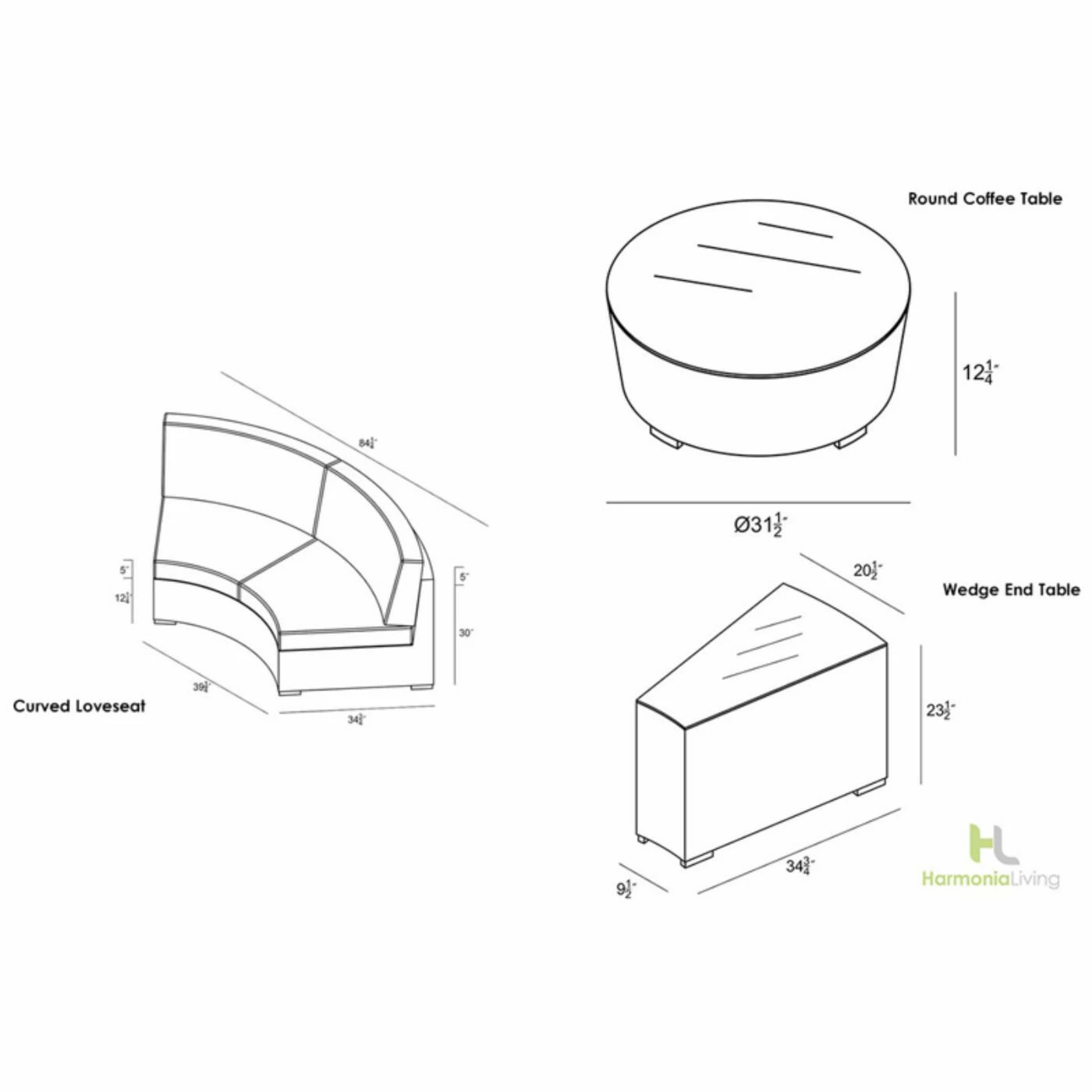 We don’t know exactly whey they chose to name it the Harmonia Living Arden 7 Piece Eclipse Sectional Set, because you’ll spend so much time outside, you won’t have any trouble seeing the sun or the moon. There’s 360 degrees of style in this modern, all-weather set that’s perfect for any home serious about outdoor relaxing. Each of the four arced loveseats starts with a rugged and lightweight frame of heavy-gauge, powder-coated aluminum. Aluminum naturally resists rust and corrosion, and when you combine it with an exterior of woven resin wicker, you get a lightweight, durable piece for all seasons. Five-inch-thick cushions of Dacron-wrapped polyurethane foam resist moisture and mildewing while the zip-off covers of Sunbrella fabric add a vibrant touch you can customize to your taste. The seats are also reinforced to help prevent sagging and stretching of the frame. A pair of wedge-shaped tables gives you and your guests a great place to set drinks or books while still enjoying the full-circle style. At the center, you’ll have a matching coffee table that’s inspired by the same contemporary form and all-weather design, with a top of shatter-resistant glass. A full range of Sunbrella fabric options are available for your cushion covers, so take the time to choose the one that looks best in your outdoor space. Discrete ties help keep the cushions in place, and easy-to-use connecting clips hold the sections together to create a more circular form. Take a few minutes to check out the other pieces that we have to offer in the Harmonia Living Arden collection.