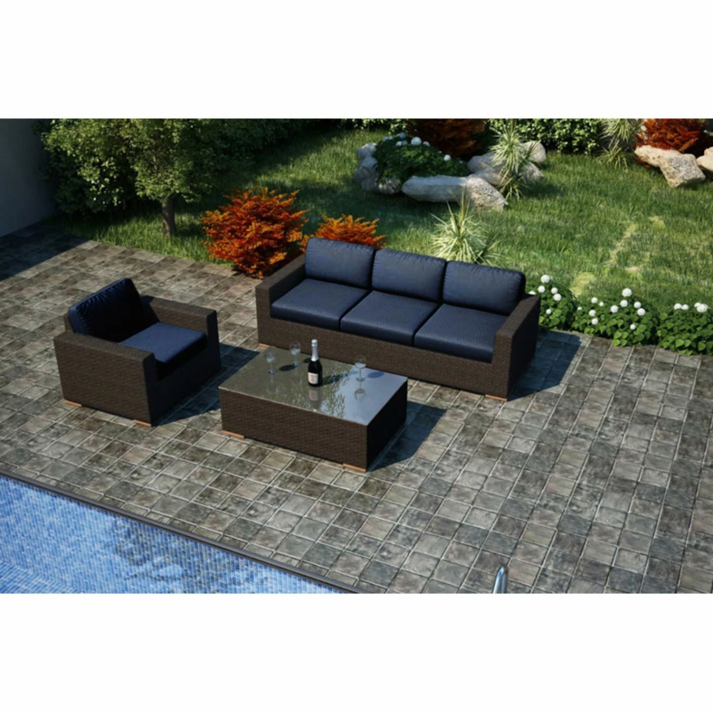 This all-weather Harmonia Living Arden Wicker 3 Piece Patio Conversation Set features woven wicker with a chestnut finish. The sofa and chair feature high arms and extra-plush cushions that give it a traditional look. The matching coffee table comes with a tempered glass top.