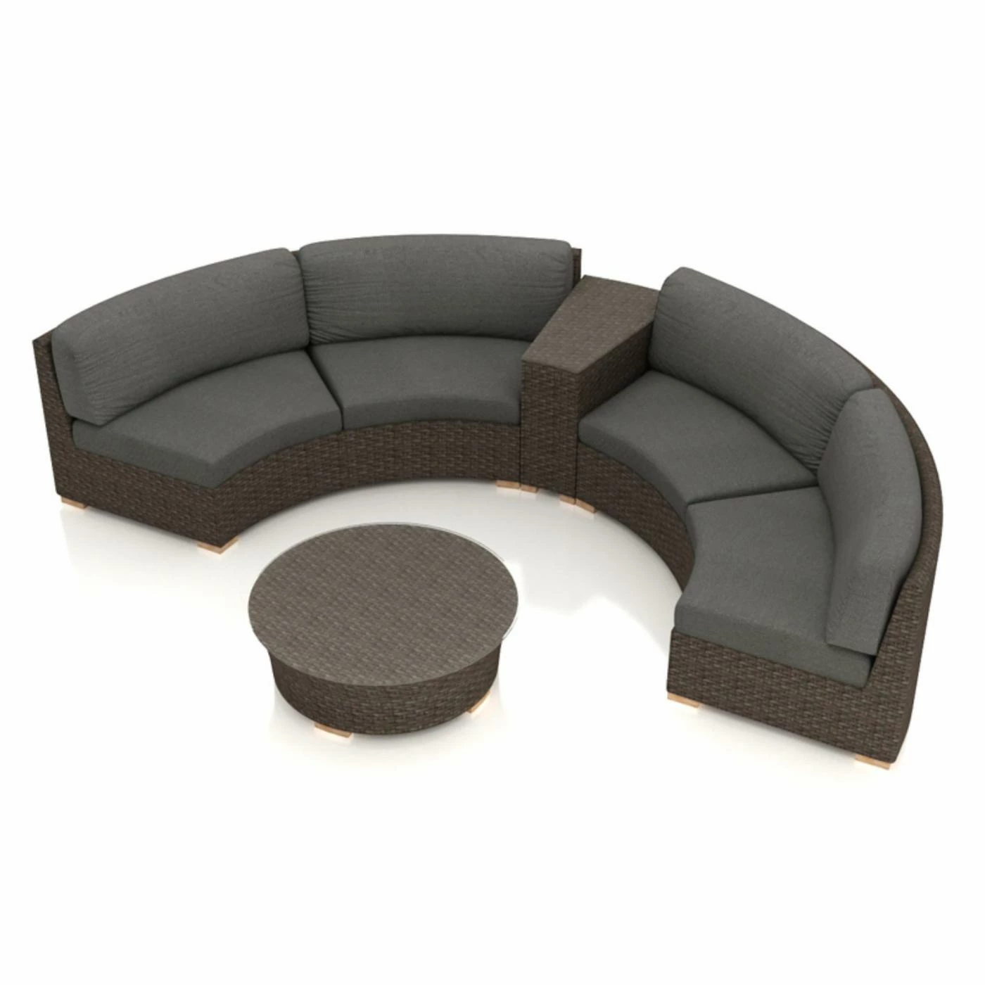 The Harmonia Living Arden Wicker 4 Piece Curved Patio Conversation Set creates an inviting space for guests and long talks under the stars. This set has everything you need for the perfect patio: two curved sectionals, a circular coffee table, and a wedge side table. Sink into the plush cushions for total relaxation.
