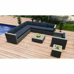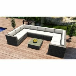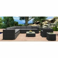 It’ll be easier than ever to invite everyone to your patio party when the Harmonia Living District 10 Piece Surround Sectional Patio Conversation Set is part of the equation. The modular pieces can be configured as you please, and their all-weather construction means you’ll be enjoying them season after season. The high-density polyethylene wicker is infused with UV inhibitors to keep the textured slate finish from fading and cracking. The wicker is woven over corrosion-resistant thick-gauge aluminum frames with protective powder coats, and the triple-reinforced seating provides generous, durable support. And not only are the cushion covers available in a choice of color, but they’re crafted of Sunbrella fabric, an industry standard in mildew- and fade-resistance. Rust-proof brushed aluminum feet on all items are outfitted with plastic glides, and the square coffee table sports a glass top.