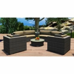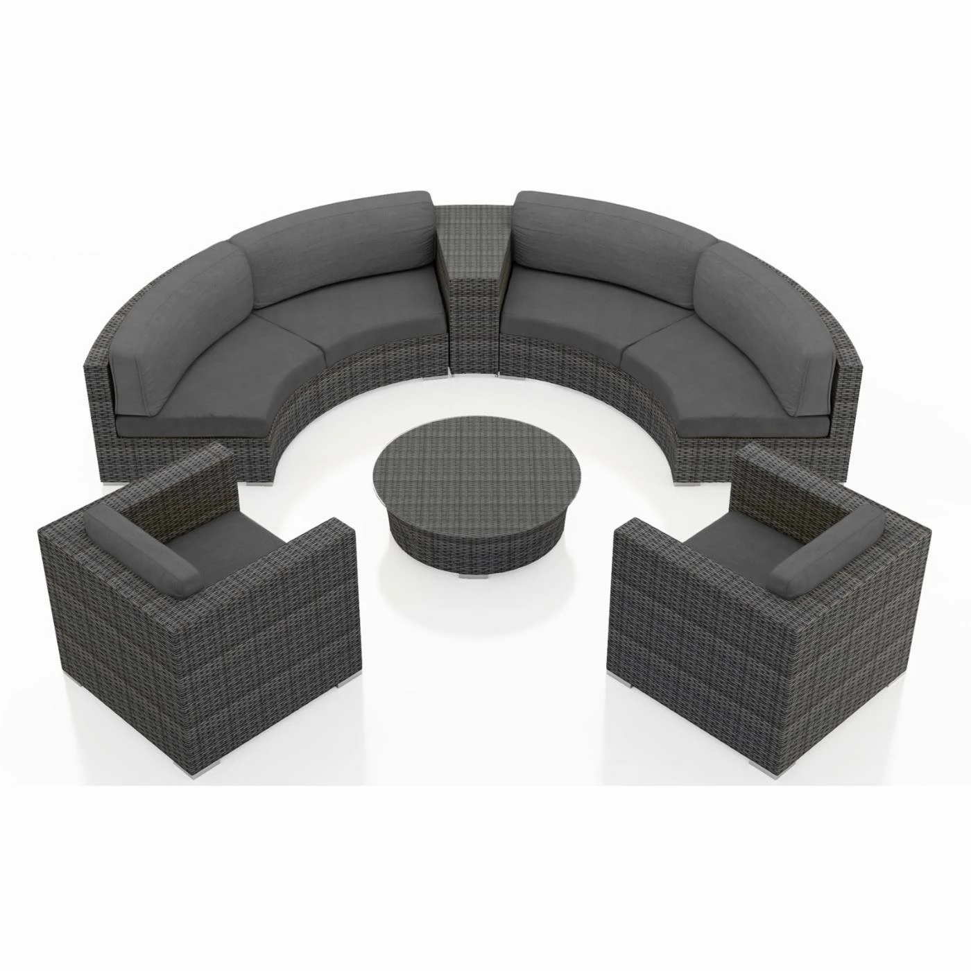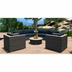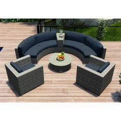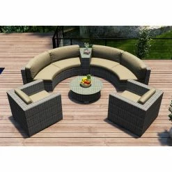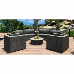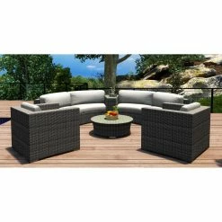 Cozy comfort and rugged, all-weather construction make the Harmonia Living District 6 Piece Curved Sectional Patio Conversation Set a welcome addition to most any circular outdoor living area. The high-density polyethylene wicker is finished in a textured slate tone, and its UV inhibitors prevent fading and cracking. The internal frames are crafted of corrosion-resistant thick-gauge aluminum with a protective powder coat finish. Triple-reinforced seating helps prevent the wicker from stretching, and the removable cushion covers offer even more comfort thanks to Sunbrella fabric, an industry leader in mildew- and fade-resistance. Rust-proof brushed aluminum feet are equipped with plastic glides to prevent floor damage, and the wedge end table and round coffee table have glass tabletops. Choose from available cushion colors.