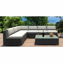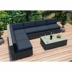 Don’t just dream about that perfect sectional patio set – make it happen with the Harmonia Living District 7 Piece Sectional Patio Conversation Set. The five middle sections and one corner section can be positioned around the included coffee table to suit your space, and each piece in this patio conversation is built weather-ready tough. The corrosion-resistant thick-gauge aluminum frames are covered in a protective powder coat and wrapped in high-density polyethylene wicker. The wicker’s UV inhibitors keep the textured slate finish looking vibrant, and the seats are triple-reinforced for added durability and support. The cushions are built with durability in mind, too, including removable covers crafted of Sunbrella fabric, which is renowned for its mildew- and fade-resistance. Rust-proof brushed aluminum feet help prevent damage to floors, and the rectangular coffee table is equipped with a glass top. Available with a choice of cushion color.