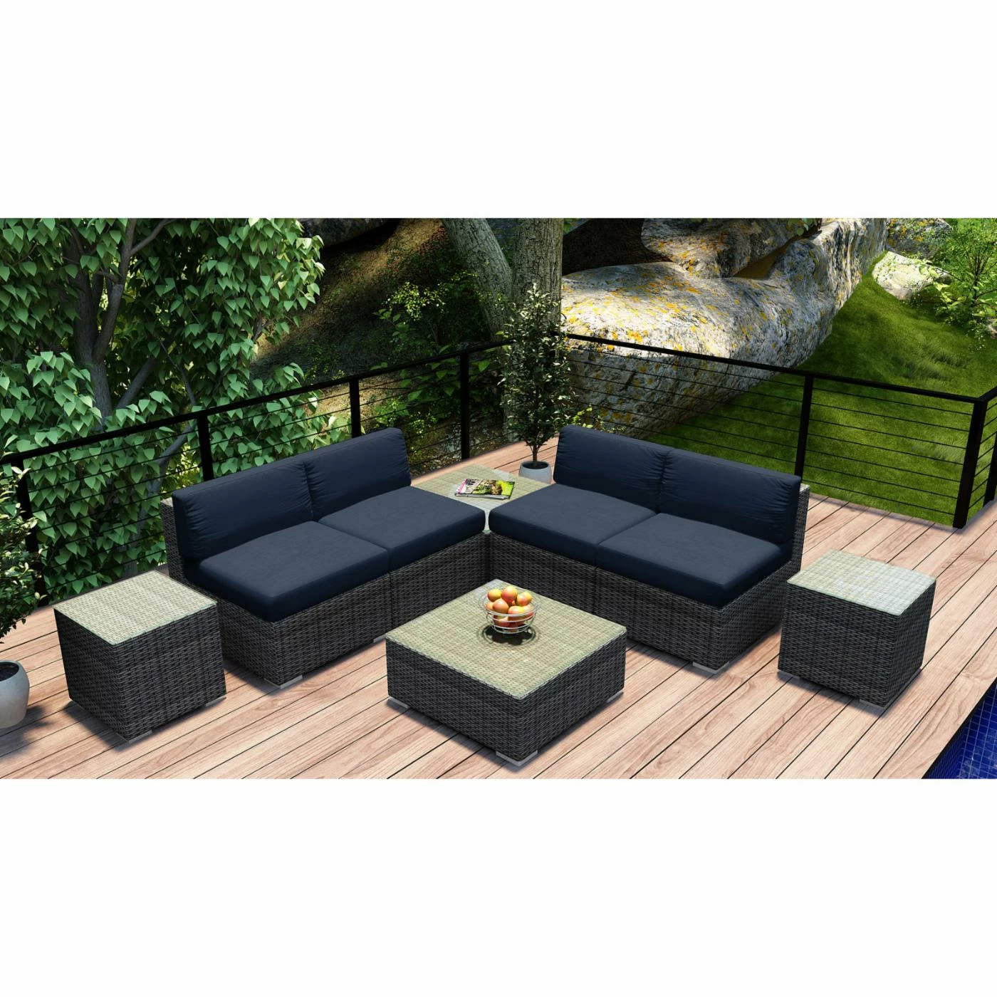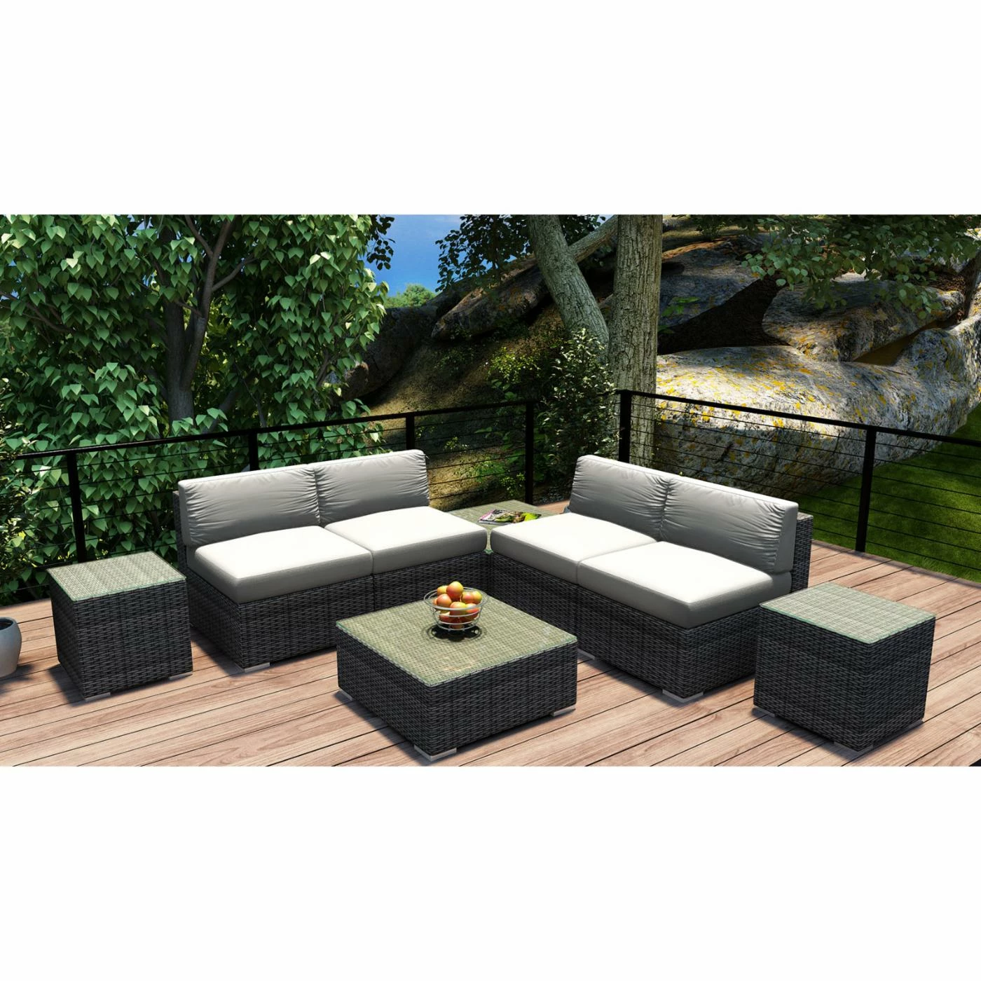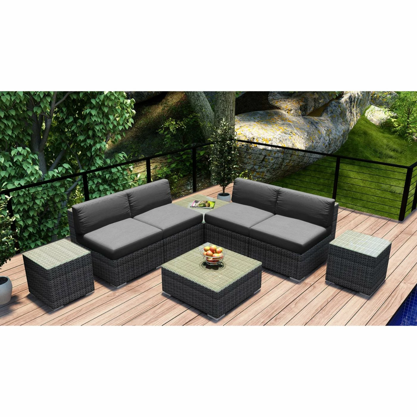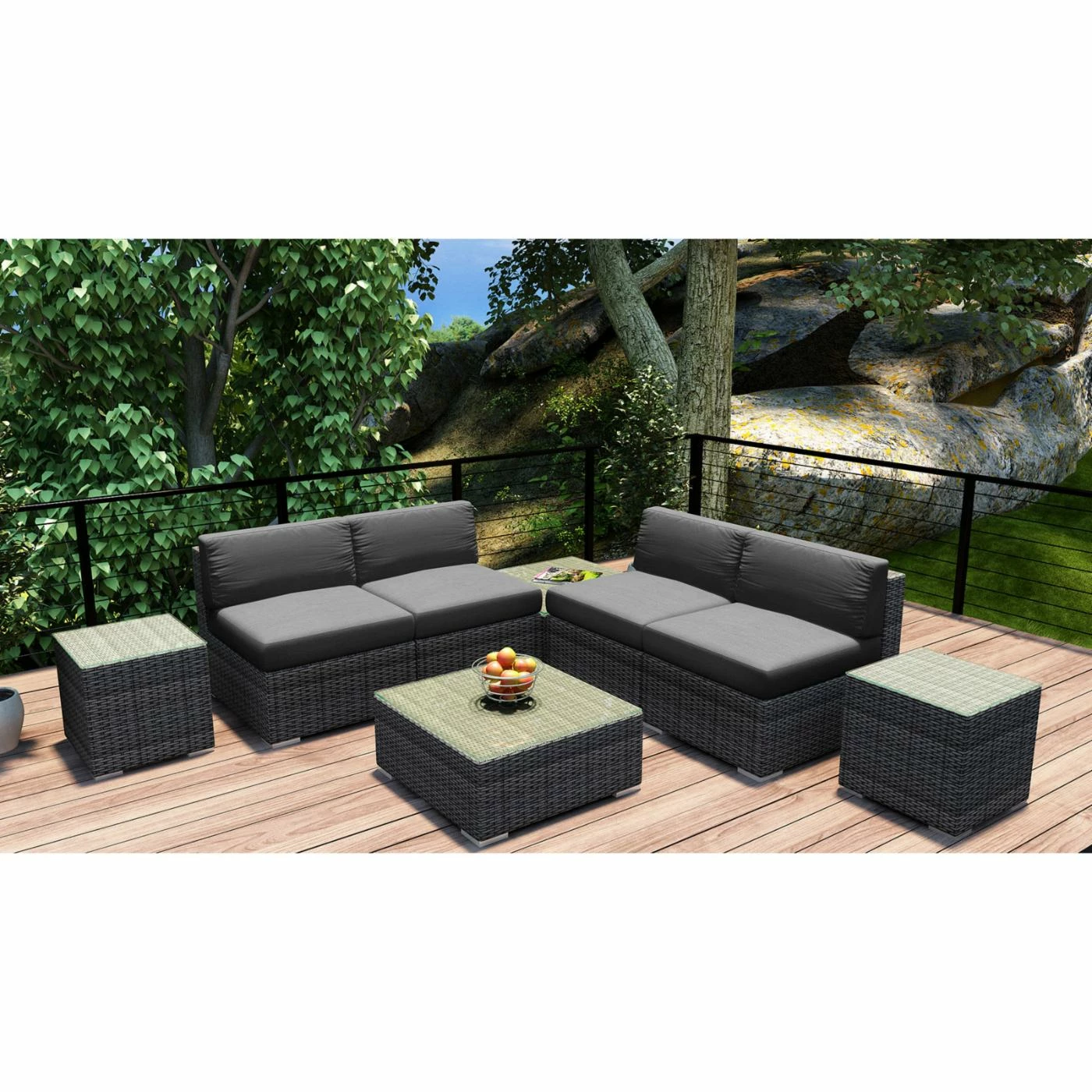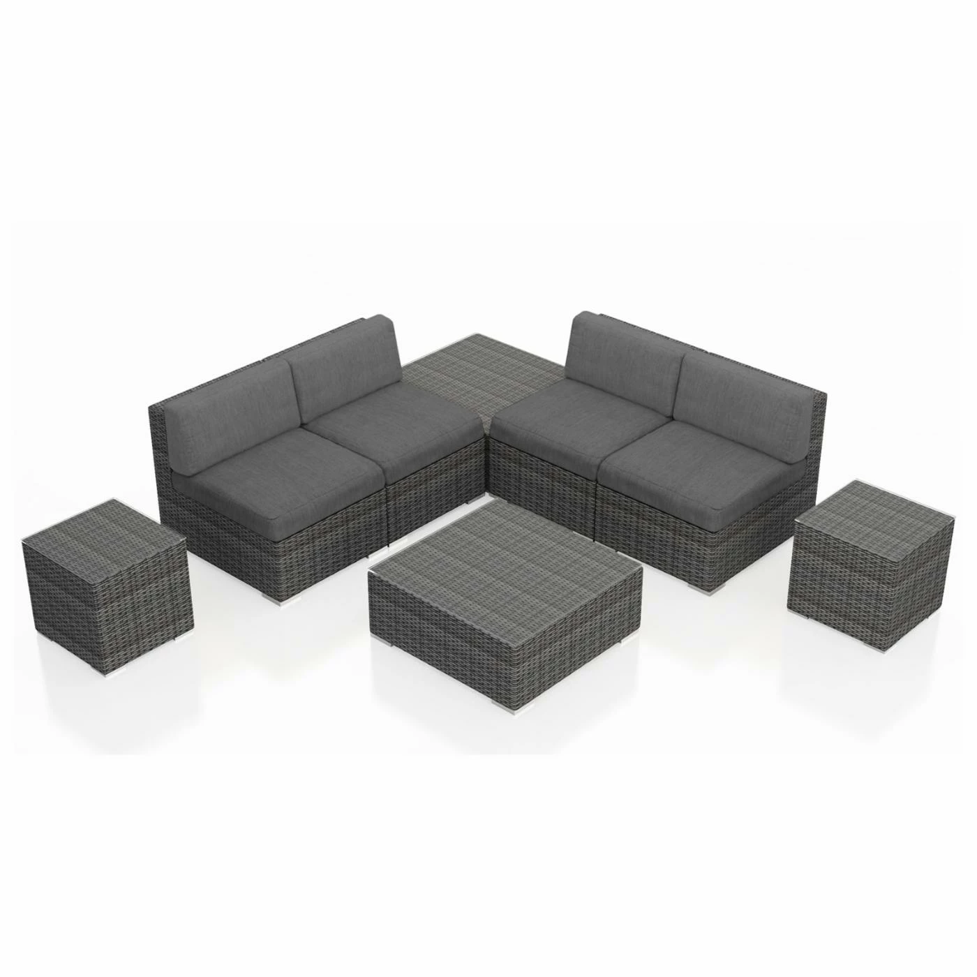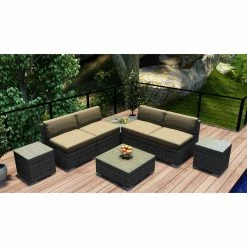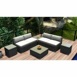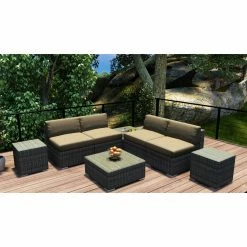 Plan to spend a lot more time outside this summer because the Harmonia Living District 8 Piece 4-Seat Sectional Set will turn your porch or patio into pure paradise. The modular pieces can be configured and reconfigured as you please, and they’re built with the weather in mind. Corrosion-resistant thick-gauge aluminum frames, complete with a protective powder coat finish, are wrapped with high-density polyethylene wicker with UV inhibitors to prevent cracking and fading. Pair the textured slate finish with your choice of available cushion color. The removable covers are crafted of Sunbrella fabric, an industry leader in mildew- and fade-resistance. Rust-proof brushed aluminum feet are equipped with plastic glides to prevent floor scuffing, and the tabletops are equipped with easy-clean glass surfaces.