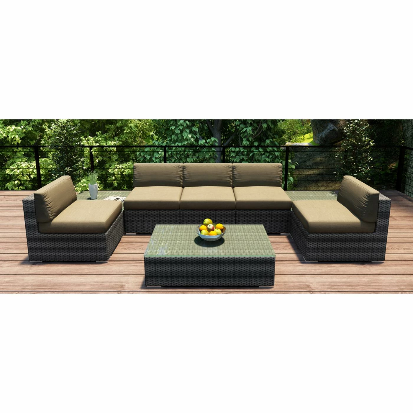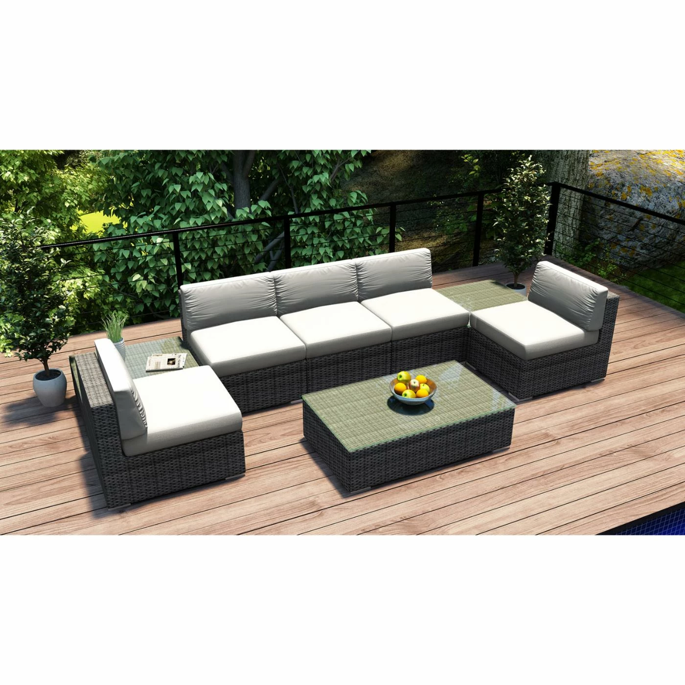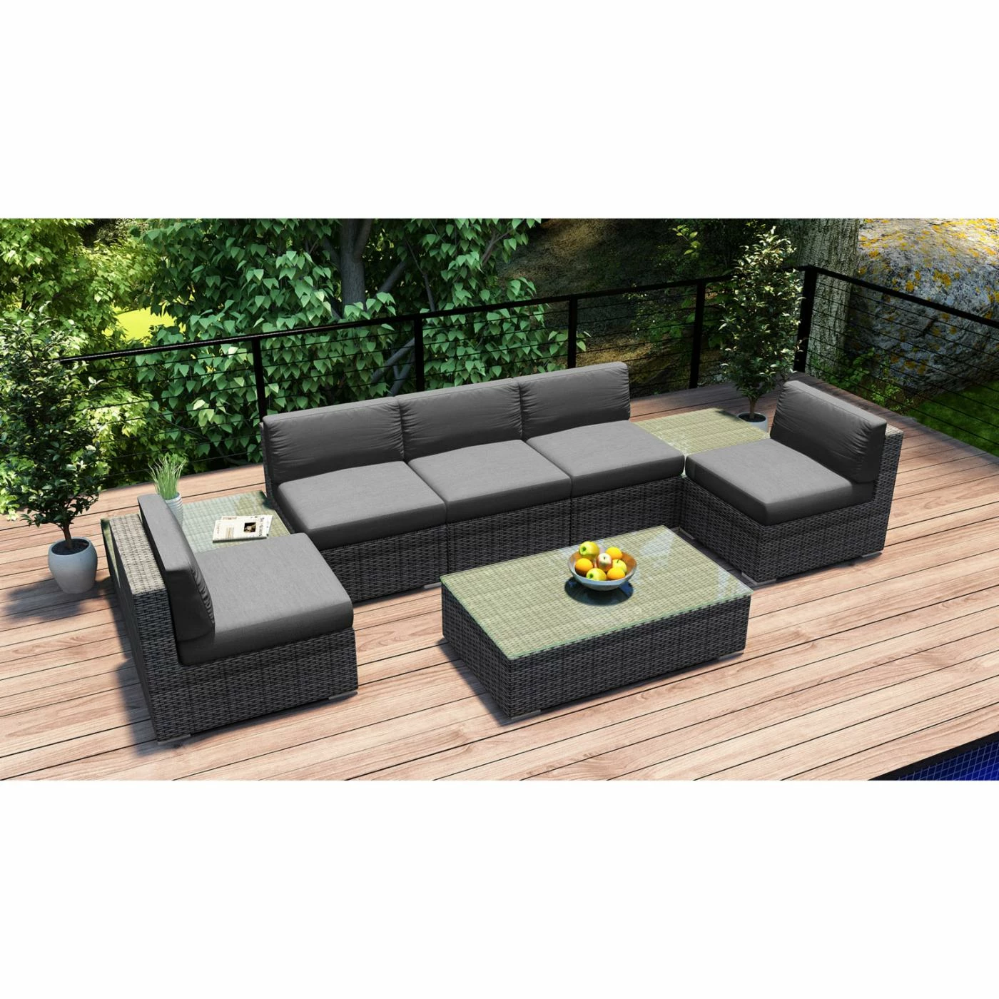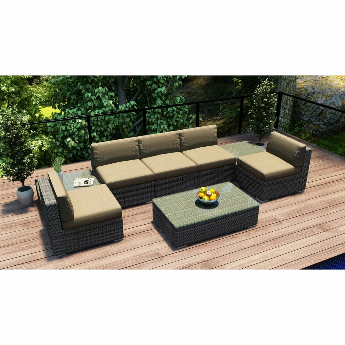 Get the fit your outdoor living area needs with the Harmonia Living District 8 Piece 5-Seat Sectional Patio Conversation Set. The modular pieces can be positioned and re-positioned as you please, and they’re resilient when it comes to the weather, too. Their rugged construction includes high-density polyethylene wicker infused with UN inhibitors to prevent fading and cracking. The internal frames are crafted of powder-coated thick-gauge aluminum frames that stand up to corrosion, and the seats are triple-reinforced for added durability. The included cushions are available in a choice of color, and the removable covers are crafted of Sunbrella fabric, an industry leader in fade- and mildew-resistance. Easy-clean glass tops grace the coffee tables, and all items have rust-proof aluminum feet outfitted with protective plastic glides.