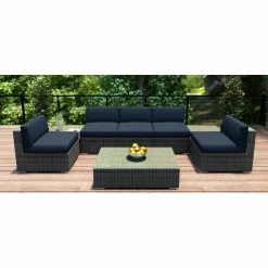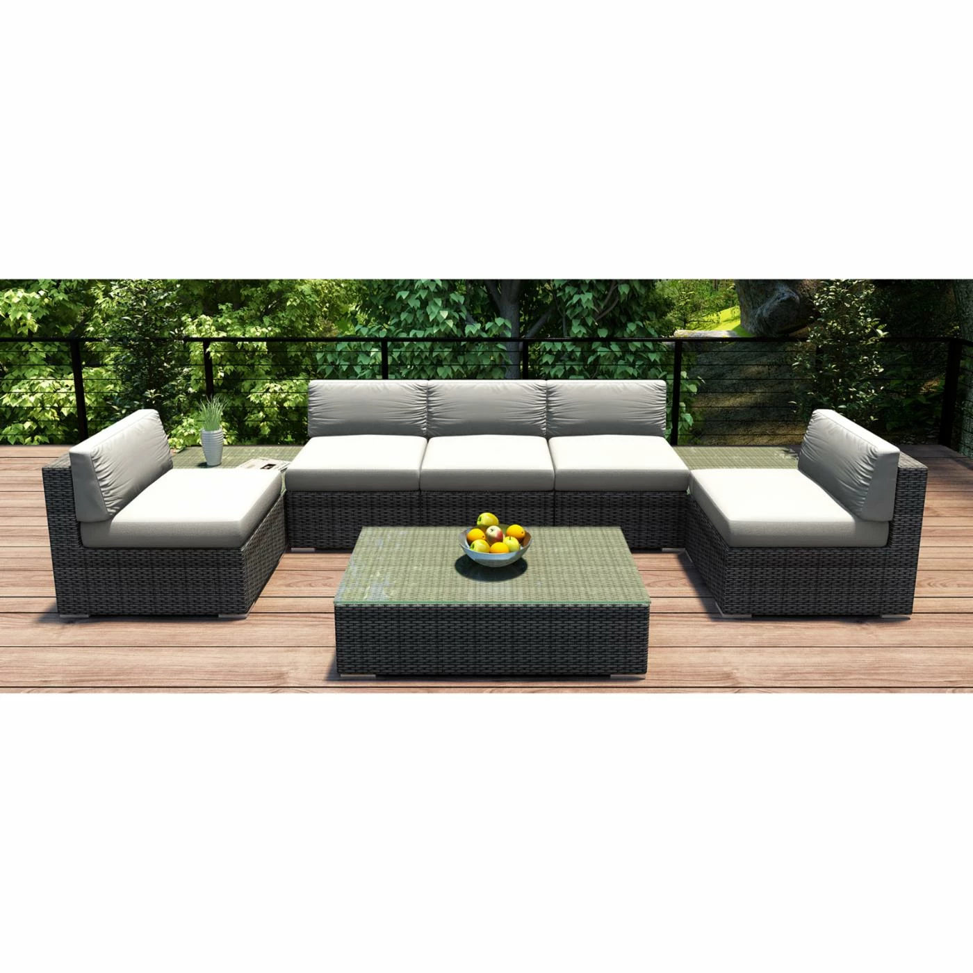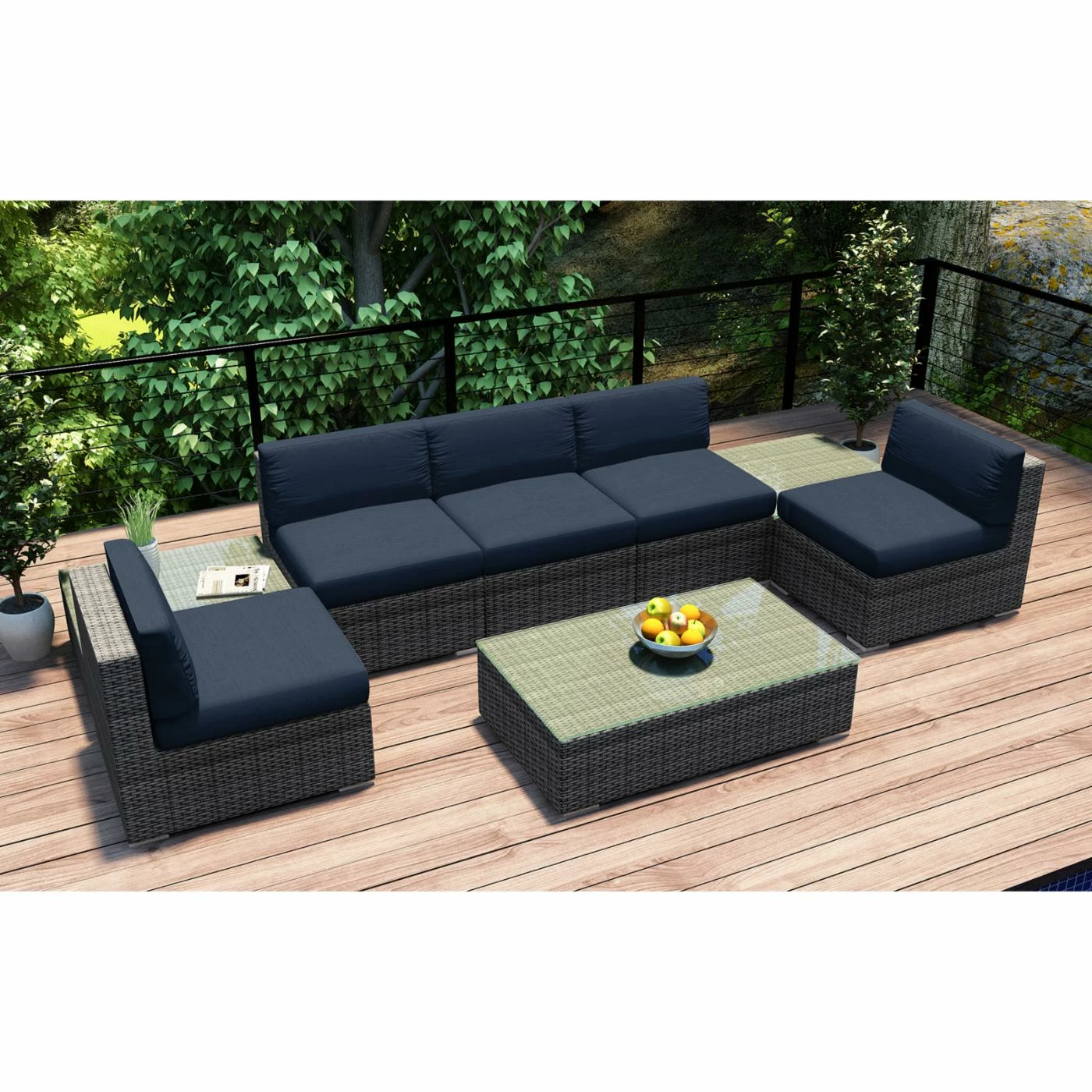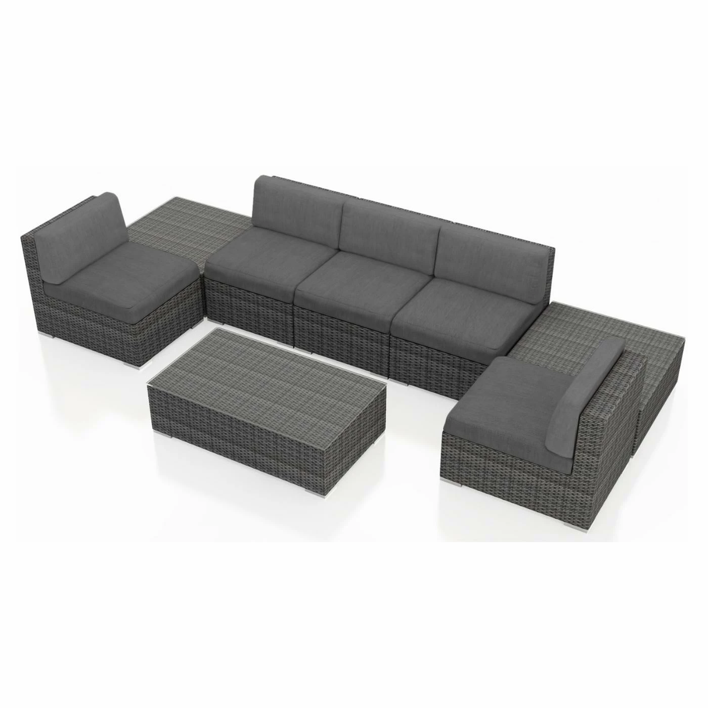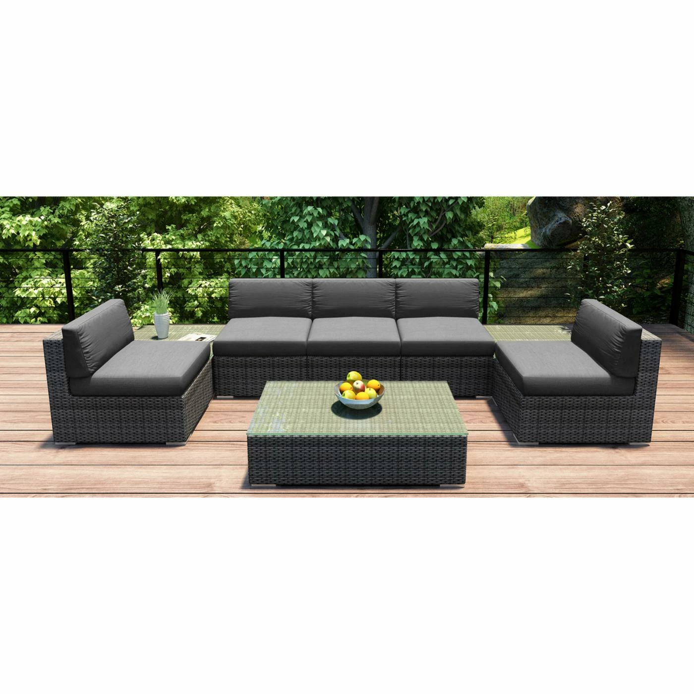 Get the fit your outdoor living area needs with the Harmonia Living District 8 Piece 5-Seat Sectional Patio Conversation Set. The modular pieces can be positioned and re-positioned as you please, and they’re resilient when it comes to the weather, too. Their rugged construction includes high-density polyethylene wicker infused with UN inhibitors to prevent fading and cracking. The internal frames are crafted of powder-coated thick-gauge aluminum frames that stand up to corrosion, and the seats are triple-reinforced for added durability. The included cushions are available in a choice of color, and the removable covers are crafted of Sunbrella fabric, an industry leader in fade- and mildew-resistance. Easy-clean glass tops grace the coffee tables, and all items have rust-proof aluminum feet outfitted with protective plastic glides.