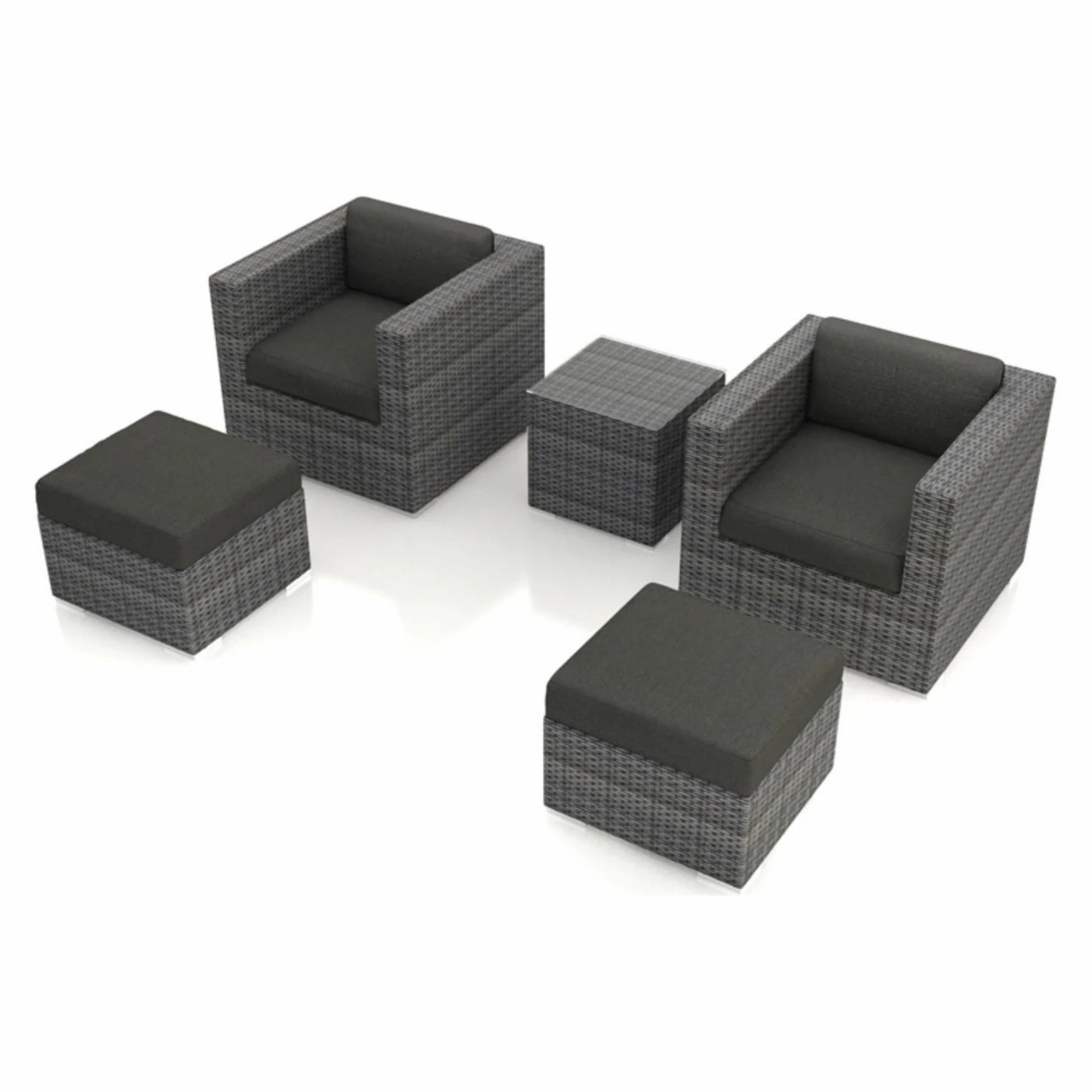 This all-weather Harmonia Living District Wicker 5 Piece Patio Conversation Set offers plenty of seating space for you and your guests. The rust-proof aluminum frames provide a square, modern design, while the exterior resin wicker gives it a traditional look. The set also includes a glass-topped end table to set drinks, appetizers, or flowers. Choose from the available cushion colors.