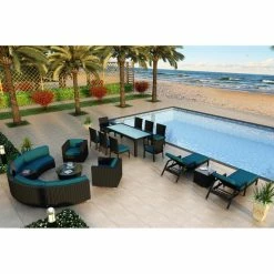 The Harmonia Living Urbana 18 Piece Eclipse All-Weather Wicker Patio Conversation Set, offers everything you need to create a chic, relaxing outdoor entertaining space. This modern 18-piece patio conversation set includes a pair of reclining chaise lounge chairs, and matching end table for relaxing by the pool. Gather round for casual conversations at the curved sectional with coordinating club chairs. Serve meals at the dining table that includes seating for up to eight guests. The furniture is made with powder-coated aluminum frames, and warp-resistant wicker in a contemporary color. Choose your favorite available color for the Sunbrella fabric cushions that brings the set a cohesive look, and fade-resistant style season after season.