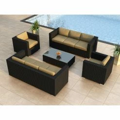 The double-sofa setup of the Harmonia Living Urbana All Weather Wicker 5 Piece Double Sofa Patio Conversation Set ensures you’ll have room for everyone. Each piece in this set features a corrosion-resistant thick-gauge aluminum frame that’s triple-reinforced for superior durability and covered in a protective powder-coat finish. The high-density polyethylene recyclable all-weather wicker combines UV inhibitors to prevent fading with a rich Coffee Bean color. You’ll get to choose from available cushion colors, and the covers are crafted of Sunbrella fabric, which ranks among the best in fade- and mildew-resistance. Covers remove easily thanks to hidden zippers. The coffee table includes a glass top, and all pieces have rust-proof aluminum feet with protective plastic glides to prevent floor damage.