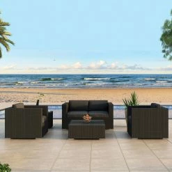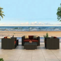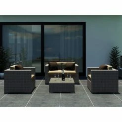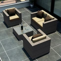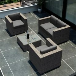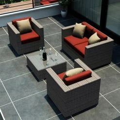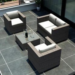 As soon as the Harmonia Living Urbana Conversation Set gets to your home, the forecast is going to predict perfect weather with a 100% chance of I-Might-Call-In-Sick-To-Work-Tomorrow. This posh seat features a pair of club chairs with a matching loveseat that is tied perfectly together with a high-fashion, low-slung coffee table. This set is ideal for any climate thanks to the frames of heavy-duty, rust-proof aluminum with a powder-coated finish to give you a robust structure that’s resistant to weathering and corrosion. On top of that frame is a woven exterior of resin wicker, a material that has the look and texture of authentic wicker while being made from high-density polyethylene (HDPE). This all-weather material is completely resistant to rot, moisture, and cracking and is offered in a number of subtle colors that gives it a natural appearance. The chair and loveseat both have 5-inch-thick seat cushions and 6-inch-thick back cushions, all of which have a center of Dacron-wrapped foam with a removable Sunbrella fabric cover. This UV-resistant material is designed for outdoor use and offered in your choice of available colors. The matching coffee table is topped with a single sheet of shatter-resistant glass. This isn’t the only piece in the Harmonia Living Urbana collection, so if it’s a look that appeals to you, take some time to see the other pieces that we have available.