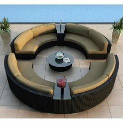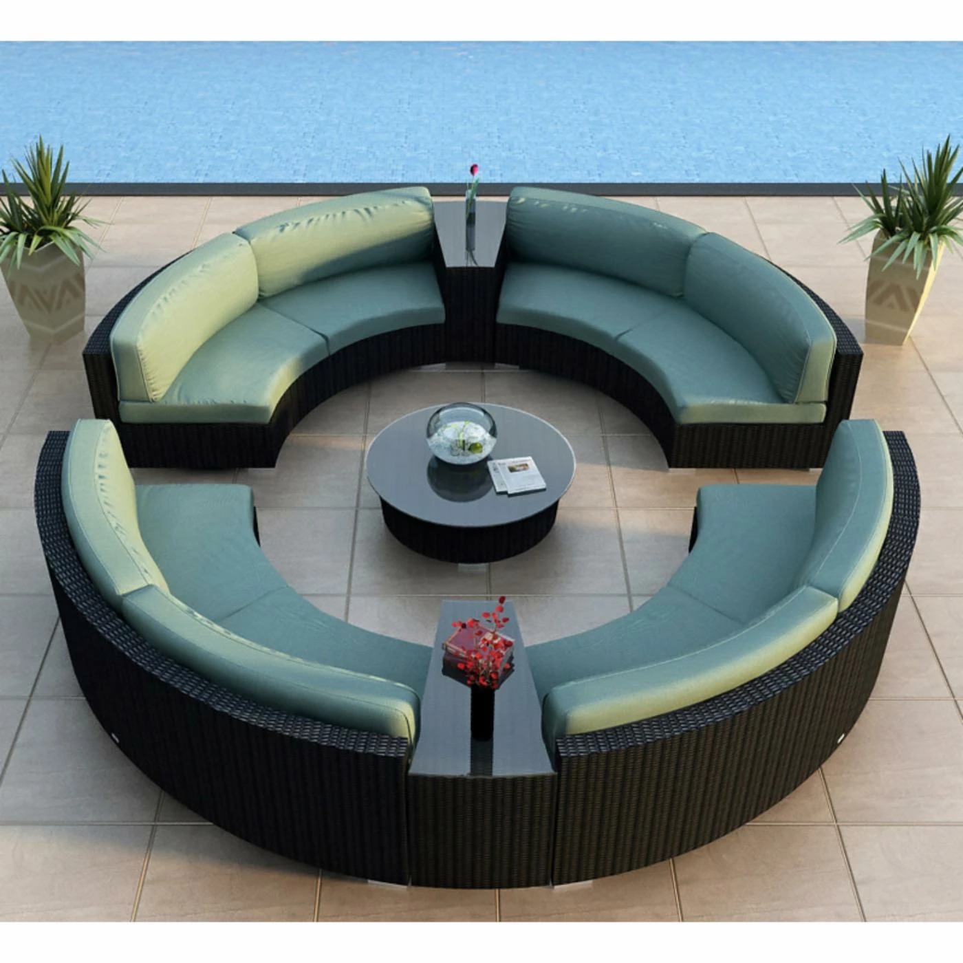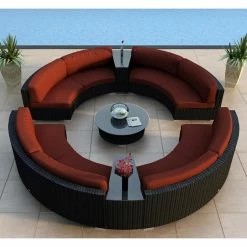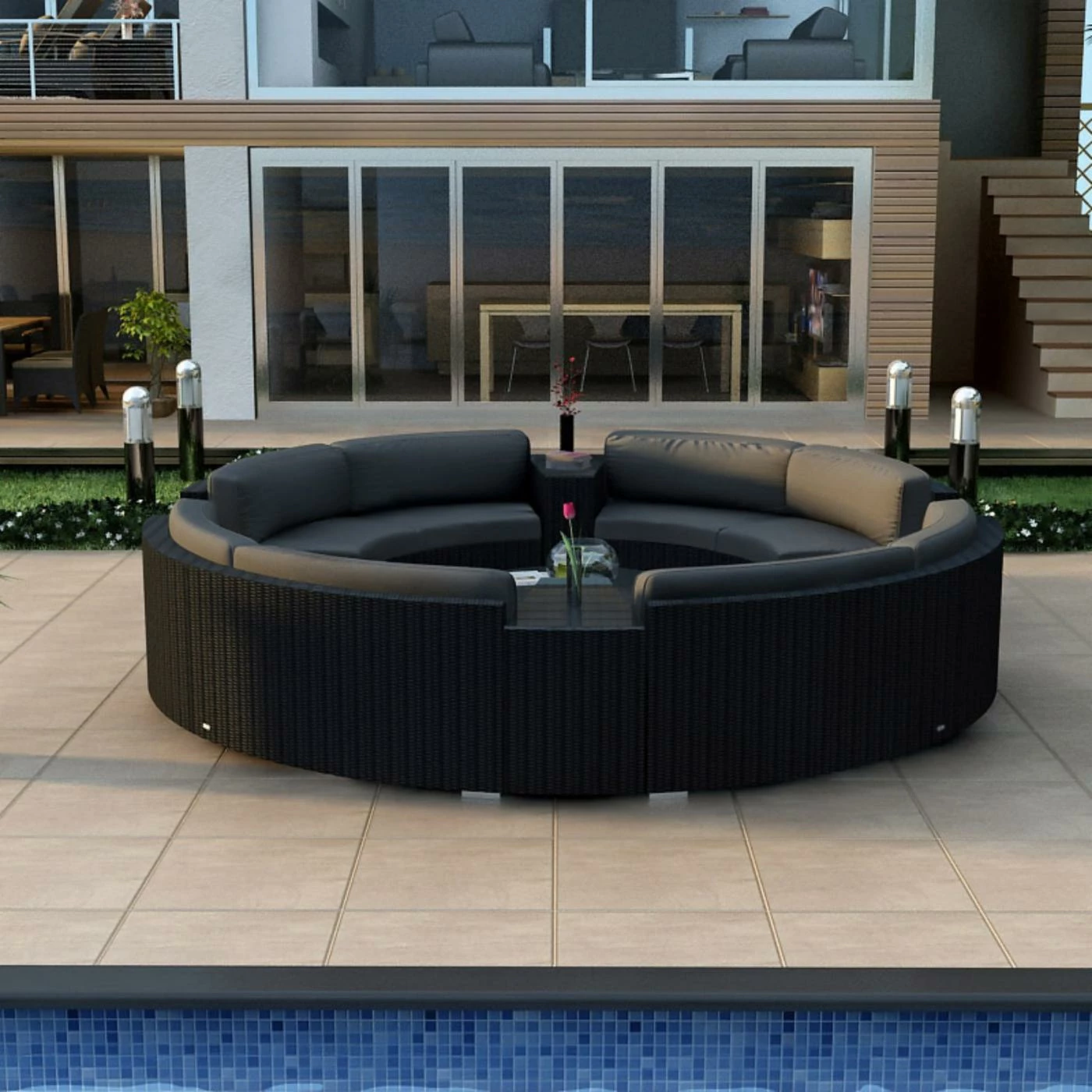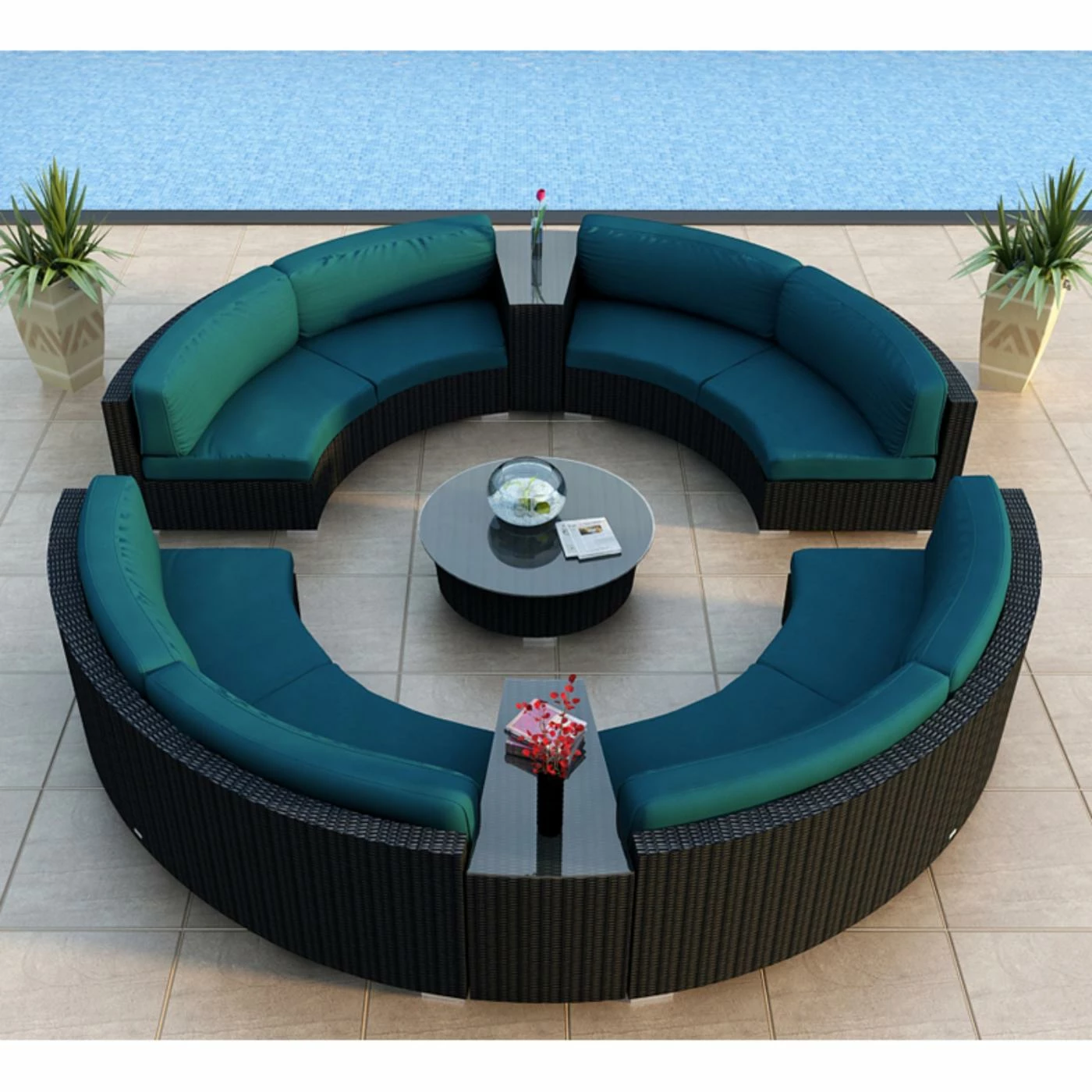 Big gathering or small, nested together or placed apart, the Harmonia Living Urbana Resin Wicker 7 Piece Patio Conversation Set is an essential for your outdoor living area. It comes complete with four curved loveseats, two wedge end tables, and a round coffee table. Each piece features a thick-gauge aluminum frame with a corrosion-resistant powder coating. Woven over it, the high-density polyethylene wicker is all weather, recyclable, and infused with UN inhibitors to keep its coffee bean color from fading or cracking. All tables come equipped with clear tempered glass tops, and the cushions are specially designed for those long hangouts. They’re crafted of fade-resistant Sunbrella fabric in a selection of available color options, and their zippered covers are a breeze to remove. Inside, the quick-dry polyurethane foam padding is wrapped in Dacron to keep moisture and mildew away.