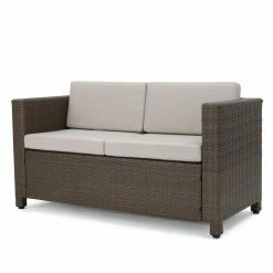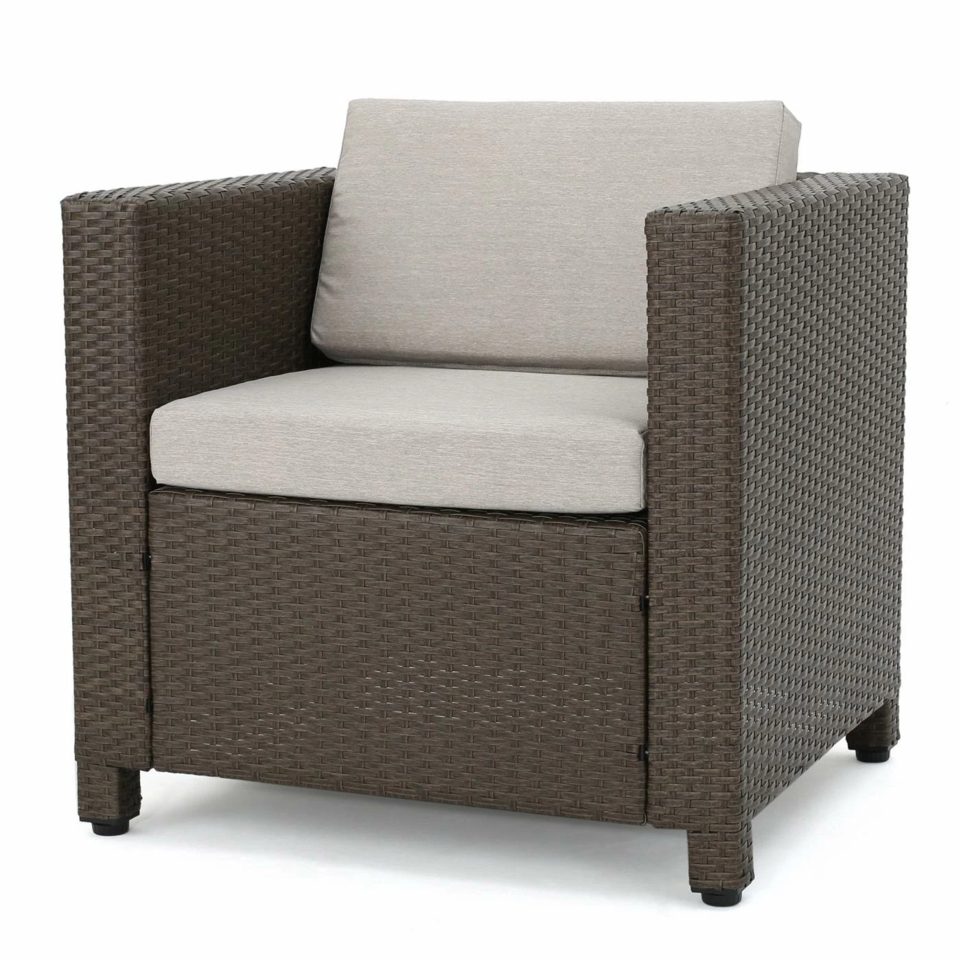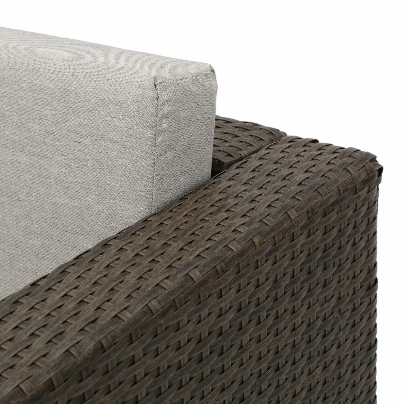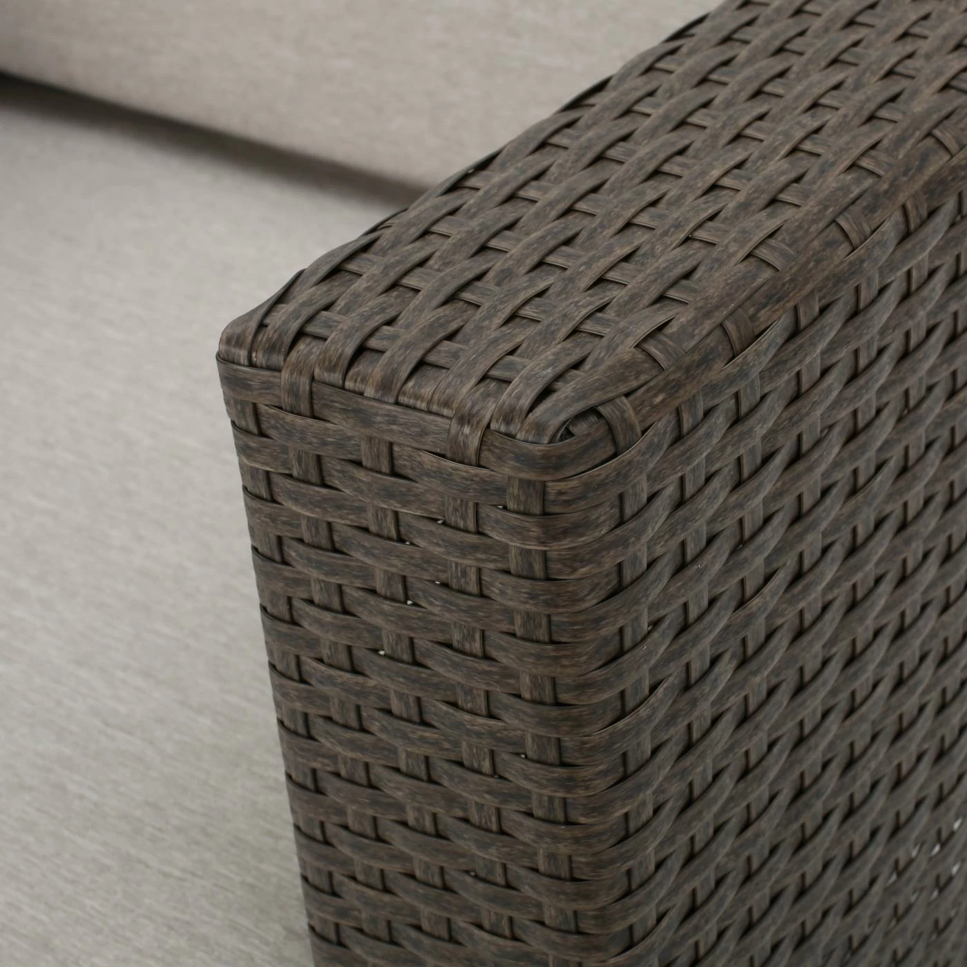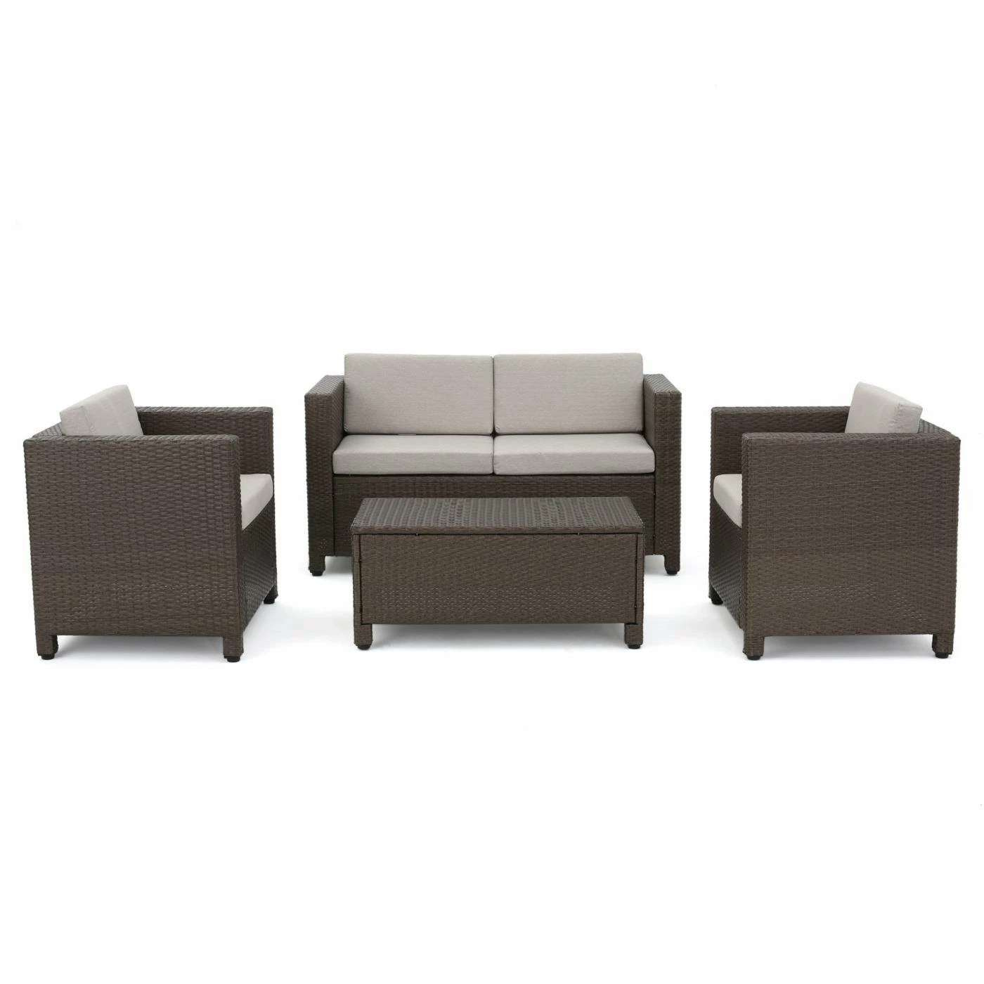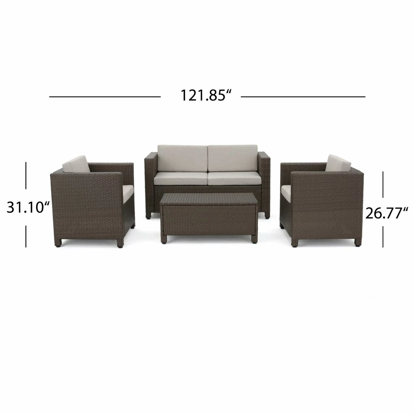 Design an outdoor chat area as comfortable and stylish as your indoor space with this HN Outdoor Alameda 4 Piece Patio Wicker Chat Set. This four-piece patio chat set includes two cushioned club chairs, a cushioned loveseat for two, and a handy coffee table. Sturdy frames feature a shelter style design with arms in line with the backs. They’re wrapped in brown, all-weather polyethylene rattan wicker. Seating options are graced with quick-dry cushions in a neutral ceramic gray.
