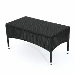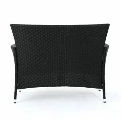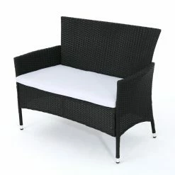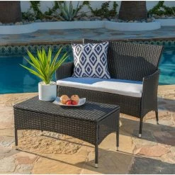 Cozy up with a good book and a glass of tea with the HN Outdoor Page Wicker 2 Piece Loveseat and Coffee Table Set. The iron frames of the loveseat and table are wrapped in polyethylene wicker with a black finish. A white finish on the feet of each piece adds stylish interest. This set also includes a polyester fabric seat cushion in white.