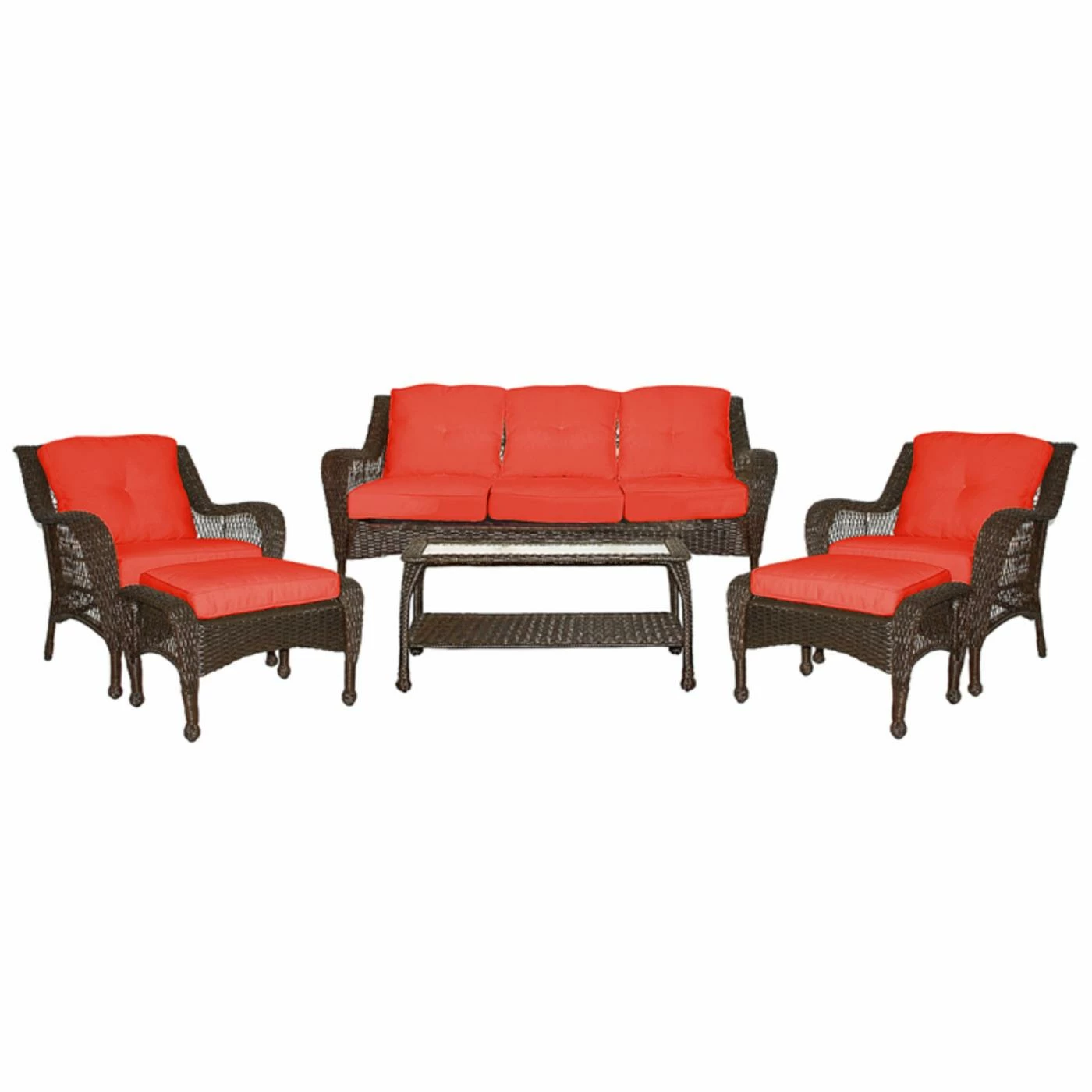 The Jeco 6-Piece All-Weather Wicker Conversation Set offers antique charm and modern durability. Ideal for sun rooms, porches, and patios, this set beckons you to relax with a beverage in hand. Outfitted with thick cushions, you wonβt want to get up!