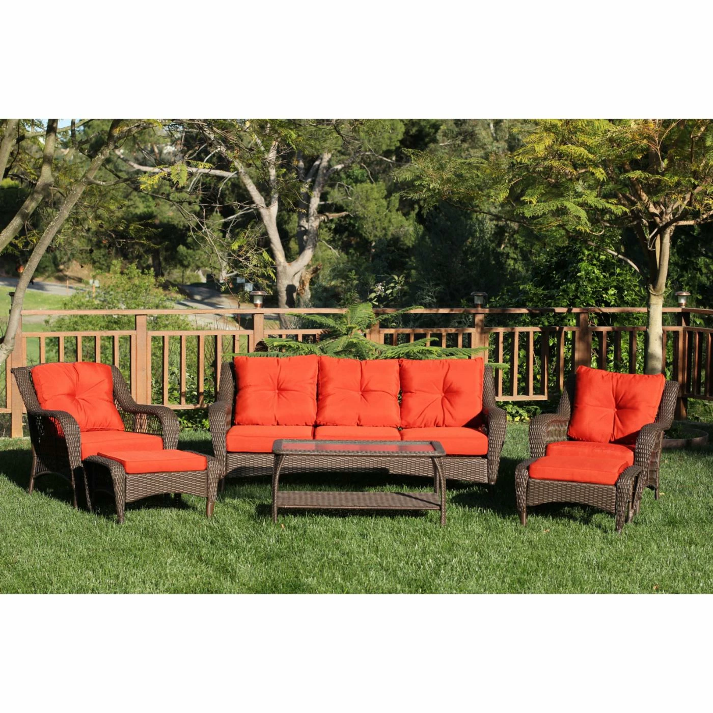 - Includes sofa, 2 chairs, 2 ottomans, and coffee table