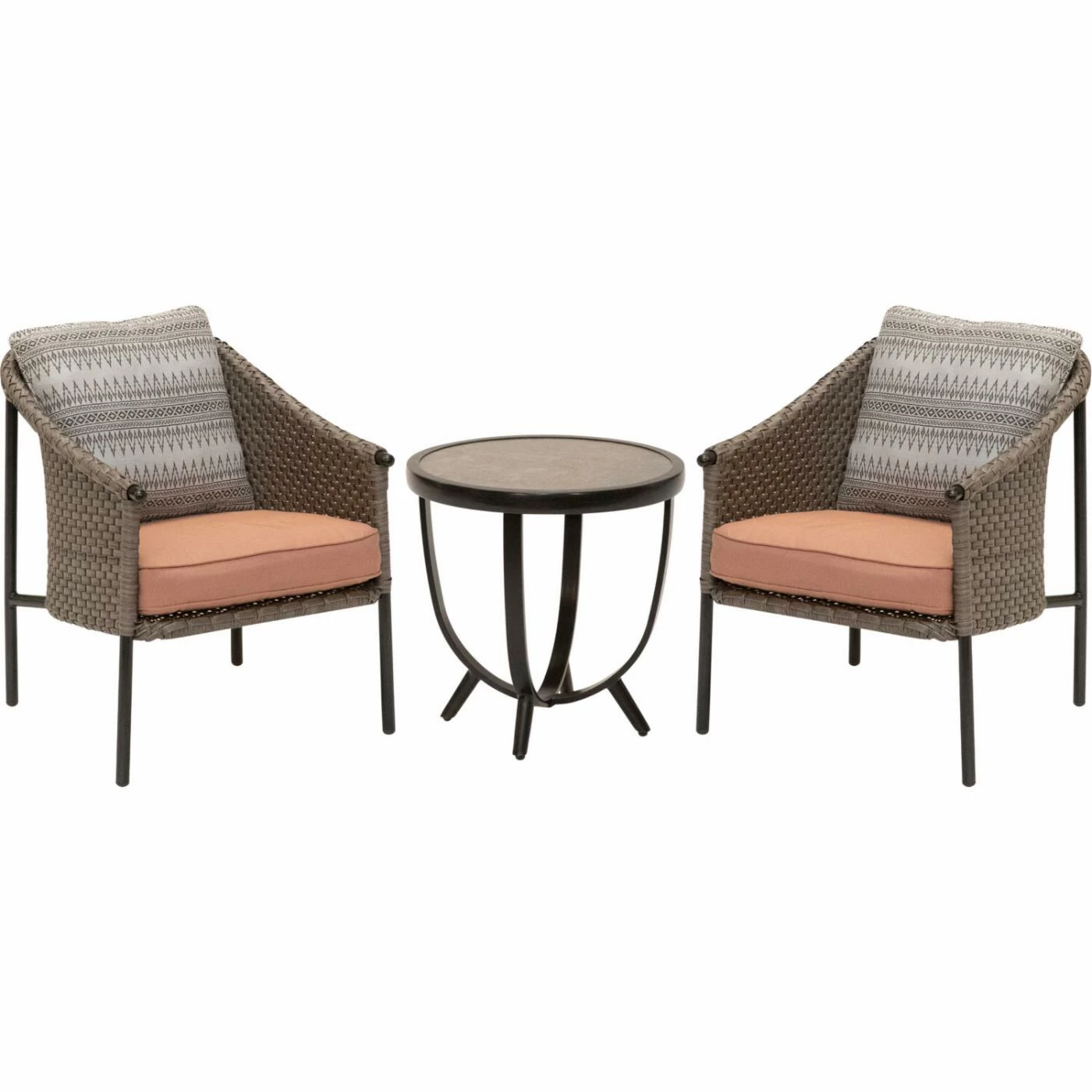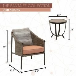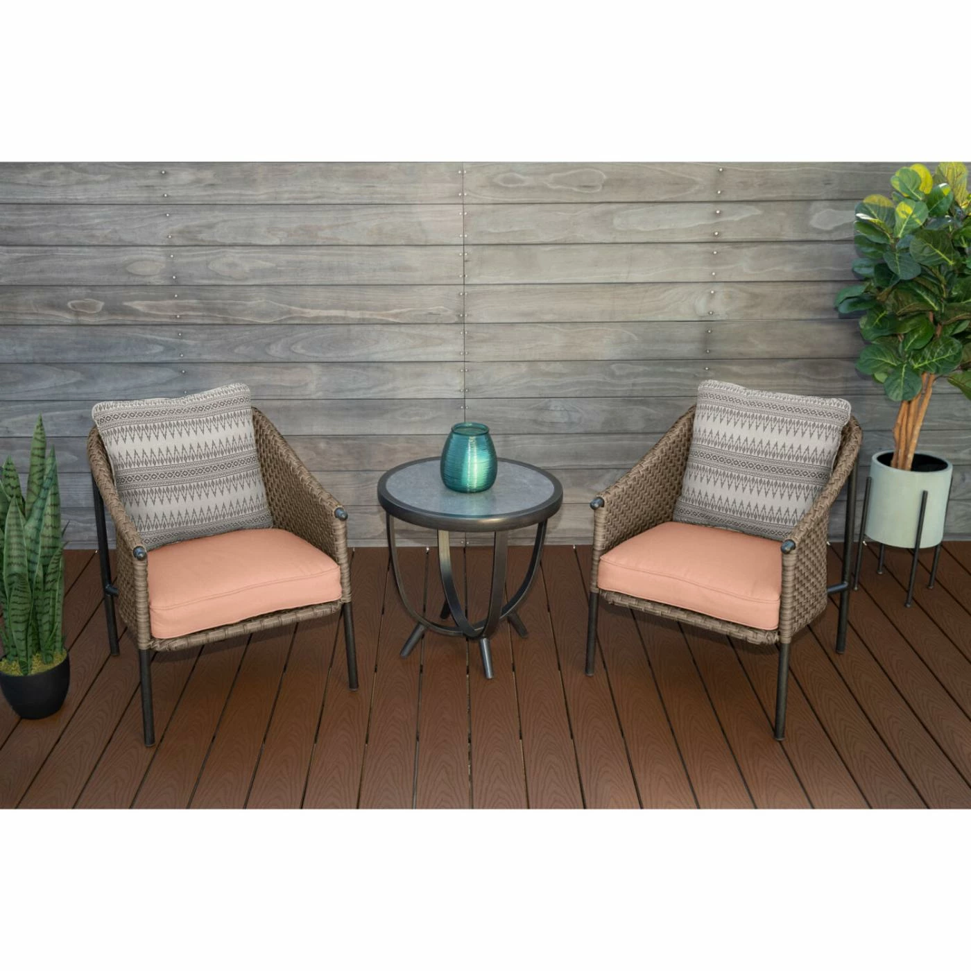 Feel like youβre on a weekend escape to Joshua Tree (minus the desert temperatures) with the Mod Furniture Santa Fe 3 Piece Resin Wicker Patio Chat Set. Enjoy relaxing, drink in hand, in the boho-chic bucket chairs with a friend. They provide comfortable support and impeccable design, thanks to the two-tone gray handwoven wicker combined with plush cushions and pillows. The thick foam cushions are covered in a dreamy desert rose-colored fabric and topped with plush accent pillows dressed in a tapestry-inspired geometric pattern. Rounding out the collection is the porcelain-top drum accent table, perfect for snacks, drinks or a potted decorative cactus to add to the desert vibes. The chairs and table are made from sturdy aluminum frames, covered with dark mocha brown powder coating to extend protection against rust, scratches, and UV harm. This space-saving set is compact and convenient enough to fit on the smallest of patios but brings big-time style.