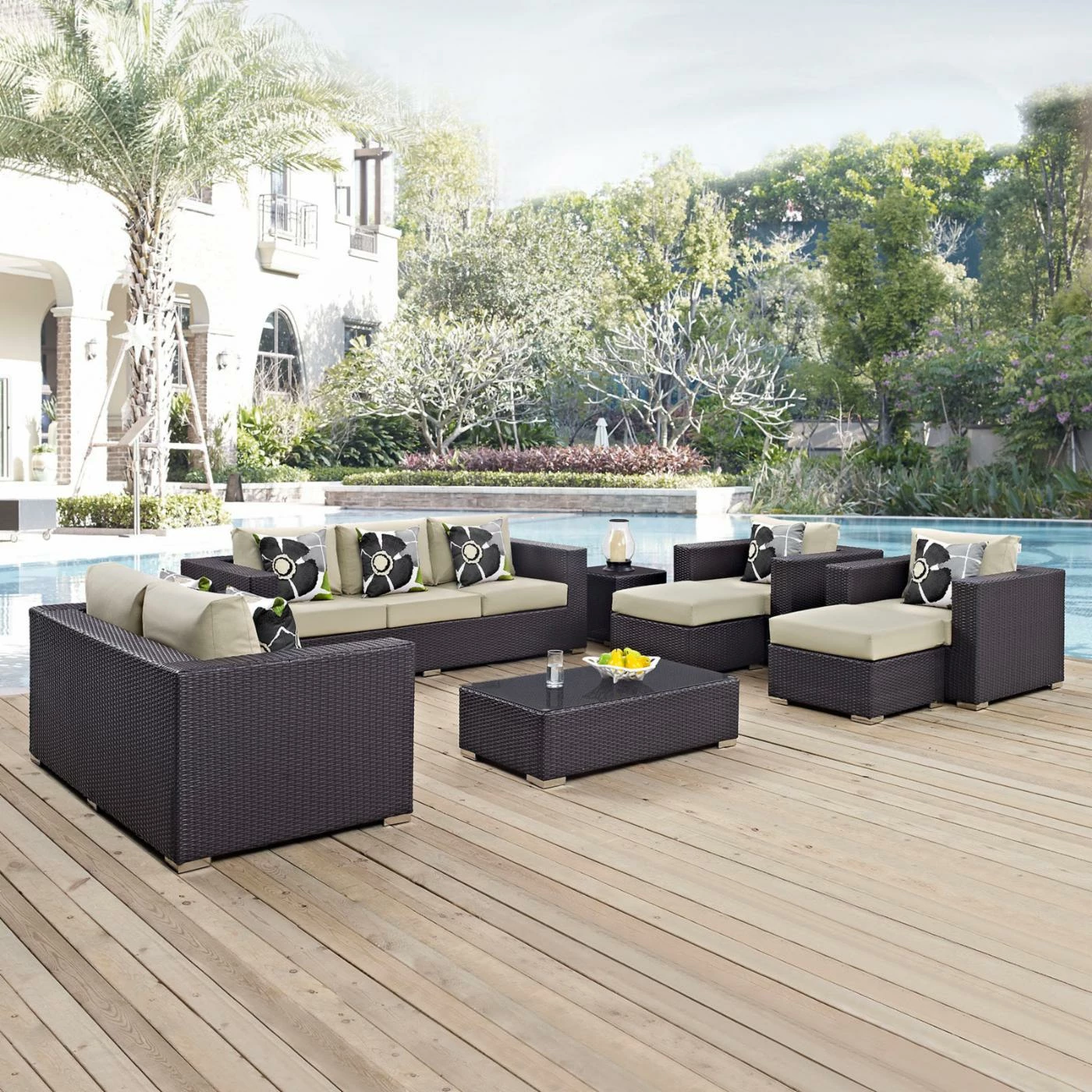 Talk about a sweet setup – the Modway Convene 9 Piece Outdoor Patio Conversation Set includes oodles of outdoor living pieces you can configure in a variety of ways. The outdoor living set includes a sofa, loveseat, two armchairs, two square ottomans, one rectangular ottoman, and two side tables with easy-clean tempered glass tops. Each piece is crafted of powder-coated aluminum woven with espresso-colored synthetic rattan for a design that’s water- and UV-resistant. Available in a choice of color, the polyester cushion covers remove for easy machine washings. And because it ships pre-assembled, you’ll be enjoying this patio conversation set as soon as it arrives.