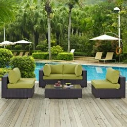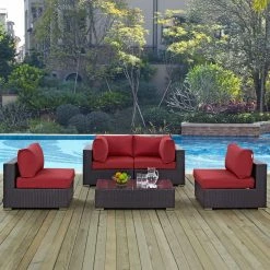 Able to be configured in a variety of ways, you’ll love arranging and rearranging the Modway Convene Wicker 5 Piece Patio Conversation Set with Cushion to suit your taste. Strong and durable, each piece has a powder-coated aluminum frame covered in synthetic rattan weave finished in espresso to create a warm and inviting atmosphere. Plush, luxurious, and all-weather cushions are perfect for sinking into after a long day and also machine washable for your convenience. The cushions also come in a variety of colors so you can choose the perfect shade for your home. The included coffee table is great for holding drinks, plates, flowers, plants, and more. Relax with a book and your favorite cold drink while letting the stress of the day melt away or invite friends over and laugh and talk long after the sun has set. Sure to be favorite, this conversation set will look gorgeous for years to come.