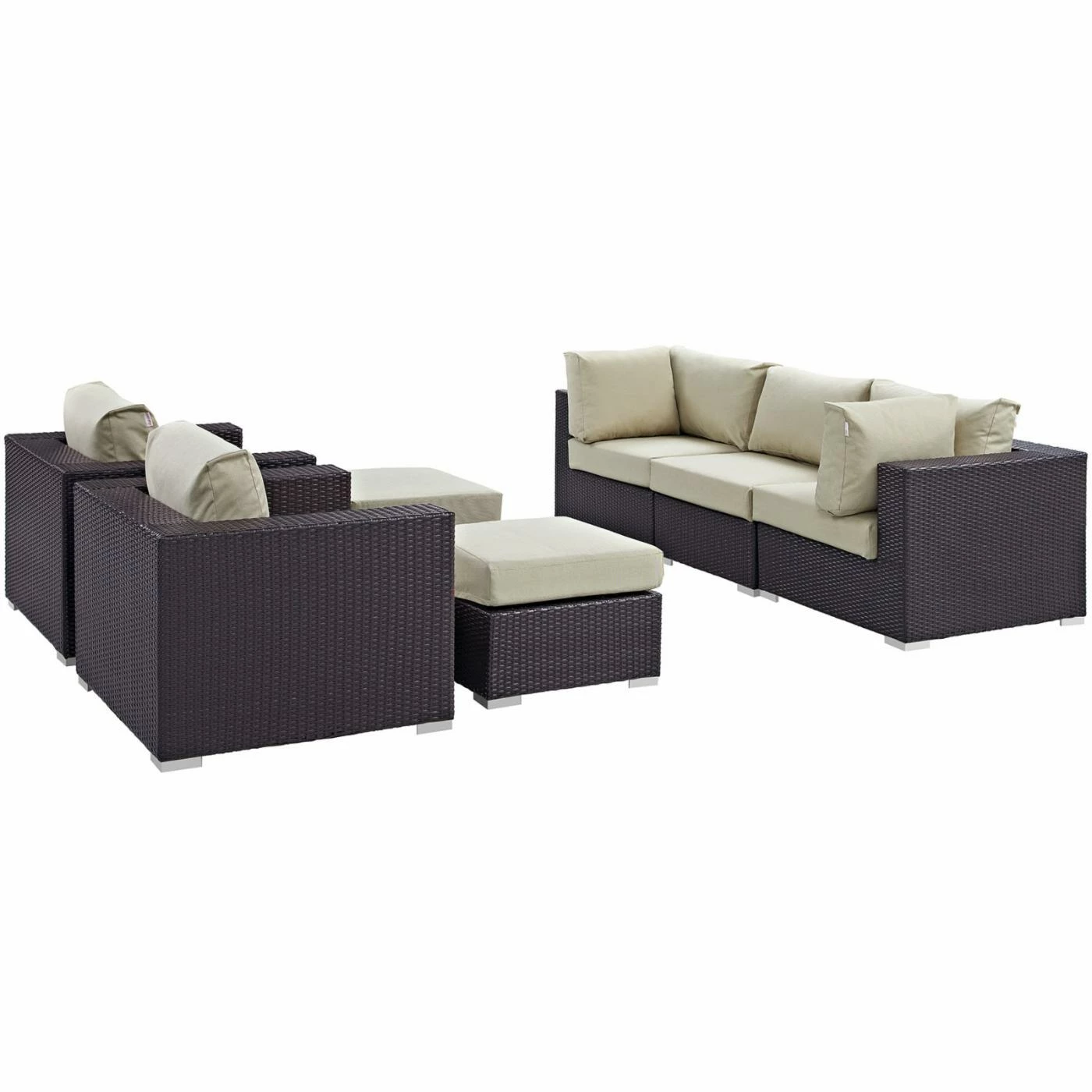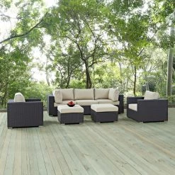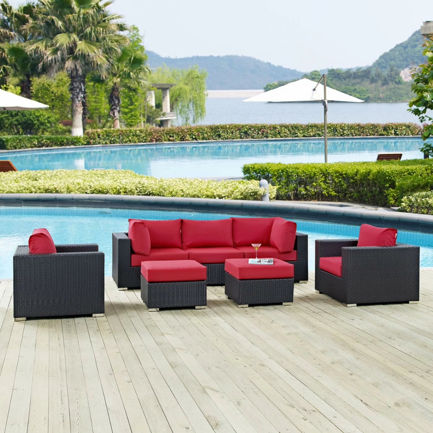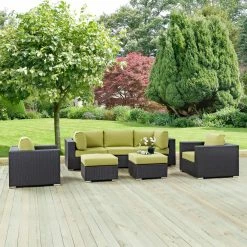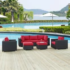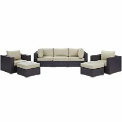 You’ll love the bold elegance of the Modway Convene Wicker 7 Piece Patio Conversation Set with Ottoman. Strong and durable, each piece has a powder-coated aluminum frame covered in synthetic rattan weave finished in espresso to create a warm and inviting atmosphere. Plush, luxurious, and all-weather cushions are perfect for sinking into after a long day and also machine washable for your convenience. The cushions also come in a variety of colors so you can choose the perfect shade for your home. Put your feet up on the ottoman, relax with a book and your favorite drink while letting the stress of the day melt away or invite friends over and laugh and talk long after the sun has set. Sure to be favorite, this conversation set will look gorgeous for years to come.
