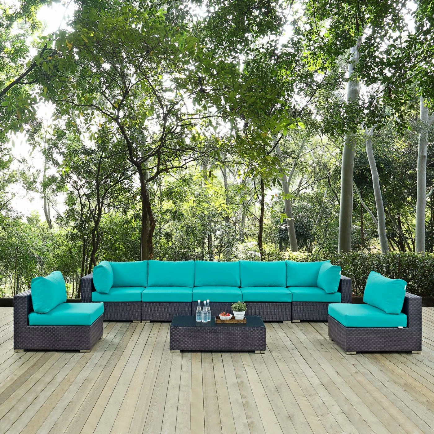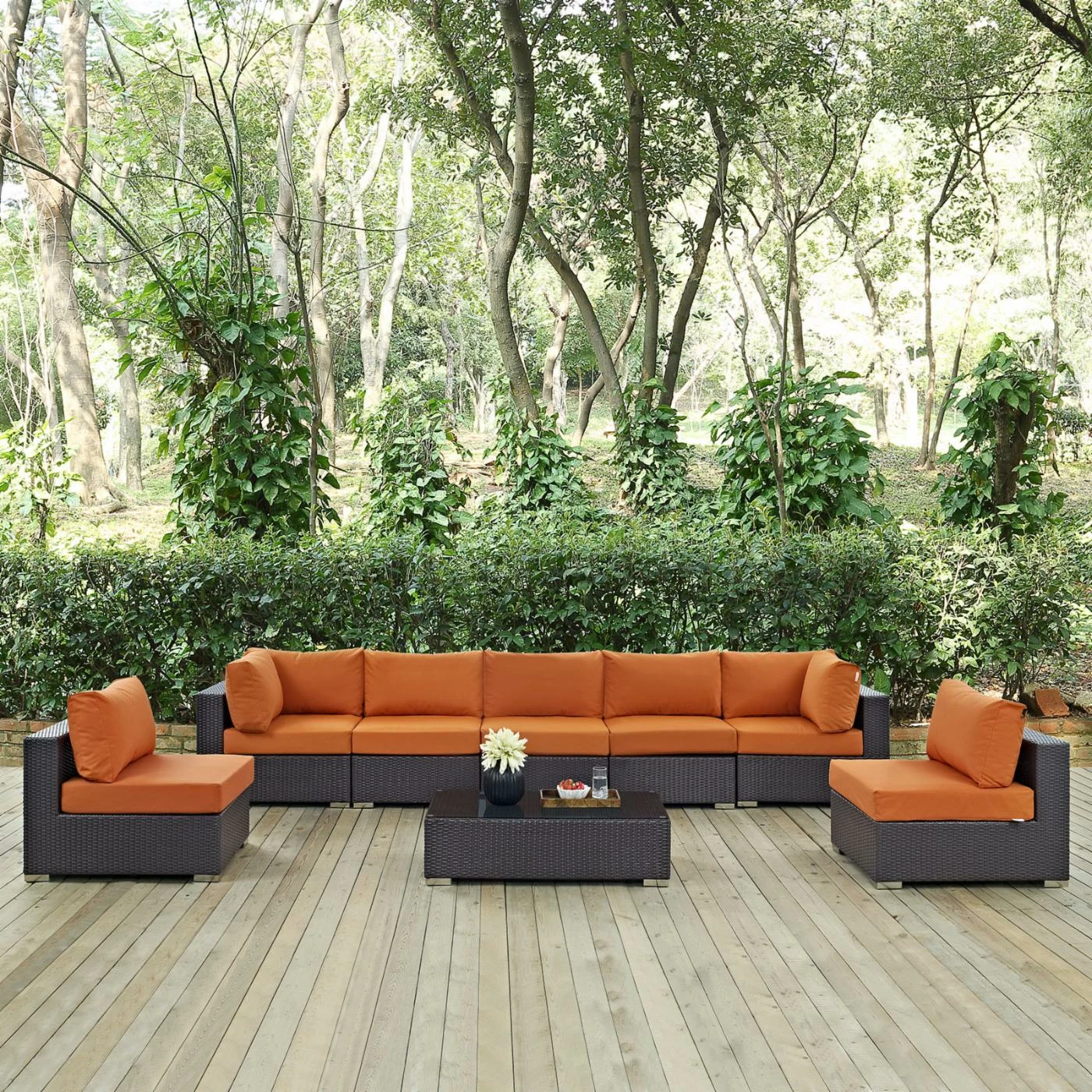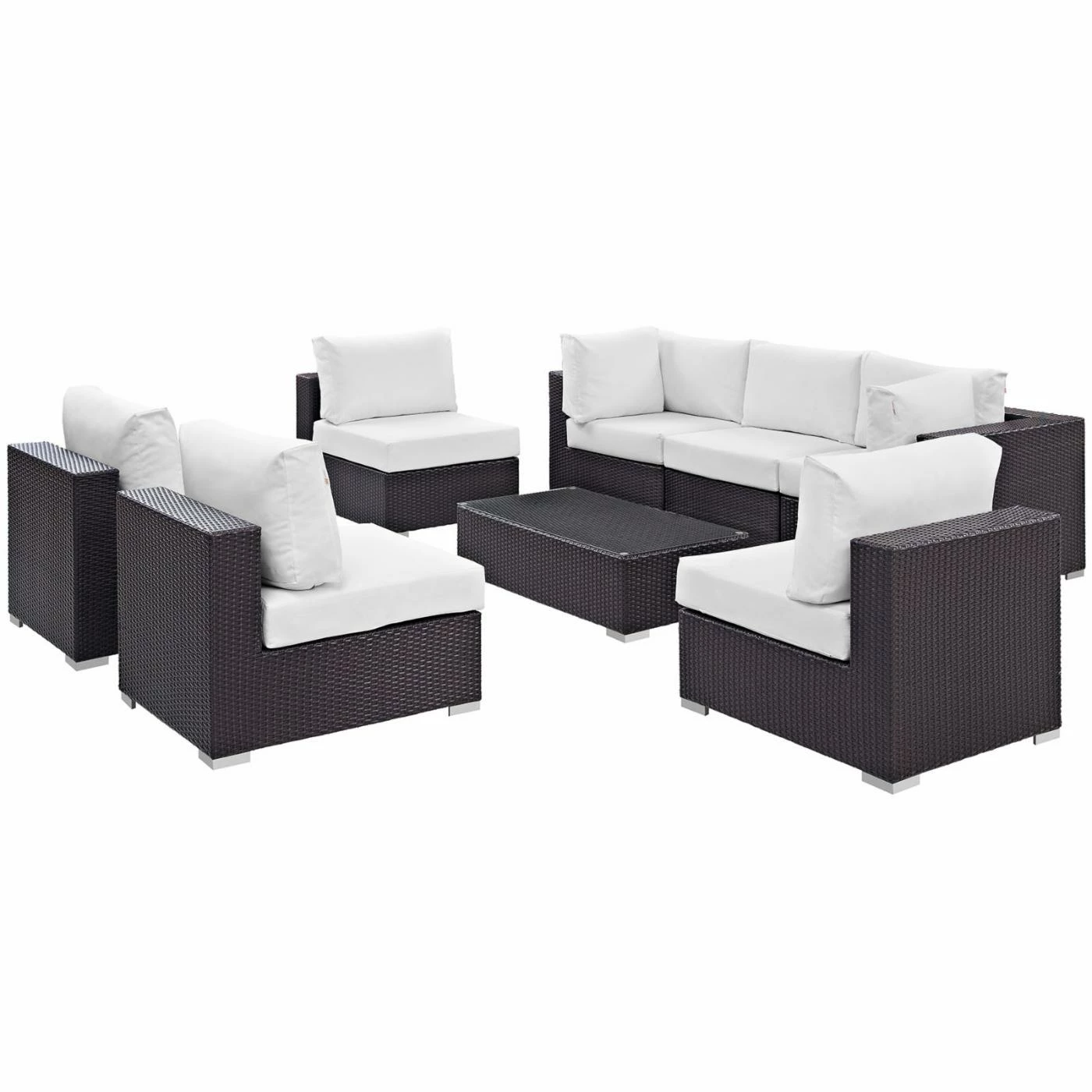 Spend your days outdoors enjoying the sun and warm weather with the Modway Convene Wicker 8 Piece Patio Conversation Set. Made to fit a wide variety of outdoor spaces, this set features a modular design which gives you multiple configuration options. Strong and durable, each piece has a powder-coated aluminum frame covered in synthetic rattan weave finished in espresso to create a warm and inviting atmosphere. Plush, luxurious, and all-weather cushions are perfect for sinking into after a long day and also machine washable for your convenience. The cushions come in a variety of colors so you can choose the perfect shade for your home. The beautiful coffee table has a tempered glass top and is great for holding drinks, plates, flowers, plants, and more. Put your feet up on the ottoman, relax with a book and your favorite drink while letting the stress of the day melt away or invite friends over and laugh and talk long after the sun has set. Sure to be favorite, this conversation set will look gorgeous for years to come.