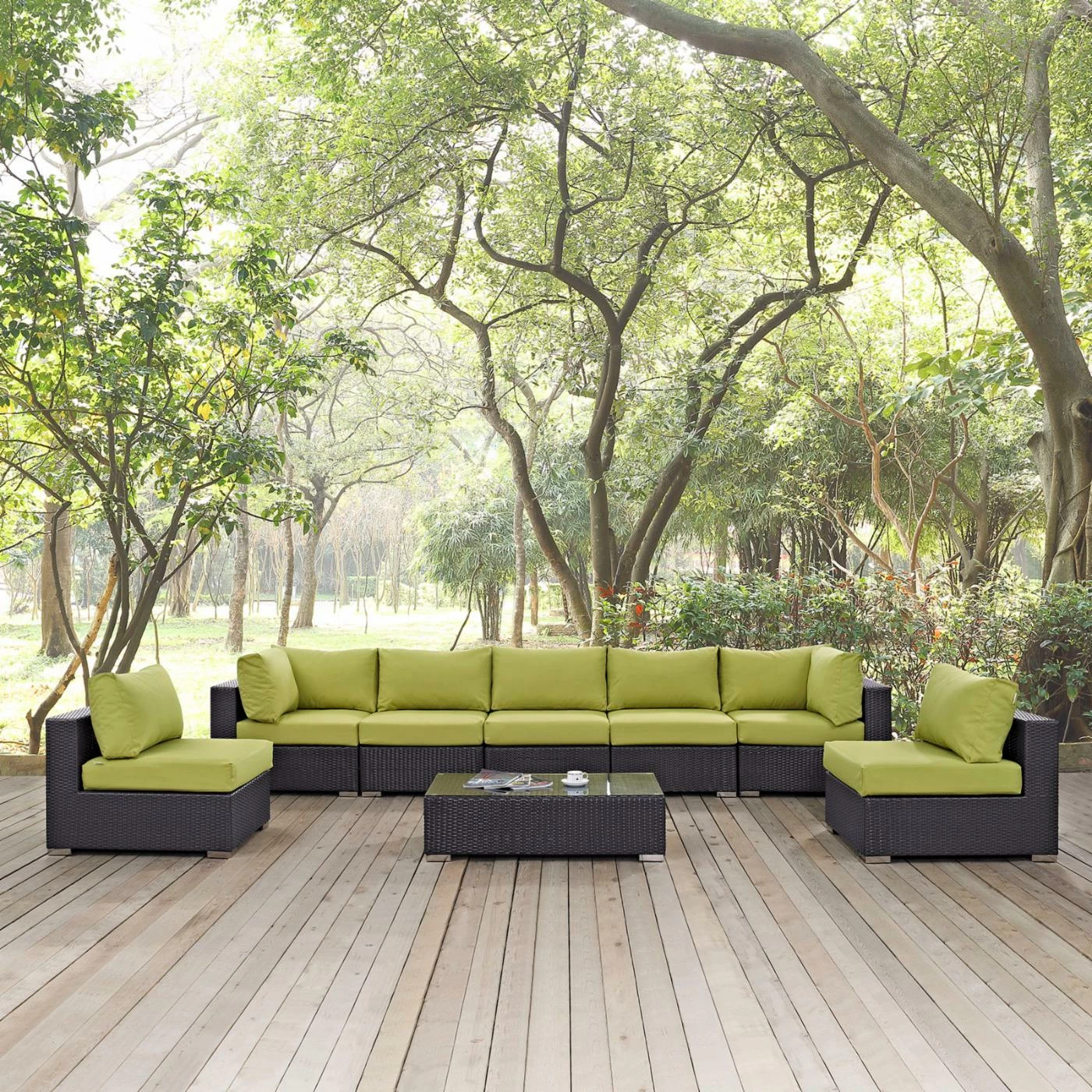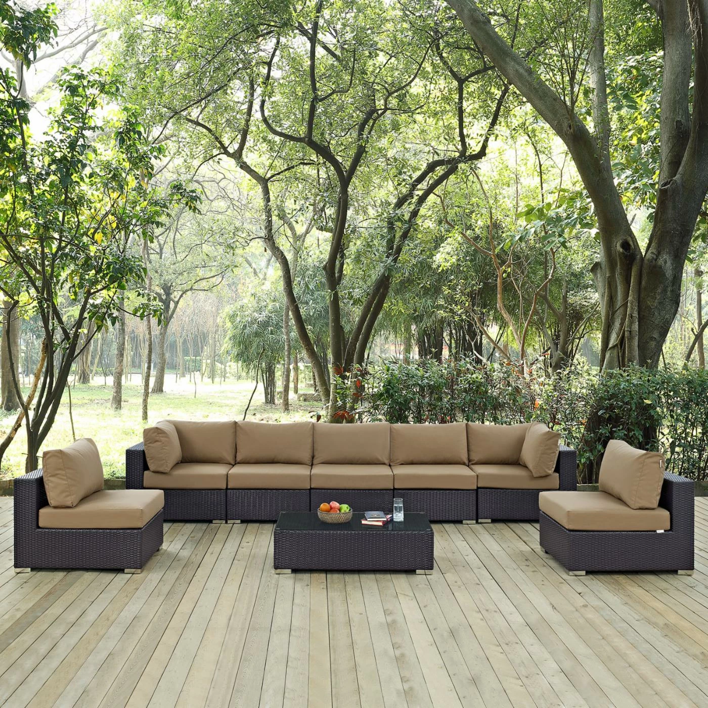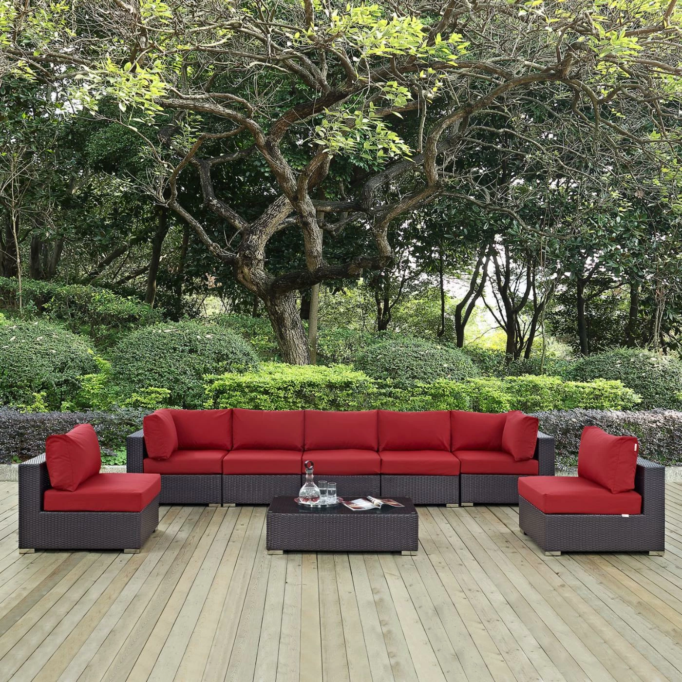 Spend your days outdoors enjoying the sun and warm weather with the Modway Convene Wicker 8 Piece Patio Conversation Set. Made to fit a wide variety of outdoor spaces, this set features a modular design which gives you multiple configuration options. Strong and durable, each piece has a powder-coated aluminum frame covered in synthetic rattan weave finished in espresso to create a warm and inviting atmosphere. Plush, luxurious, and all-weather cushions are perfect for sinking into after a long day and also machine washable for your convenience. The cushions come in a variety of colors so you can choose the perfect shade for your home. The beautiful coffee table has a tempered glass top and is great for holding drinks, plates, flowers, plants, and more. Put your feet up on the ottoman, relax with a book and your favorite drink while letting the stress of the day melt away or invite friends over and laugh and talk long after the sun has set. Sure to be favorite, this conversation set will look gorgeous for years to come.