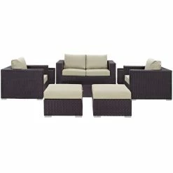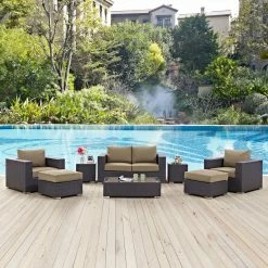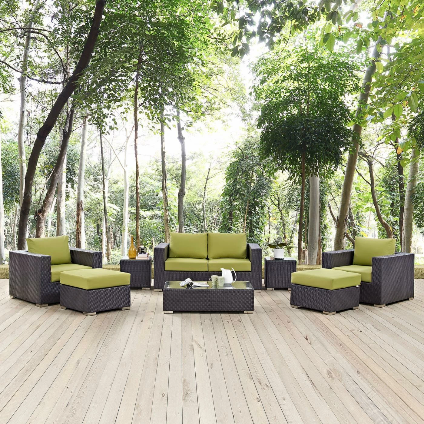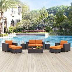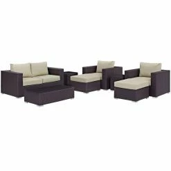 You’ll spend all summer outside with the Modway Convene Wicker 8 Piece Sofa Patio Conversation Set. Strong and durable, each piece has a powder-coated aluminum frame covered in synthetic rattan weave finished in espresso to create a warm and inviting atmosphere. Plush, luxurious, and all-weather cushions are perfect for sinking into after a long day and also machine washable for your convenience. The cushions come in a variety of colors so you can choose the perfect shade for your home. The included coffee table and end tables are great for holding drinks, plates, flowers, plants, and more. Put your feet up on the ottoman and sip on our favorite cold drink while letting the stress of the day melt away or invite friends over and laugh and talk long after the sun has set. Sure to be favorite, this conversation set will look gorgeous for years to come.