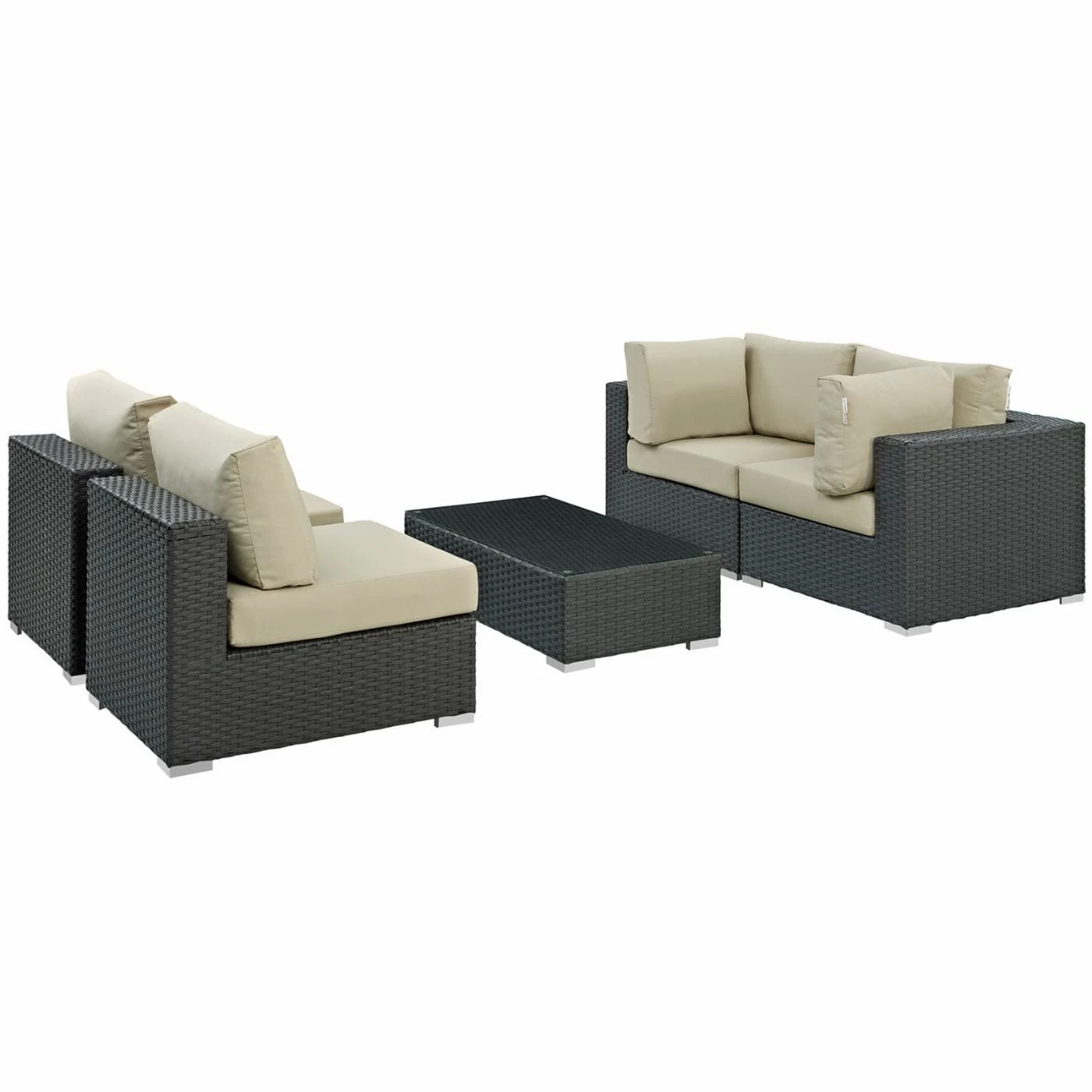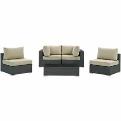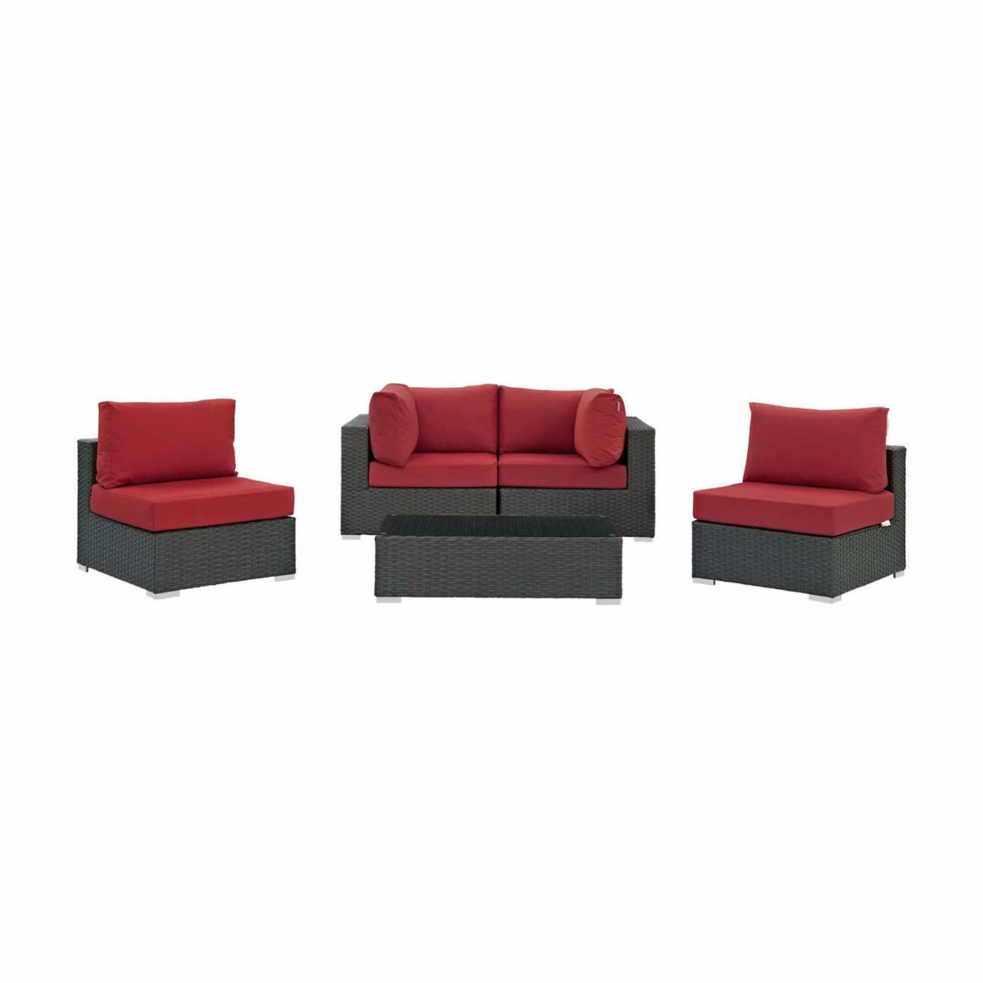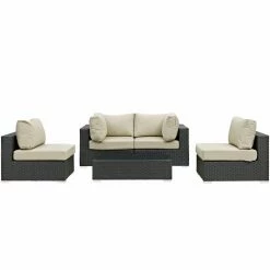 The Modway Sojourn Wicker 5 Piece Patio Conversation Set with Sunbrella Cushion is the kind of high-end outdoor set that may have you start using summer as a verb. For example, this year, you’ll be summering either in the Hamptons, or on this posh, all-weather set. This comfy collection of outdoor pieces offers you a high-end option for your fresh-air relaxing, and it’s designed to withstand the elements for years to come. Each piece starts with a lightweight frame of strong, rust-proof aluminum that provides the squared, modern design. The exterior of woven resin wicker has the look and feel of traditional wicker, but its synthetic makeup allows it to resist rot, cracking, and UV-related fading while it lives outdoors. Each chair and loveseat are outfitted with five-inch thick foam cushions covered in your choice of all-weather Sunbrella fabric. Sunbrella textiles are designed specifically for a life outdoors, so you can be sure that they’ll look their best, year after year. A low coffee table is topped with a thick piece of shatter-resistant glass for a surface that’s practical and easy to maintain.