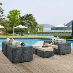 Summon oodles of fun to your porch or patio this summer with the aptly named Modway Summon 5 Piece Sunbrella Outdoor Patio Conversation Set. The water- and UV-resistant design features powder-coated aluminum frames woven with synthetic rattan in a two-tone gray with slightly rounded corners. The industry-leading Sunbrella cushions are available in a choice of color, and their removable covers are machine washable. The set includes a loveseat, two arm chairs, and two ottomans that can also double as side tables. Arrives pre-assembled.