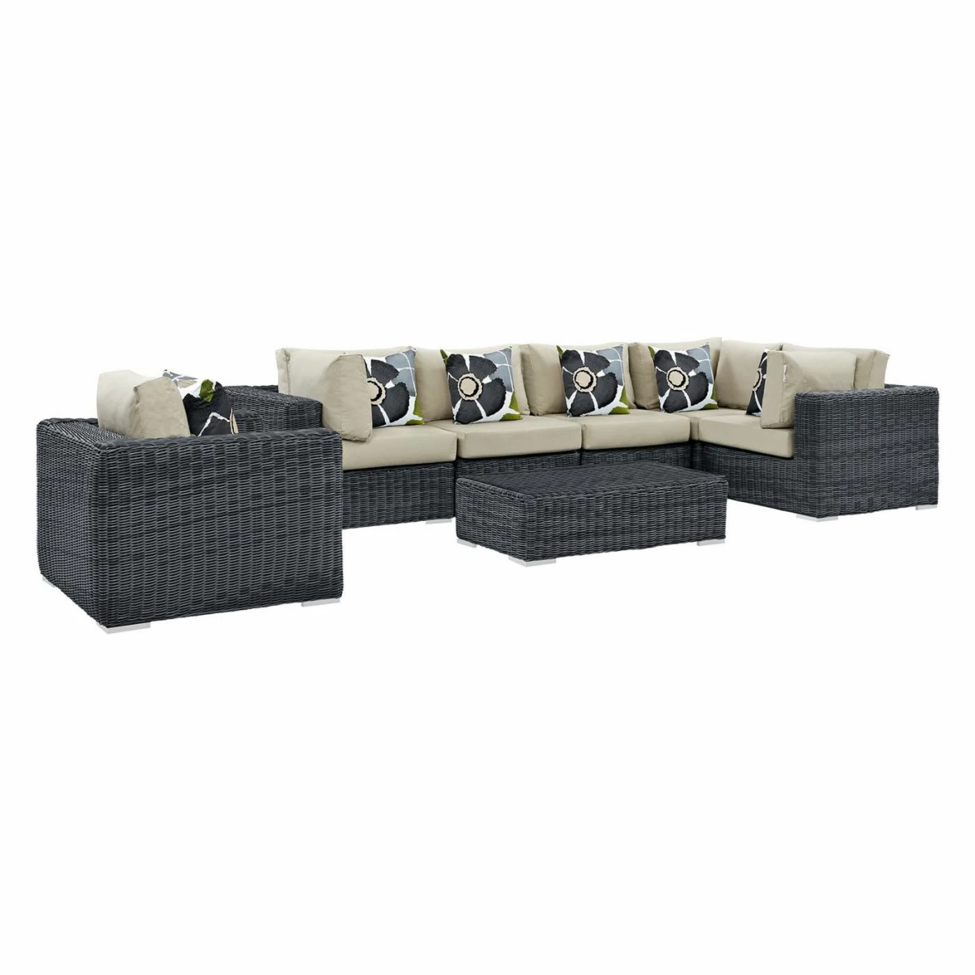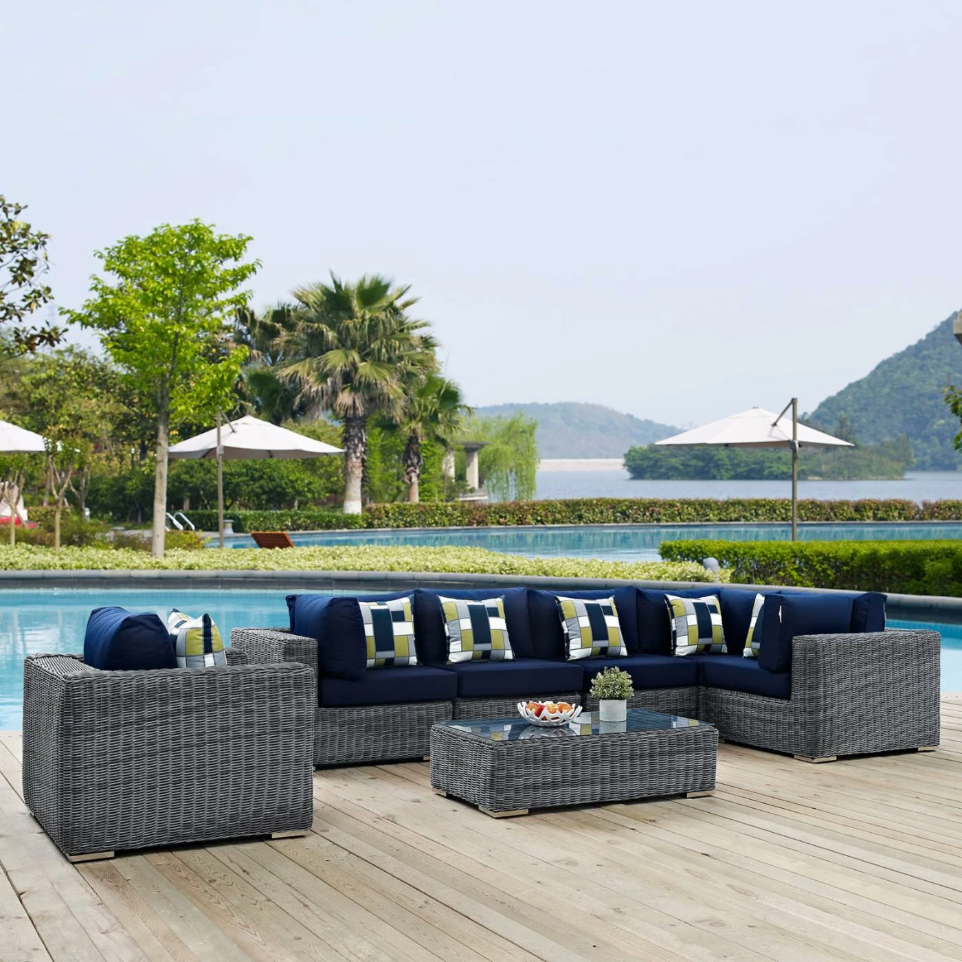 Set the scene for hours of outdoor fun with the Modway Summon 7 Piece Sunbrella Outdoor Patio Sectional Conversation Set. Two arm sections, two armless sections, and a corner section form a sectional you can configure as you please, and the patio set also includes an arm chair and coffee table with a tempered glass top. The powder-coated aluminum frames are woven with synthetic rattan in a two-tone gray, and the Sunbrella cushions are available in a choice of color. The cushion colors remove for easy machine washing, and you’ll love how this patio conversation set is built tough with water- and UV-resistant construction. Arrives pre-assembled.