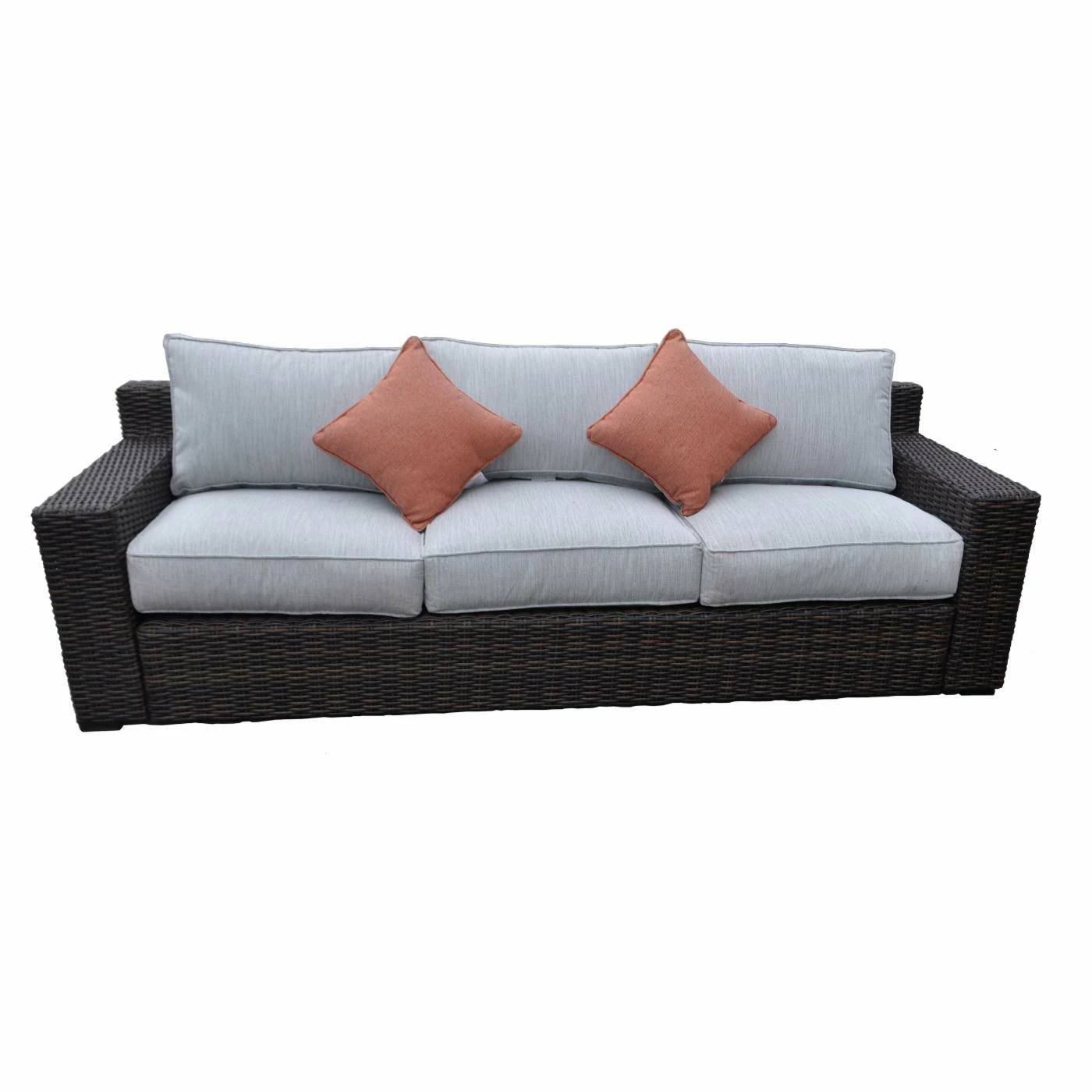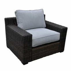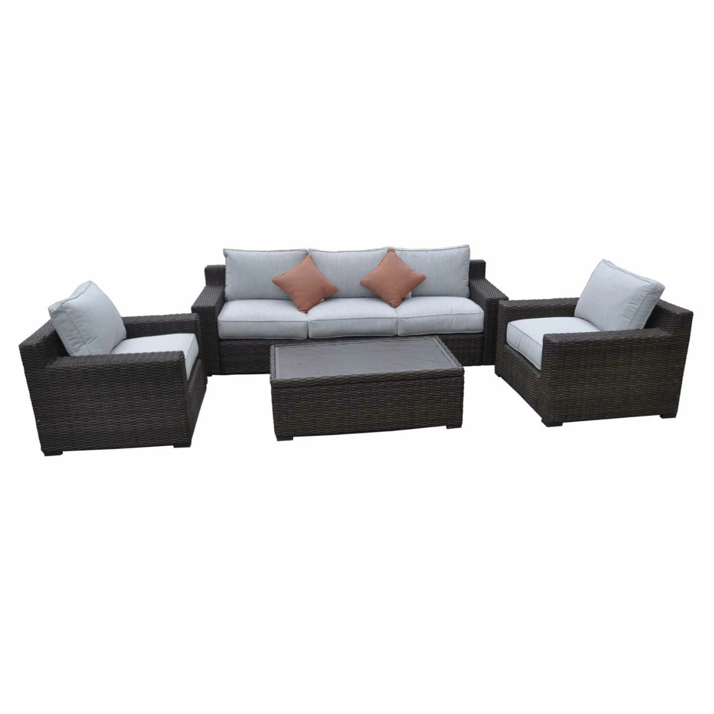 The Paradise Cove Designs Eva Wicker 4 Piece Deep Seating Patio Conversation Set will have you discovering the great outdoors. The wicker sofa and lounge chairs are softened with all-weather Nuvella cushions, as well as two throw pillows on the loveseat. Frame is made of aluminum and covered with resin wicker. This versatile set includes a sofa, 2 armchairs, and a glass-top coffee table. This conversation set is rust-free, with material that is also weather, fade, and heat resistant. The rich, natural color dark brown of the wicker will fit with any nearby landscape, plus the gray color cushions make the look come all together.