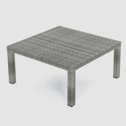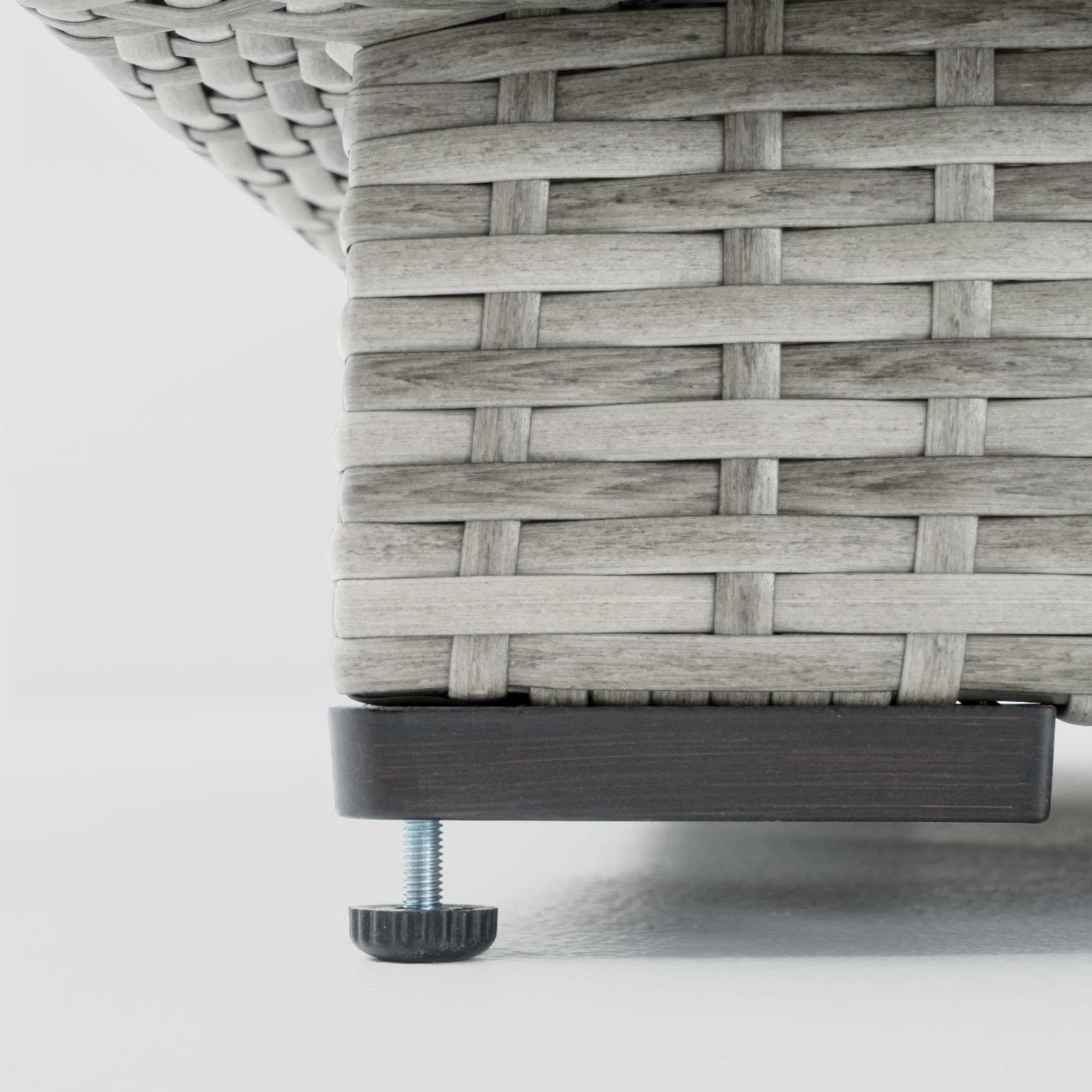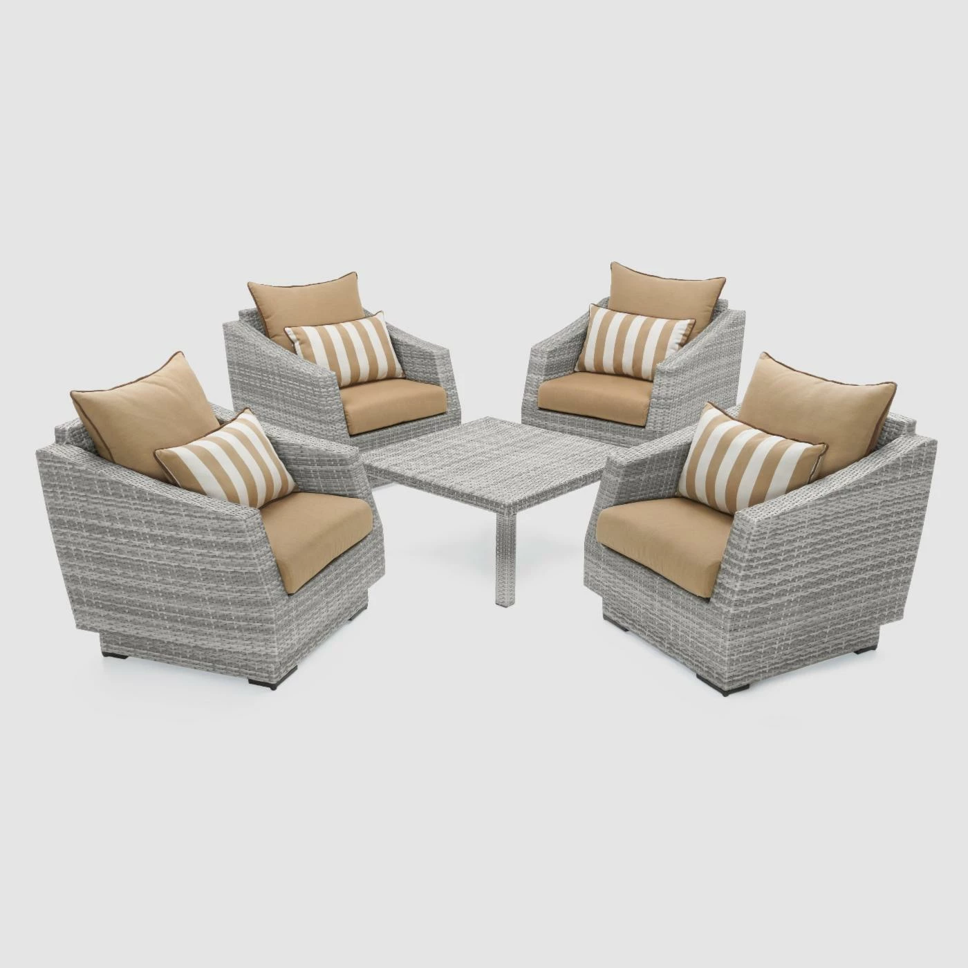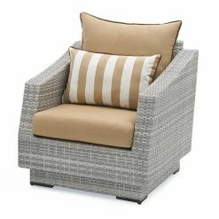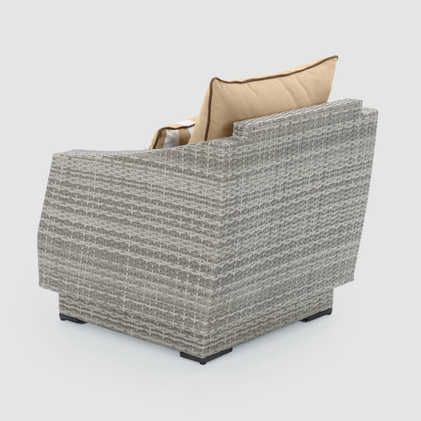 The deep seated comfort of the RTS Brands Cannes 5 Piece Club Chair and Coffee Table Conversation Set allows up to 4 people to relax comfortably outdoors in company. These contemporary pieces are constructed of durable weather resistant materials designed to last for years. Elegant, hand-woven wicker in a cool gray finish characterizes the Cannes Collection to create an elevated outdoor living space.