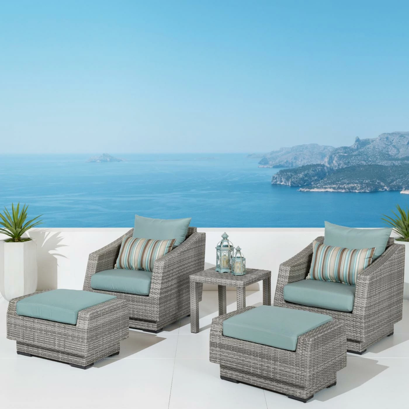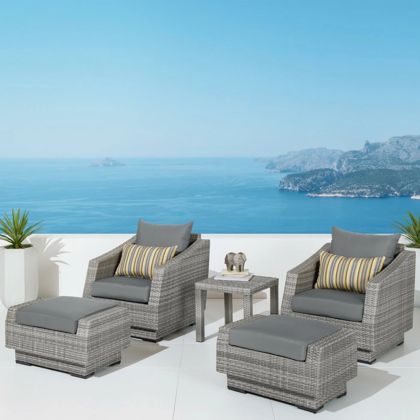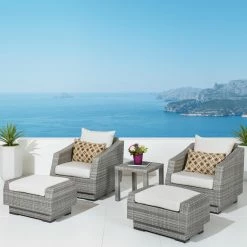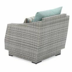 Relax in comfort and elegance while enjoying your favorite book, a glass of wine, or your first cup of coffee with the RST Outdoor Cannes Bliss 5 Piece Club Chair and Ottoman with Side Table. Beautifully designed, this sophisticated set is crafted from gorgeous, hand-woven polyethylene (PE) wicker over a strong, lightweight, and rust-resistant aluminum frame in a rich, powder-coated bronze color. Its elegant grey wicker is perfectly accented by the all-weather fabric cushion covers, available in a full range of colors. Made from breathable fabric that is easy to clean, these cushions are made to dry quickly to help avoid mildewing. UV-, fade-, and weather-resistant, this set is made to hold up great in salty and chlorinated environments, making it ideal for pool and seaside relaxing. PE wicker is cool to the touch, even in hot weather, making it a comfortable place to relax at anytime of the day. Made from 100% recyclable material, this set includes two chairs, two ottomans, and an end table.